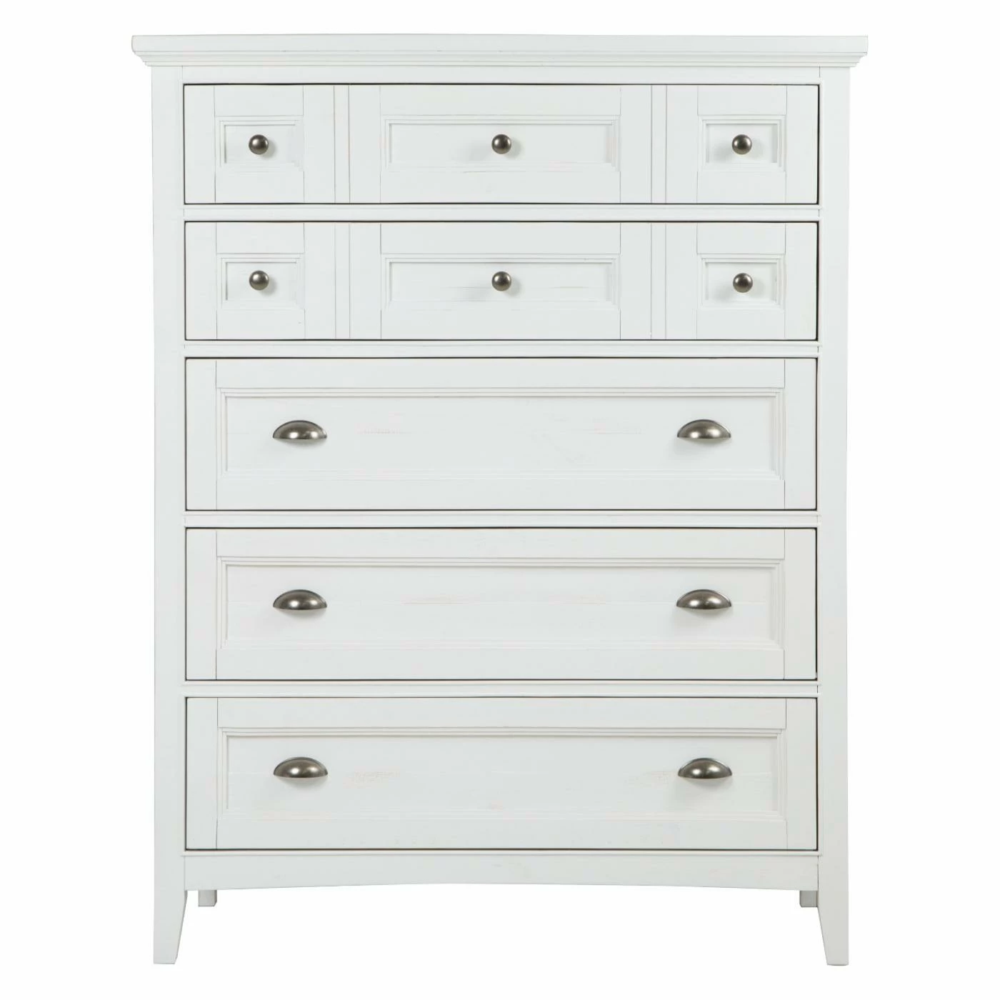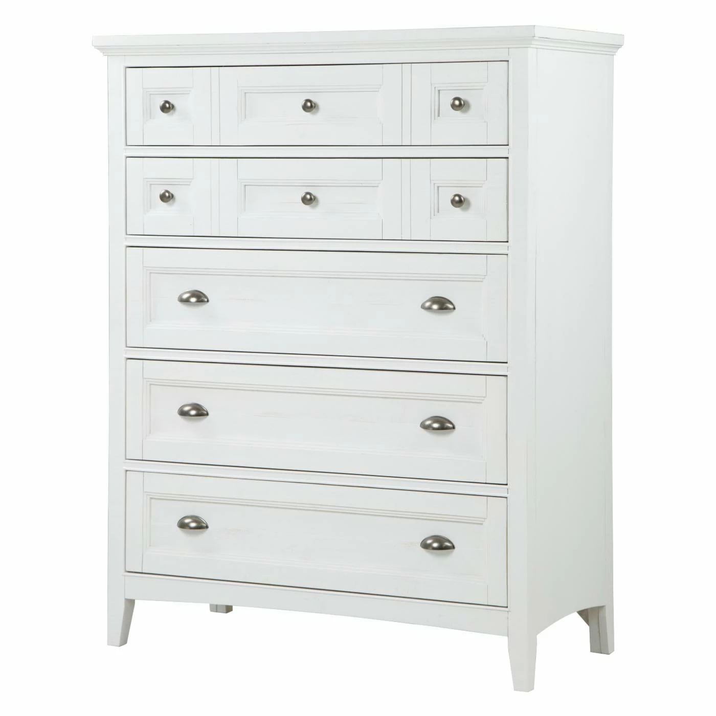 Bring your bedroom a softened look with the Magnussen Heron Cove Relaxed Traditional Soft White 5 Drawer Chest, enhanced with a chalk white finish. This beach-inspired chest includes five drawers that offer plenty of space for clothing, cold-weather accessories, and much more. The sleek silver metal hardware brings the piece a delightfully contemporary touch.