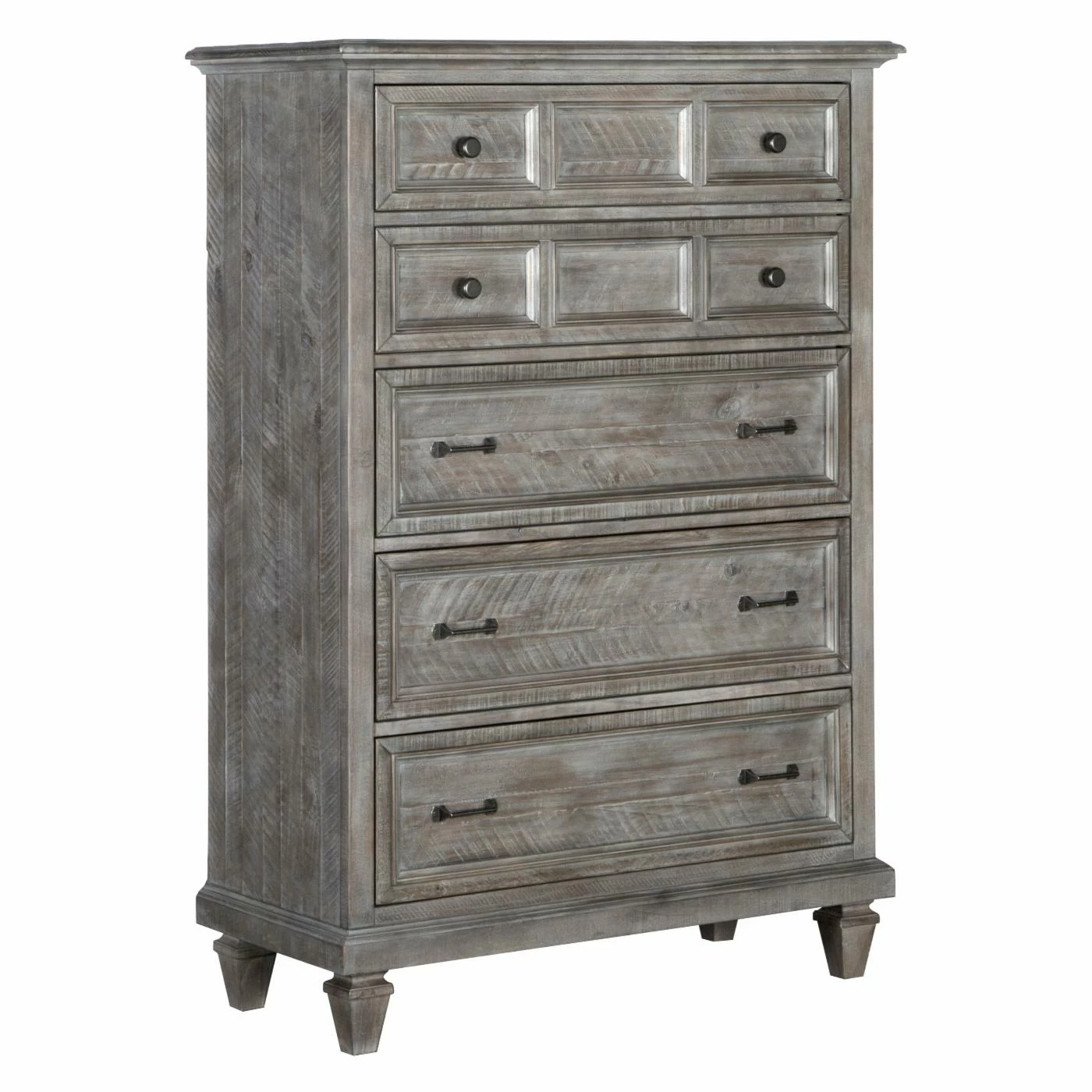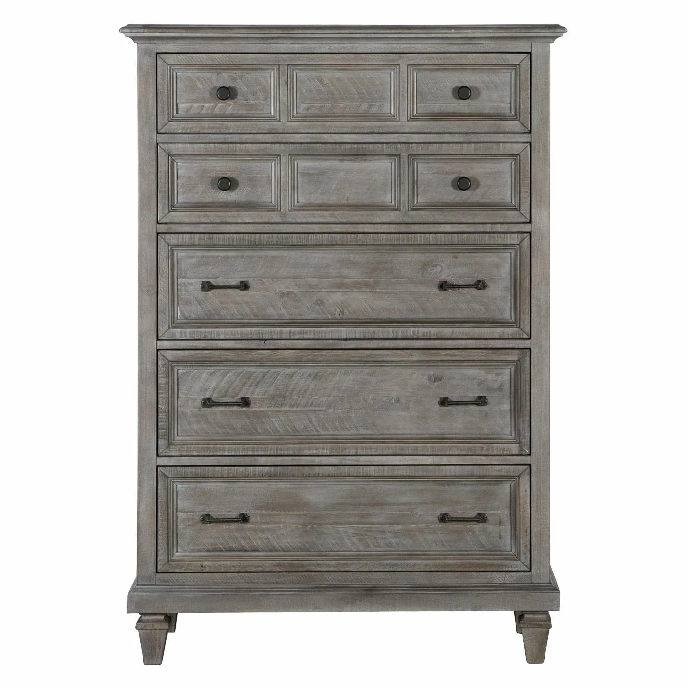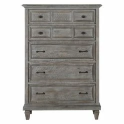 Classic lines are updated to make the Magnussen Lancaster 5 Drawer Chest perfect for your modern farmhouse or rustic casual bedroom. This chest of drawers is built of pine solids in a weathered dovetail gray finish detailed by chatter marks. Five roomy drawers offer abundant storage.