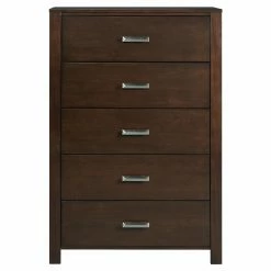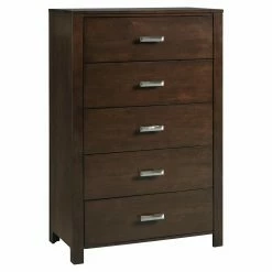 The Modus Riva 5 Drawer Chest features a hand-applied chocolate brown finish that brings out the best in the Basswood veneer grain pattern, and sports oversized satin nickel pulls in an elongated pyramid shape. Made for everyday use, the remarkably sturdy chest is assembled from solid mahogany, veneers, and durable MDF. Try matching it with items from the rest of the Riva collection so you have the full bedroom suite!