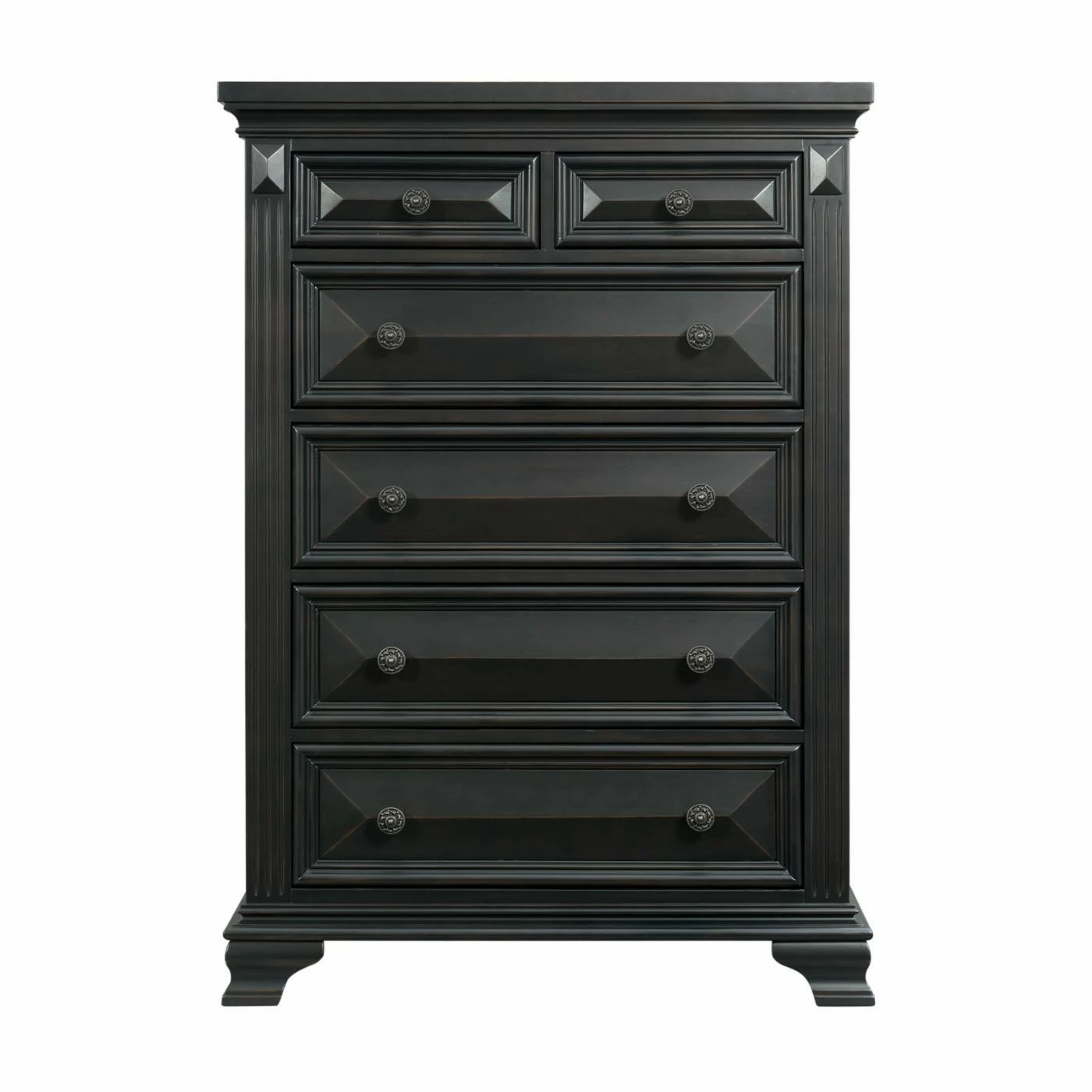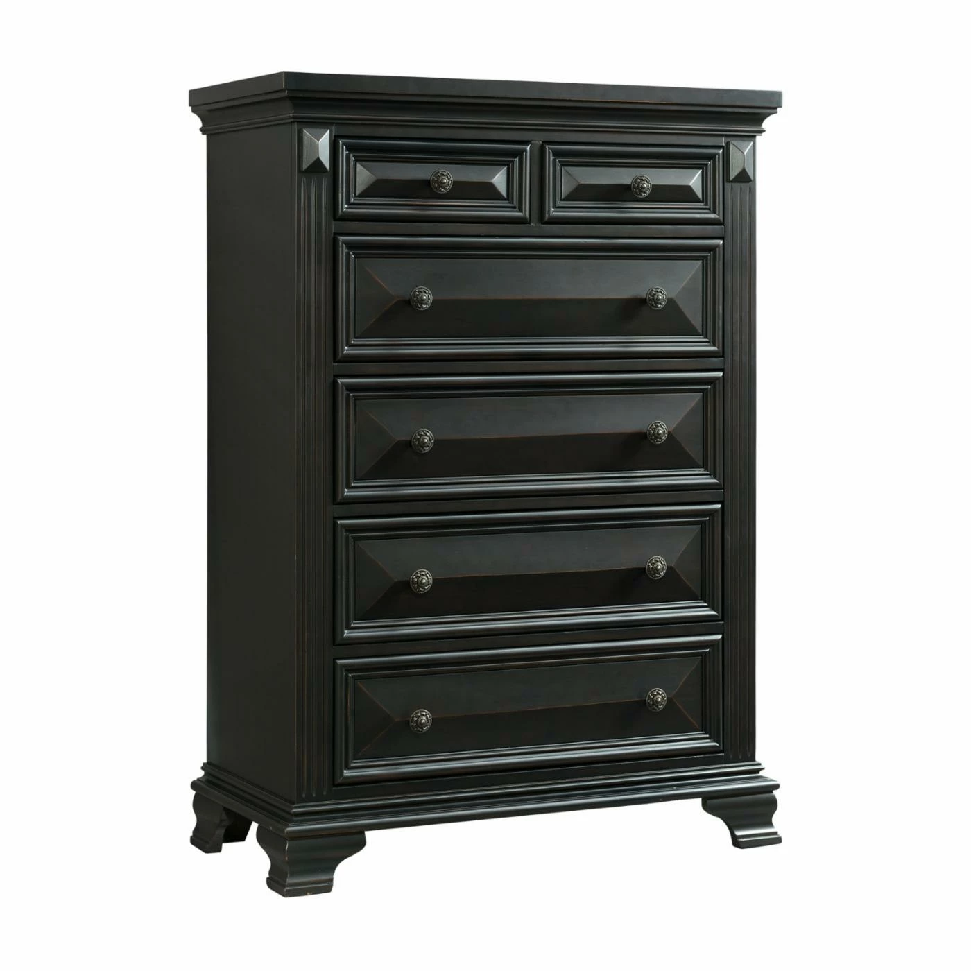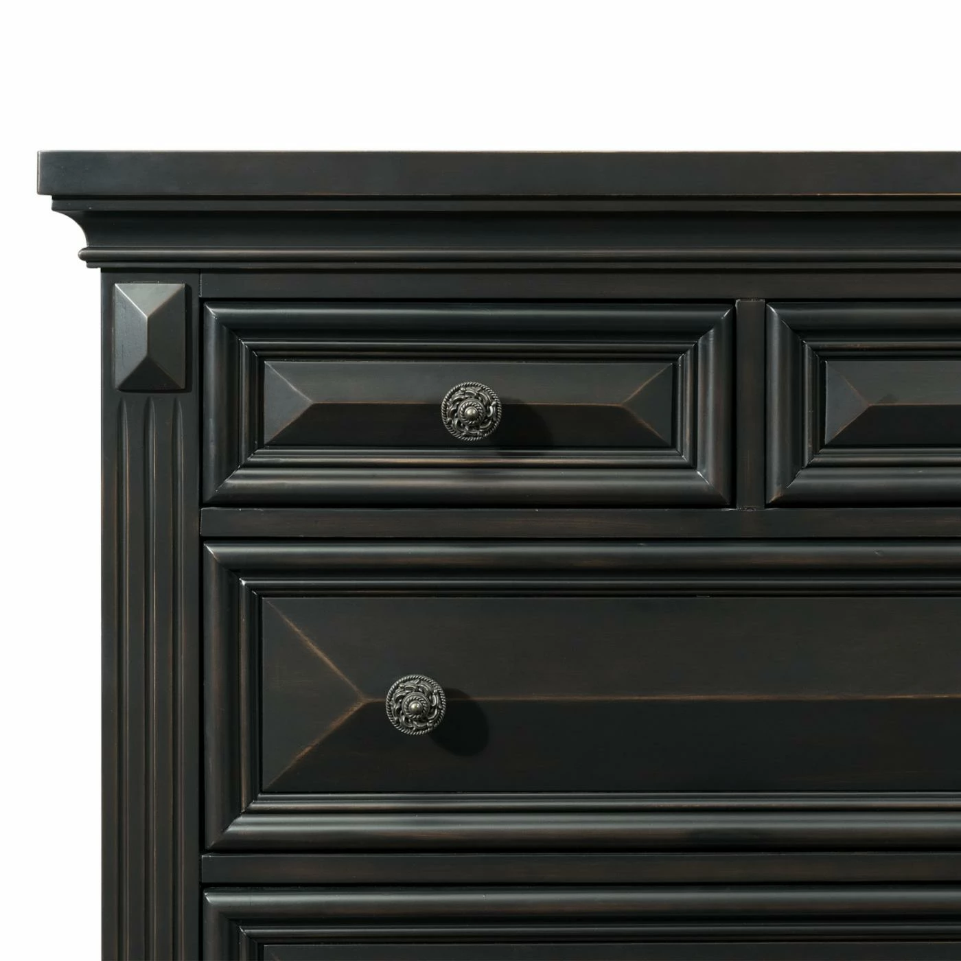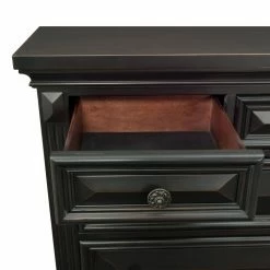 The form of the Picket House Furnishings Trent 6 Drawer Chest definitely has some traditional roots, but the sleek finish of antique black hints at a bit of glam. The tall design of this dresser offers you six drawers, each with a raised, beveled face and vintage-style metal pulls with your choice of available finish options. The upper drawer is lined with black velvet and the lower drawer is dust-proof and constructed with cedar lining to ward off insects and keep your clothes fresh. The body of this chest is crafted from a mix of solid acacia and pine hardwood with engineered wood elements. An anti-tip kit is included.