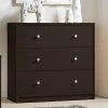 Your socks and sweaters will love to snuggle up inside the spacious drawers of the Fremont 5-Drawer Chest. Smooth metal roller guides ensure that the drawers easily glide open, and built-in safety stops prevent accidental spilling. The clean lines and simple yet stylish design complement any decor. Made of durable composite woods in a warm espresso finish, this bedroom chest comes ready-to-assemble and boasts a smooth, profiled top, side moldings, and arched kick plate. Dimensions: 31.5W x 16D x 45H inches. Fremont bedroom collection pieces can match all espresso beds and headboards.