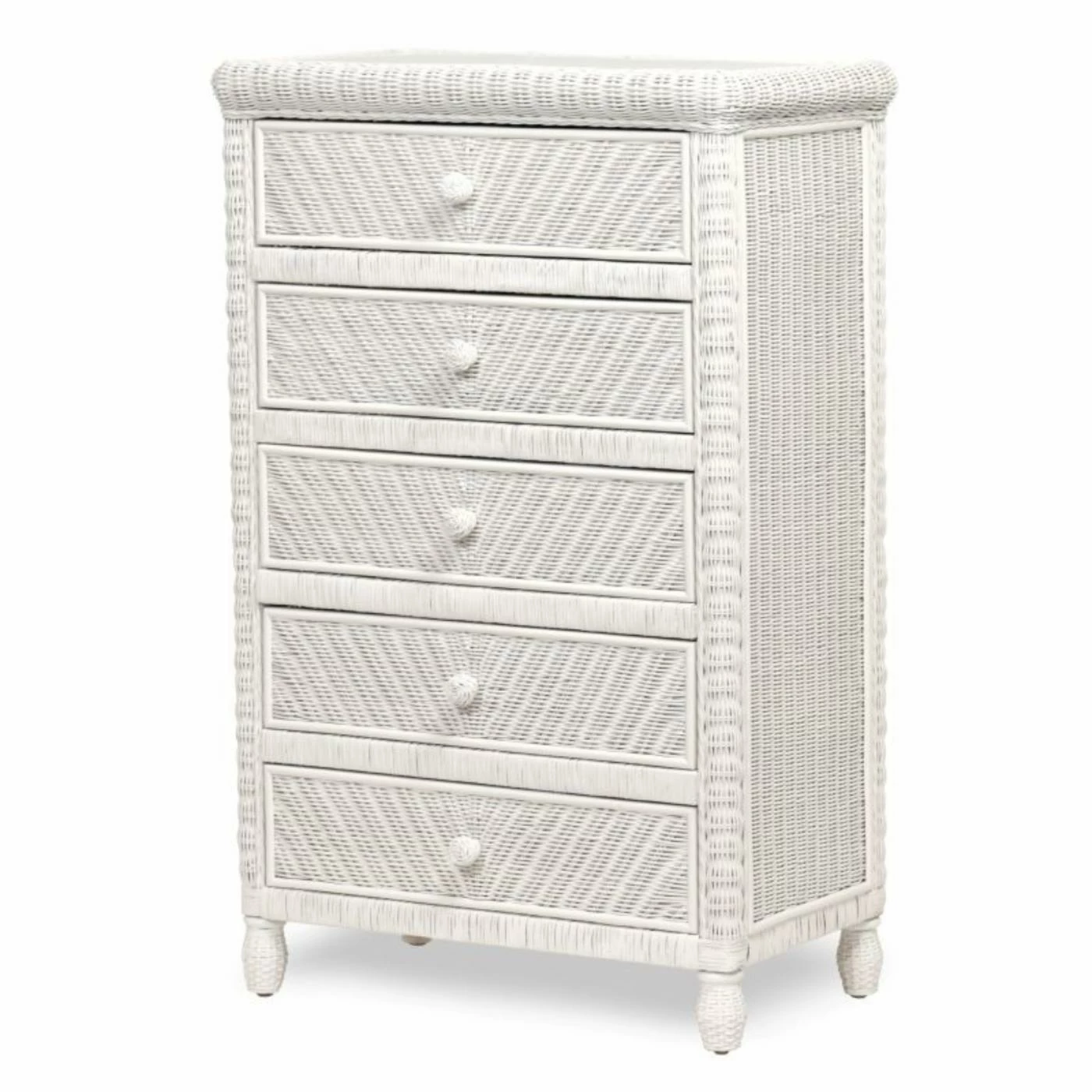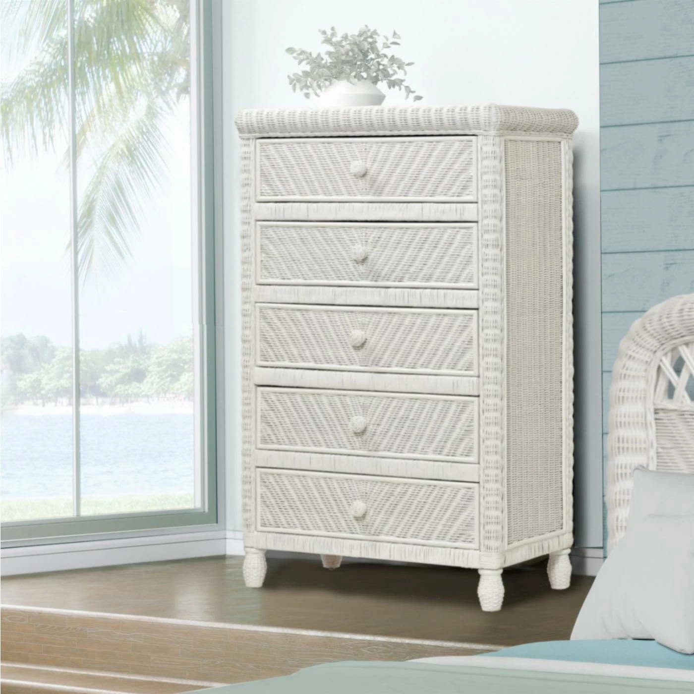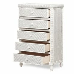 Whether it’s your bedroom or dining area, the Sea Winds Trading Santa Cruz 5 Drawer Chest gives you plenty of storage coupled with seaside style. This tall chest has five smooth-closing drawers and boasts a coastal-inspired woven wicker design and chic glass top.ย