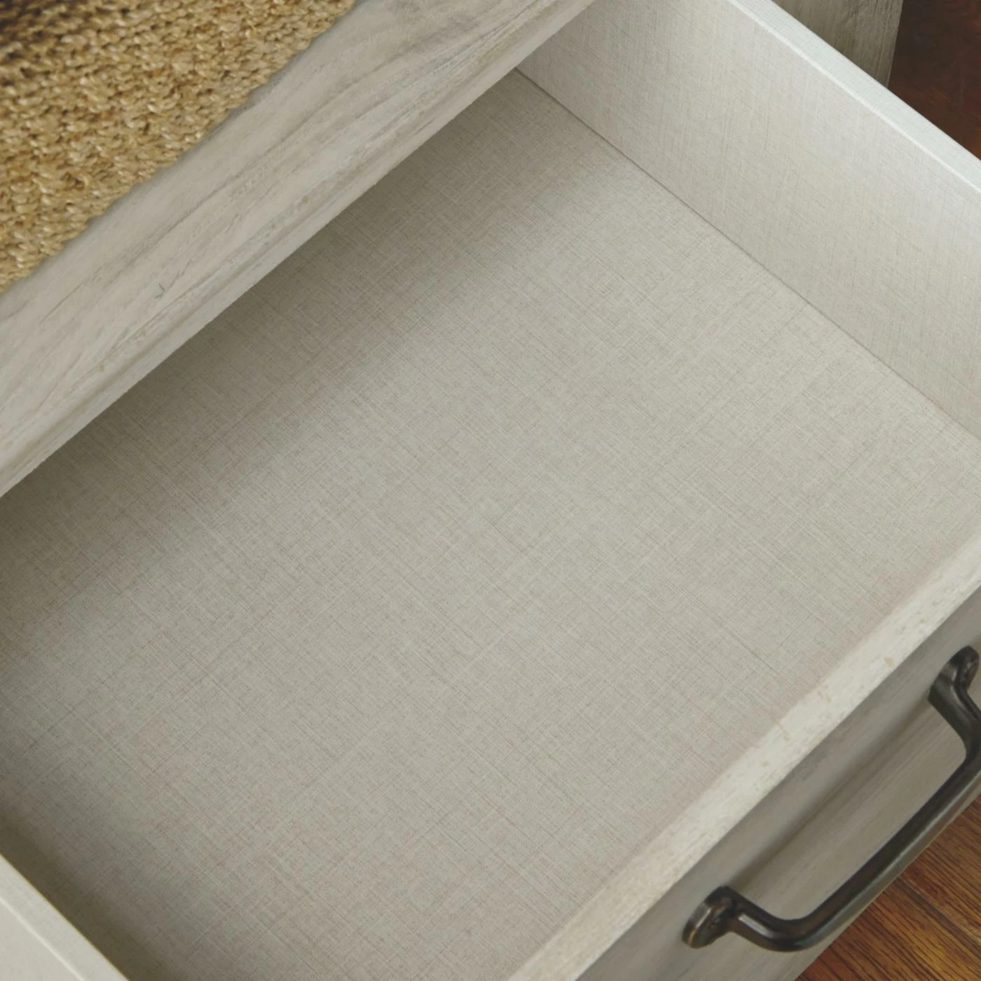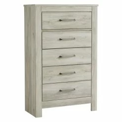Add rustic flair to your space with the replicated oak Signature Design by Ashley Bellaby 5 Drawer Chest. It boasts a clean, boxy shape with a whitewash finish that’s strategically applied to reveal the grain, creating a weathered look. This chest is enhanced with brushed nickel handles that have black edges. Plus, the faux linen-lined drawers are designed to glide smoothly and close softly.