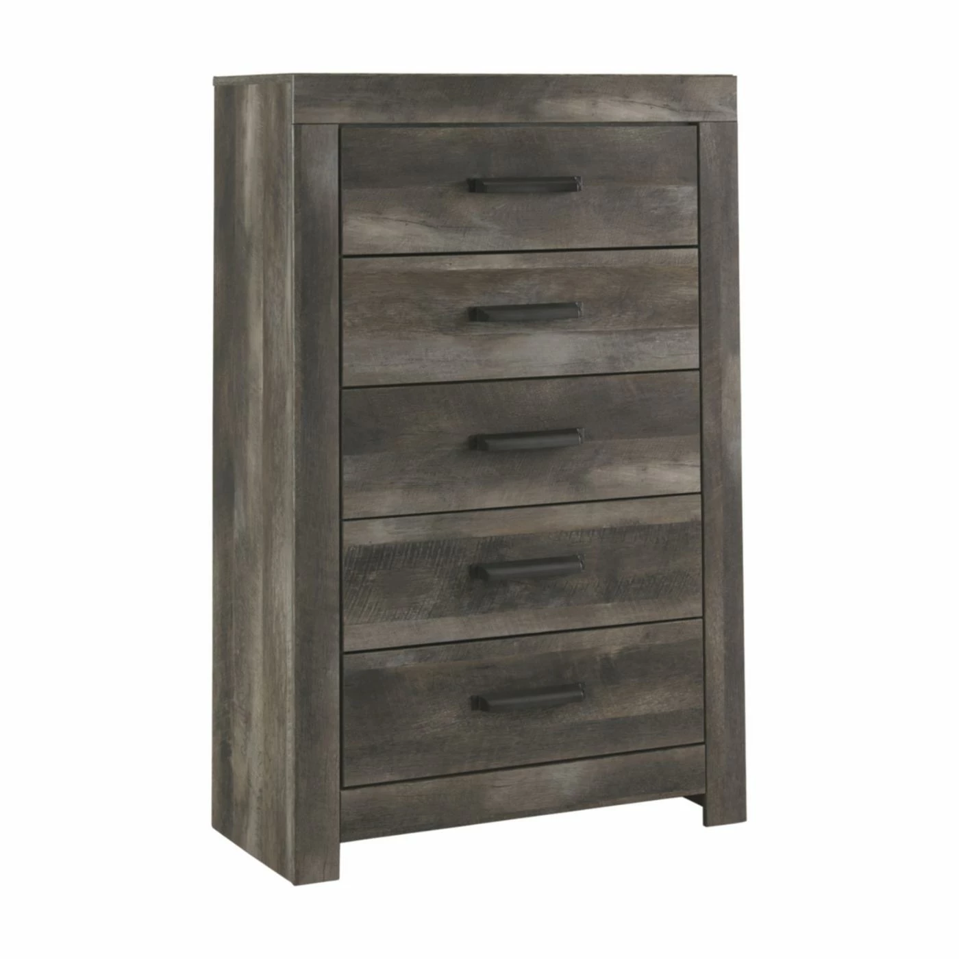 The Signature Design by Ashley Wynnlow 5 Drawer Chest features a versatile rustic gray finish over replicated oak grain. Each of the five drawers features unique detailing. Large hooded pulls and flush-mount details accent each drawer. The plank-style design adds rustic charm to this chest.