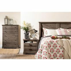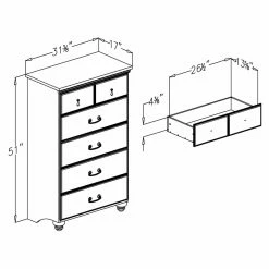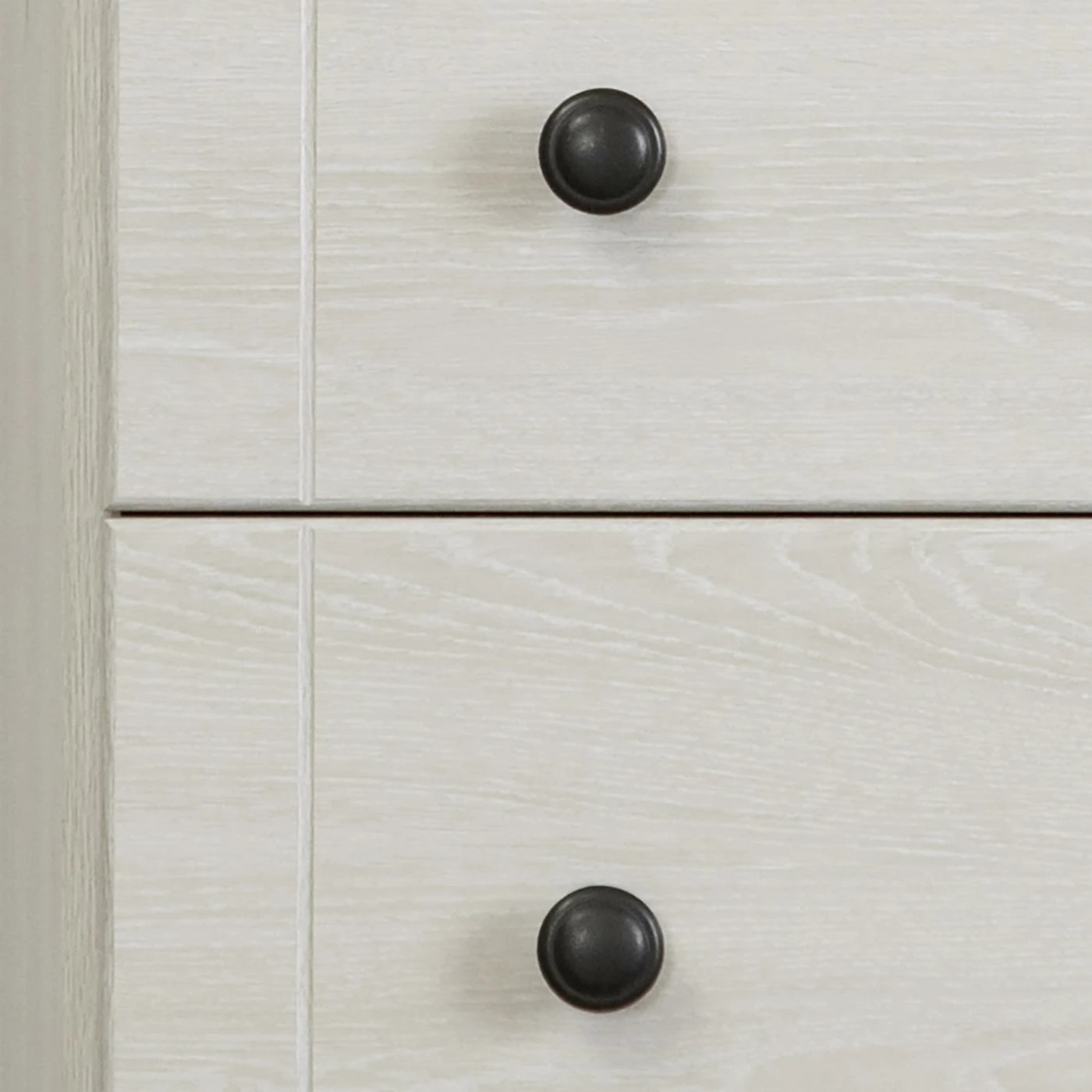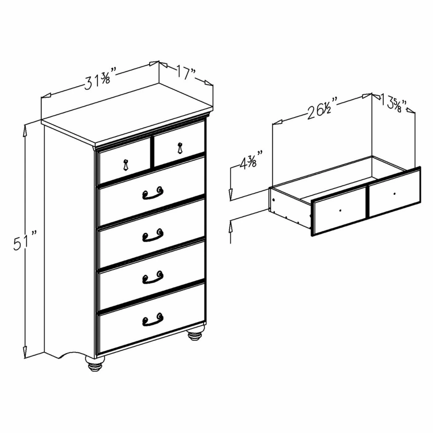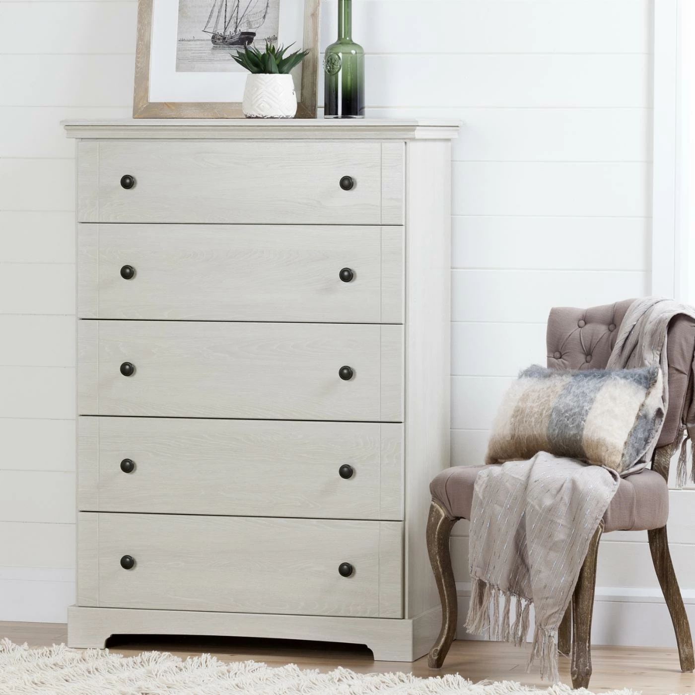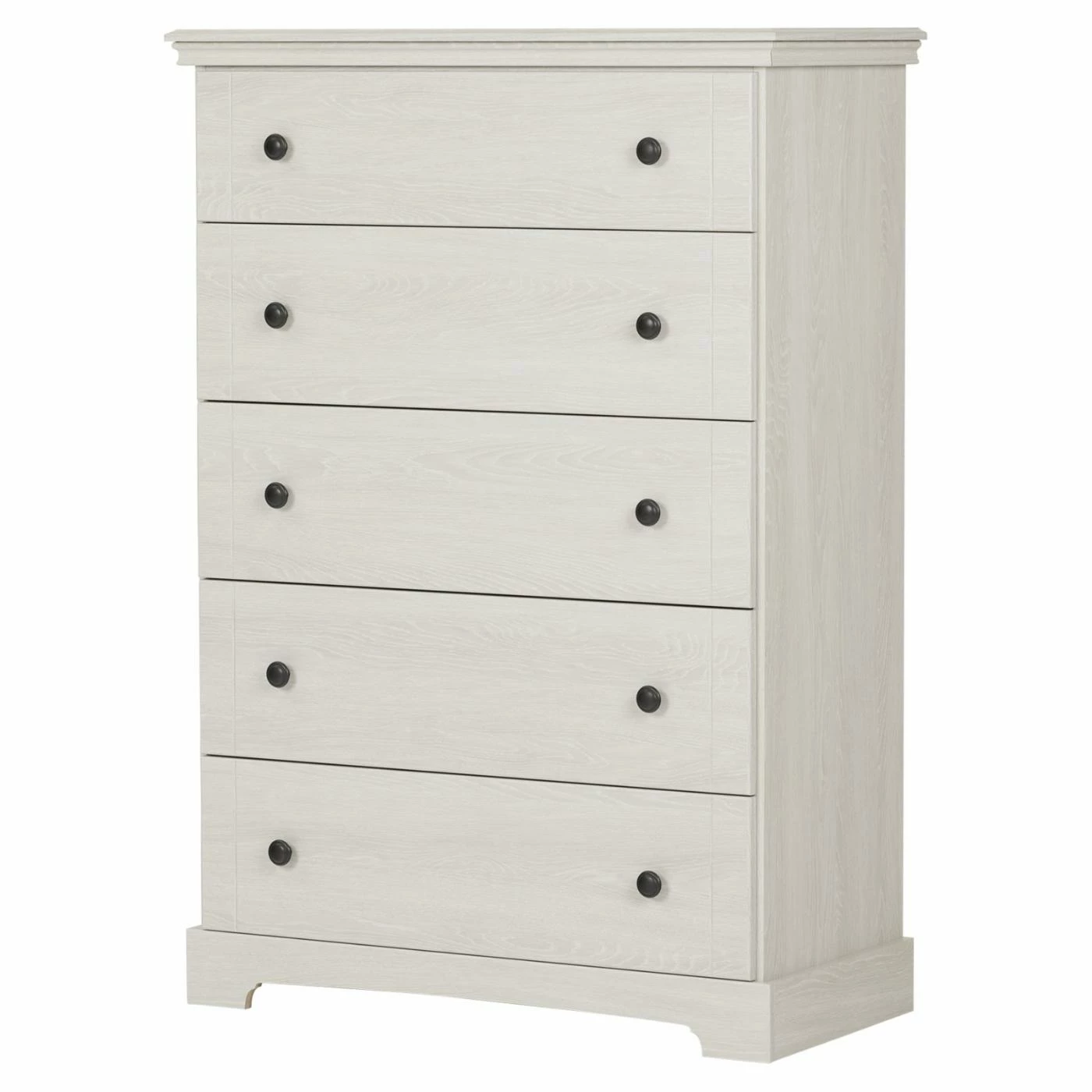 A choice of finish, molded details, and an arched bottom give the South Shore Avilla 5 Drawer Chest that classic cottage look that fits with farmhouse or coastal bedrooms. Circular metal drawer pulls and grooves in the drawer fronts give a subtle, modern update to the chest. This chest is made in North America from laminated, engineered wood and features five spacious drawers to store your clothes and accessories. Add this chest to your guest or master bedroom set. Requires assembly by two adults (tools not included).