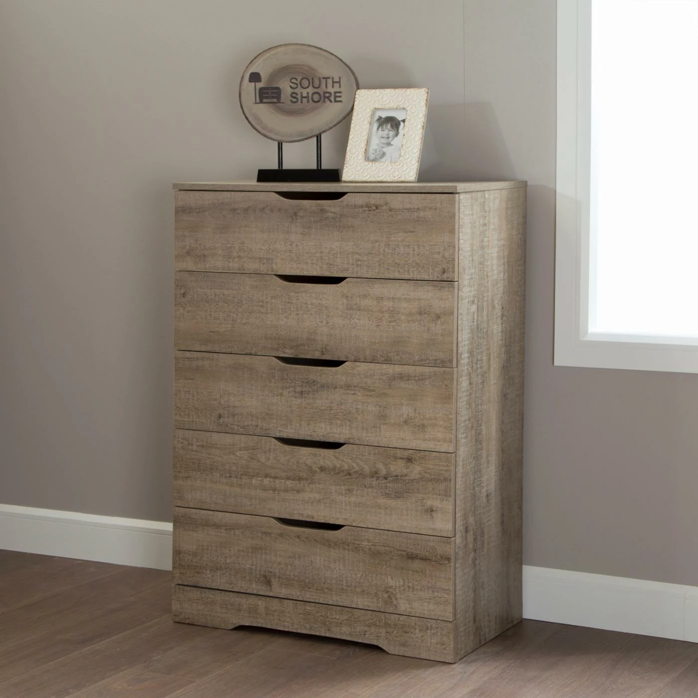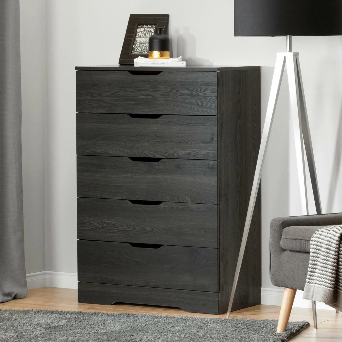 Five drawers with contemporary cut-out handles make the South Shore Holland 5 Drawer Chest an urbane way to store your clothing. This chest is built in North America using non-toxic laminated engineered wood. Choose from available finish options.