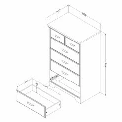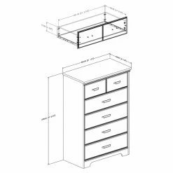 The transitional appeal of the South Shore Versa 5 Drawer Chest includes decorative crown moldings, coordinating metal pulls, and an arched bracket base. This chest includes a profiled top drawer and four lower drawers. It’s made of laminated engineered wood and comes in your choice of available finish.