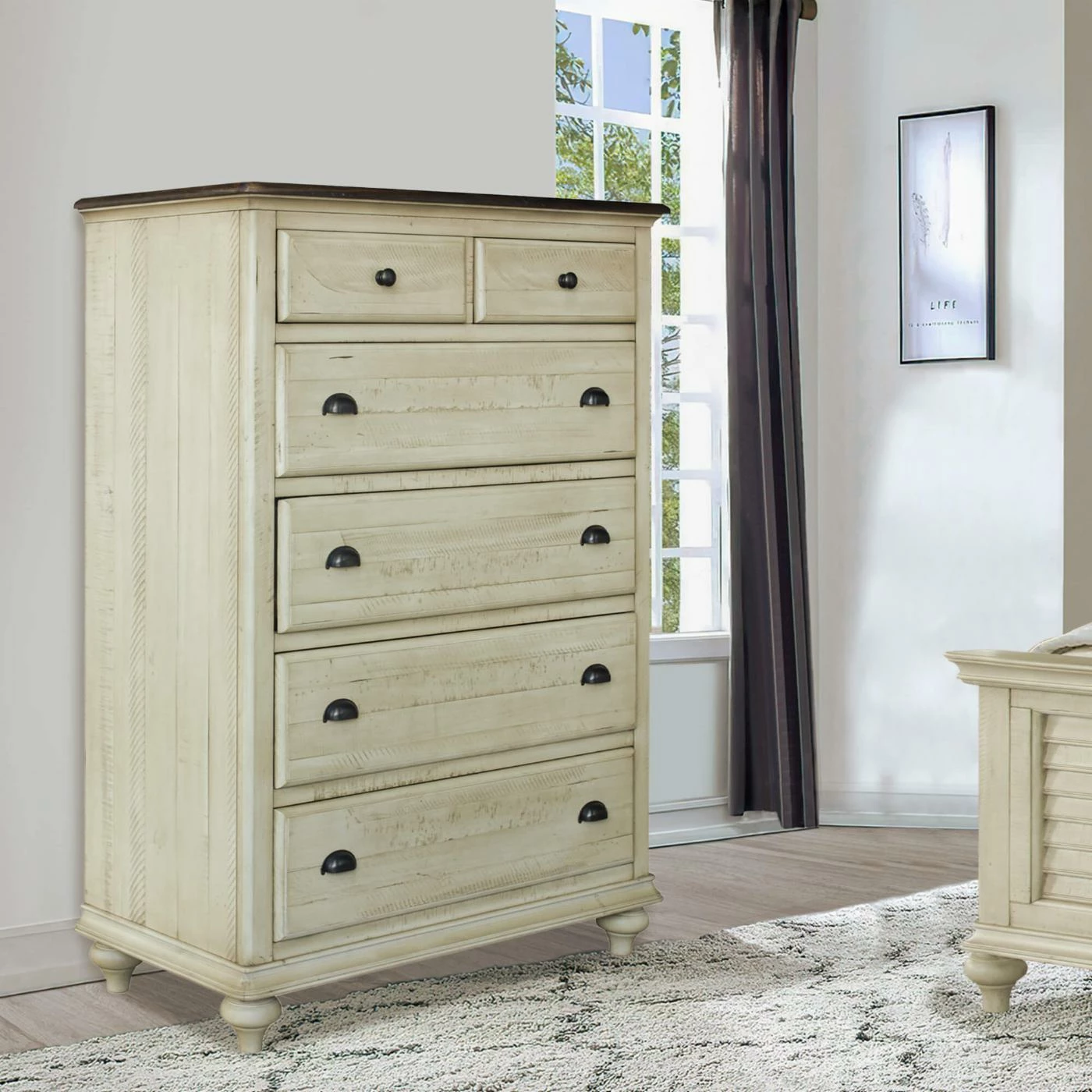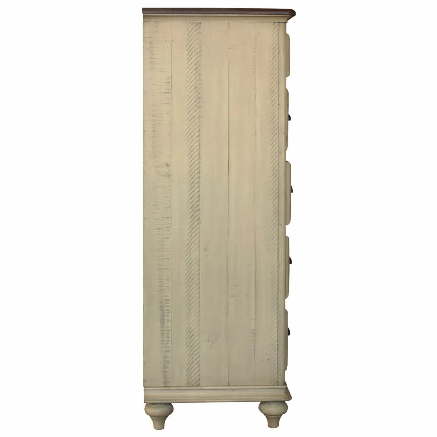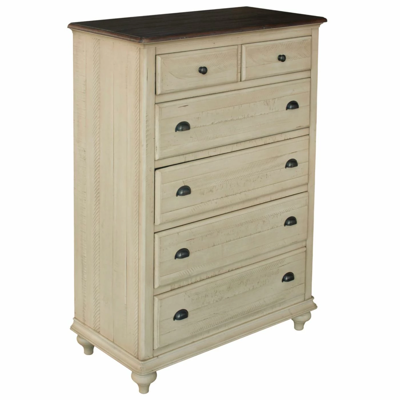 Staying organized just might become second nature when you have the Sunset Trading Shades Of Sand 6 Drawer Chest at hand. With ample opportunities for storage, this chest offers six roomy drawers, and the top two drawers are felt-lined for storing jewelry and other smaller items. Each drawer is constructed with durable dovetail joinery, and the four larger drawers have finished interiors to protect your clothes from pulls and snags. This chest is crafted from acacia wood and New Zealand pine treated with an eight-step finishing process and coated with super-smooth, protective lacquer. A perfect accompaniment to the Shades of Sand Collection, this chest features an Antique White finish wire-brushed by hand for just the right amount of texture. The natural walnut-finished chest top ties together the look of this breezy-chic piece.