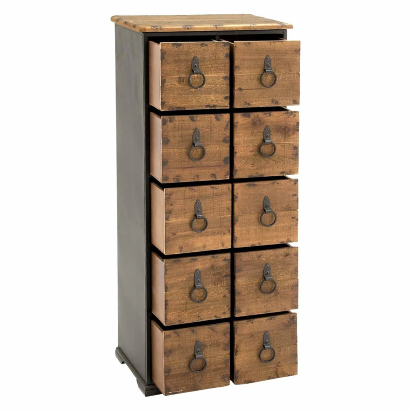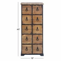 The Wood & Metal 45H in. Chest is a versatile accent piece with distinctive rustic character. Highlighted by a natural wood grain finish and industrial metal ring drop pulls, this handsome wood and metal chest holds ten neatly tiered drawers for all-purpose storage.
