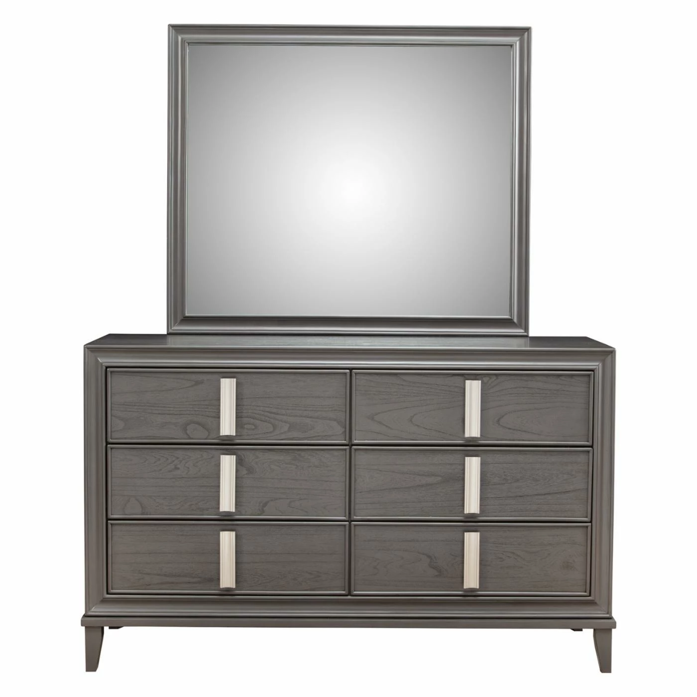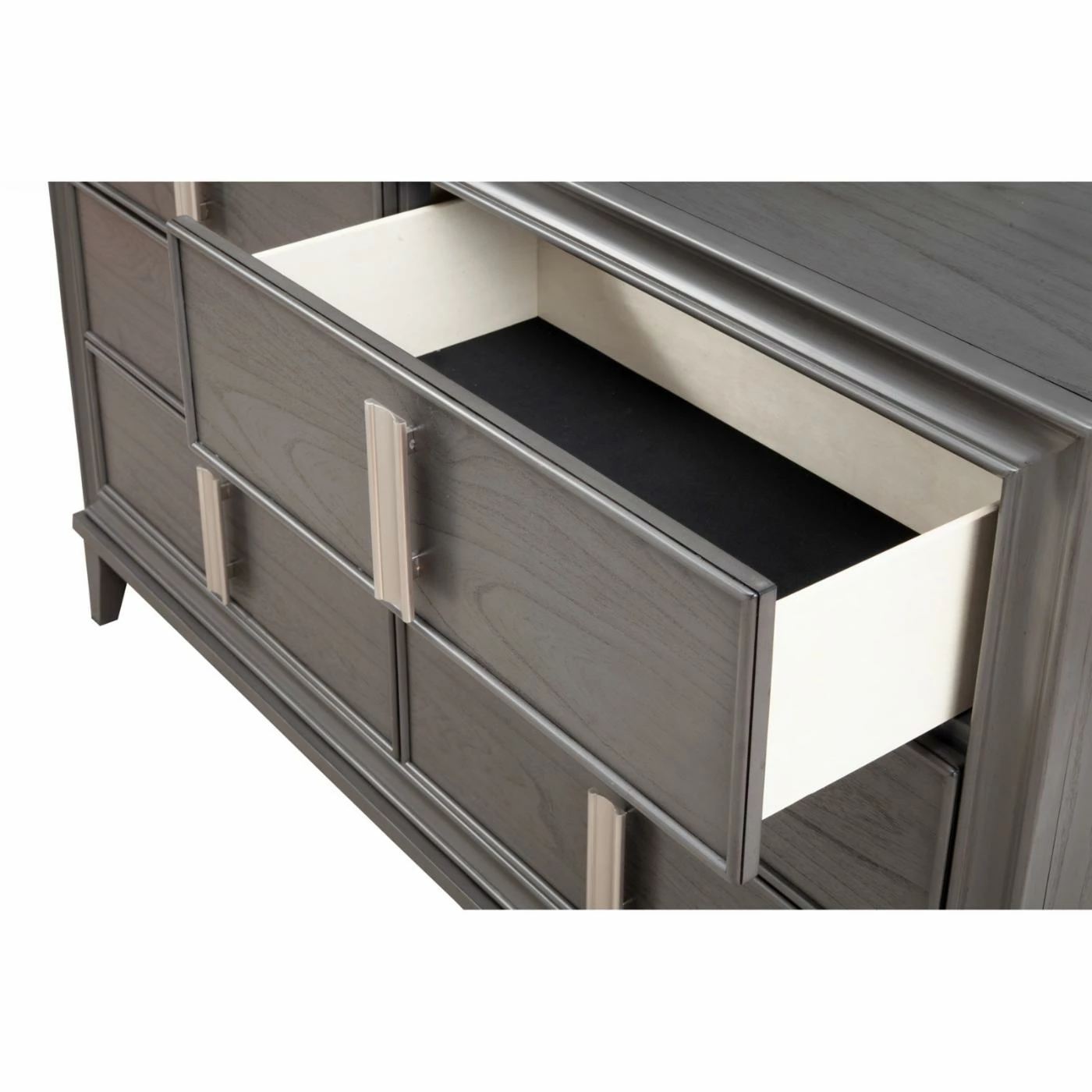 Cultivate a refined modern look to your interior dΓ©cor with the Alpine Furniture Lorraine 6 Drawer Double Dresser. This wide dresser is outfitted with six drawers with full-extension ball-bearing glides and vertical metal bar handles. The drawers are accented with framed borders and the topmost drawers are felt-lined to protect delicates and valuables. Solid wood constructs the frame, topped by select veneers and finished in cool gray. Top off the design with a matching optional mirror (as available).