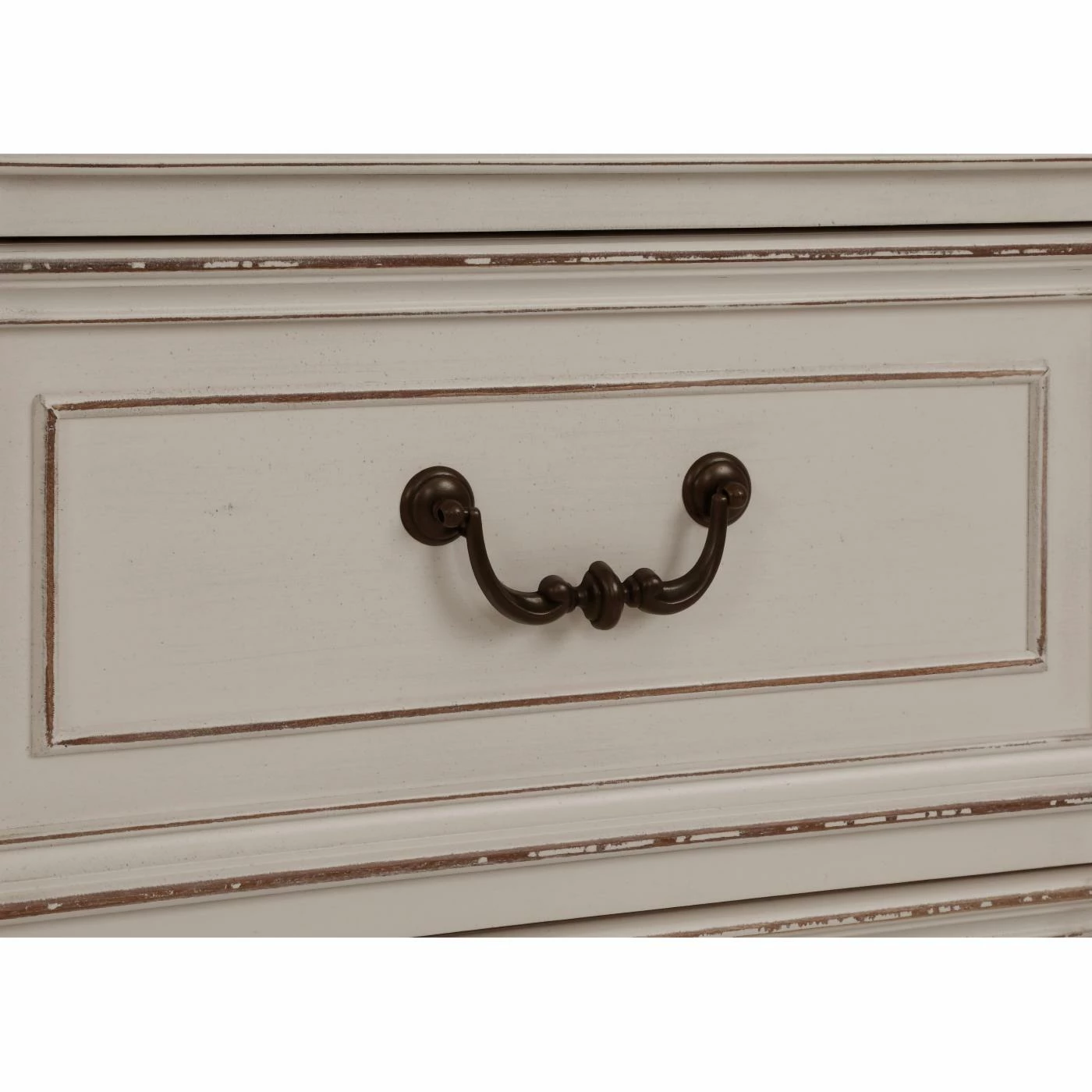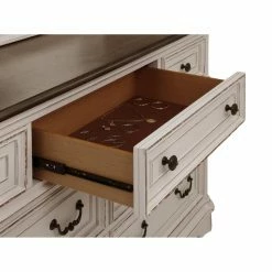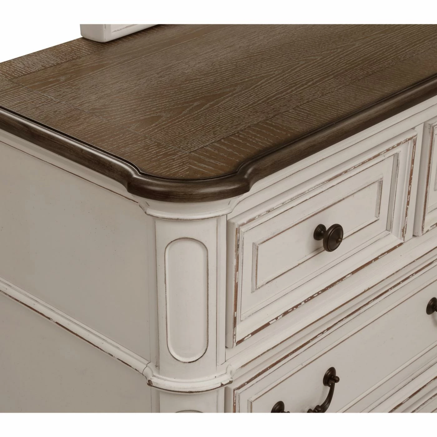 All of your items will find a home in the Roundhill Furniture Laval 7 Drawer Dresser. Distressed details add an authentic touch to the antique white finished base. The natural brown wood top contrasts the base in a way that just works. The antique bronze finished hardware provides classic style to this dresser. Framed drawer fronts and detailed bracket feet complete the design. The felt-lined top drawers will keep your delicate items safe. Choose from the available configuration options to add the coordinating mirror.