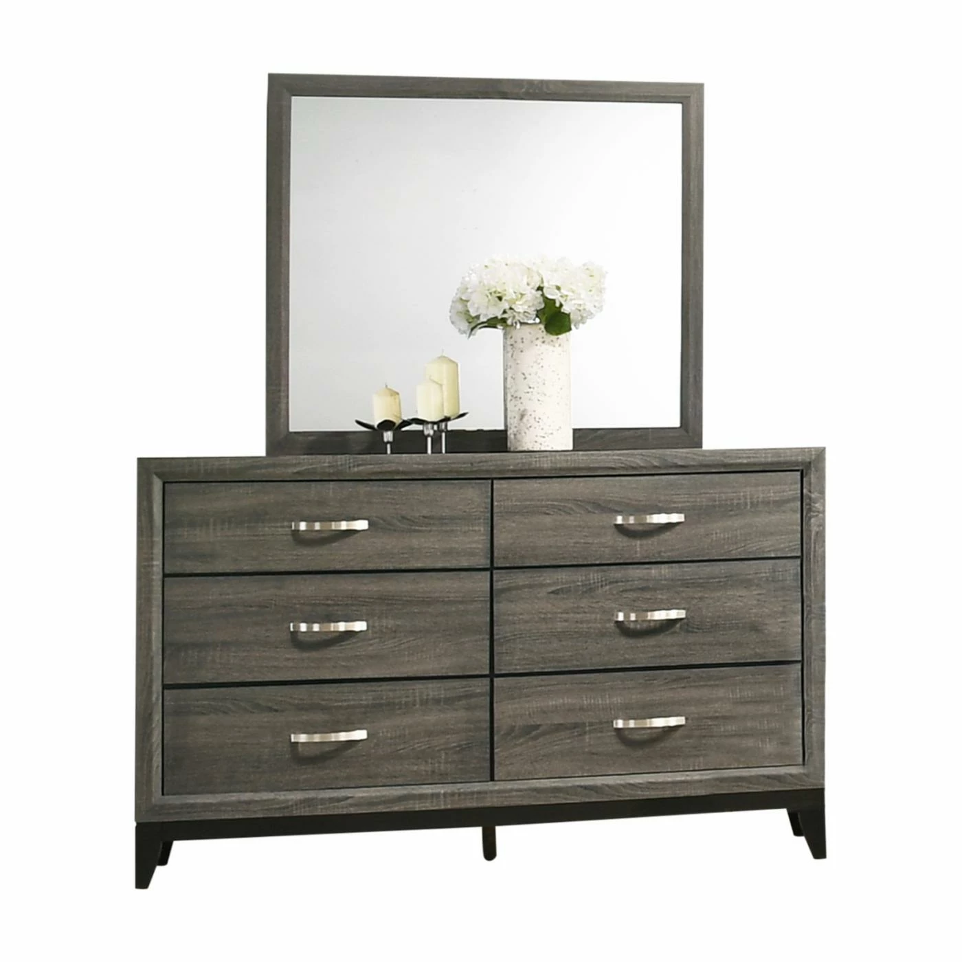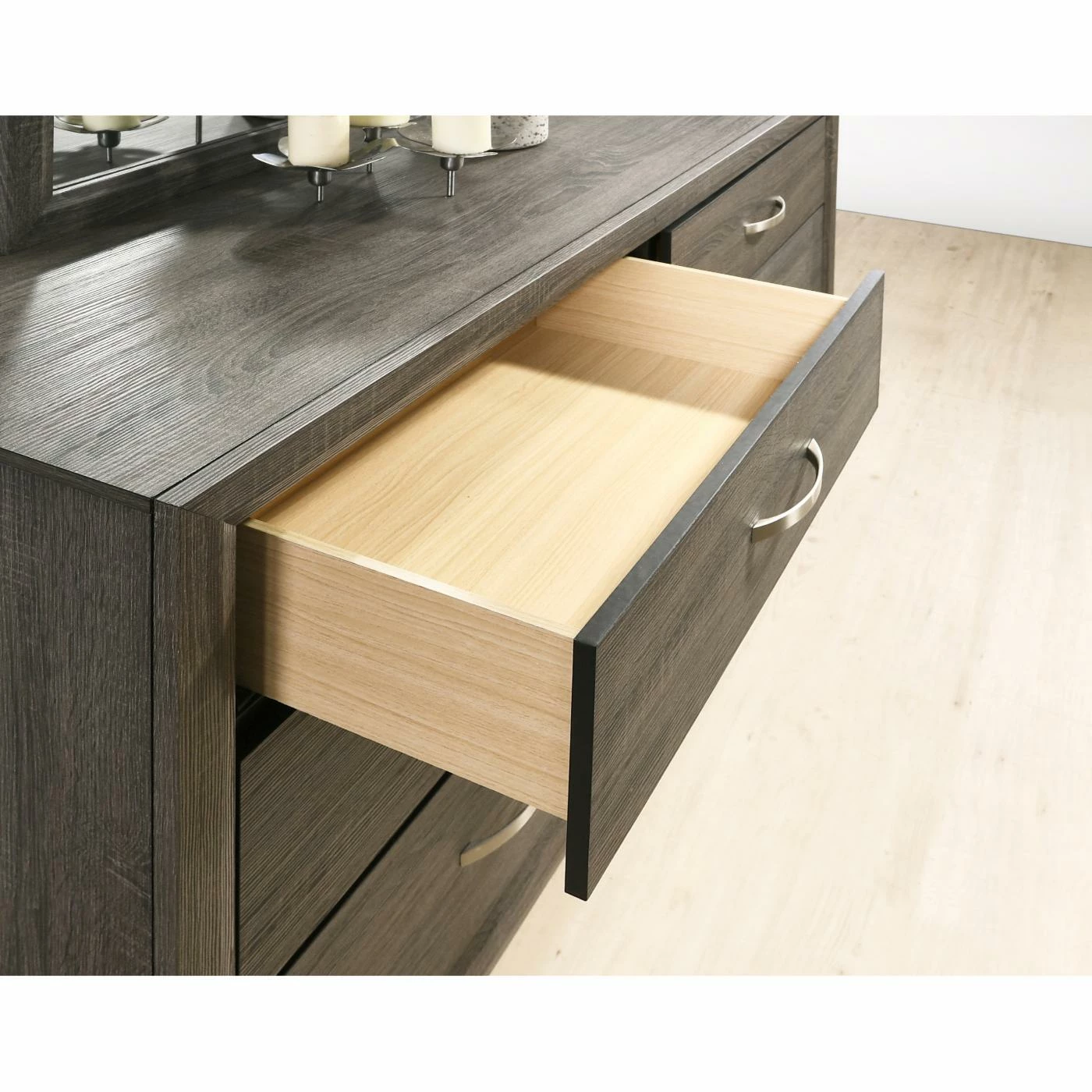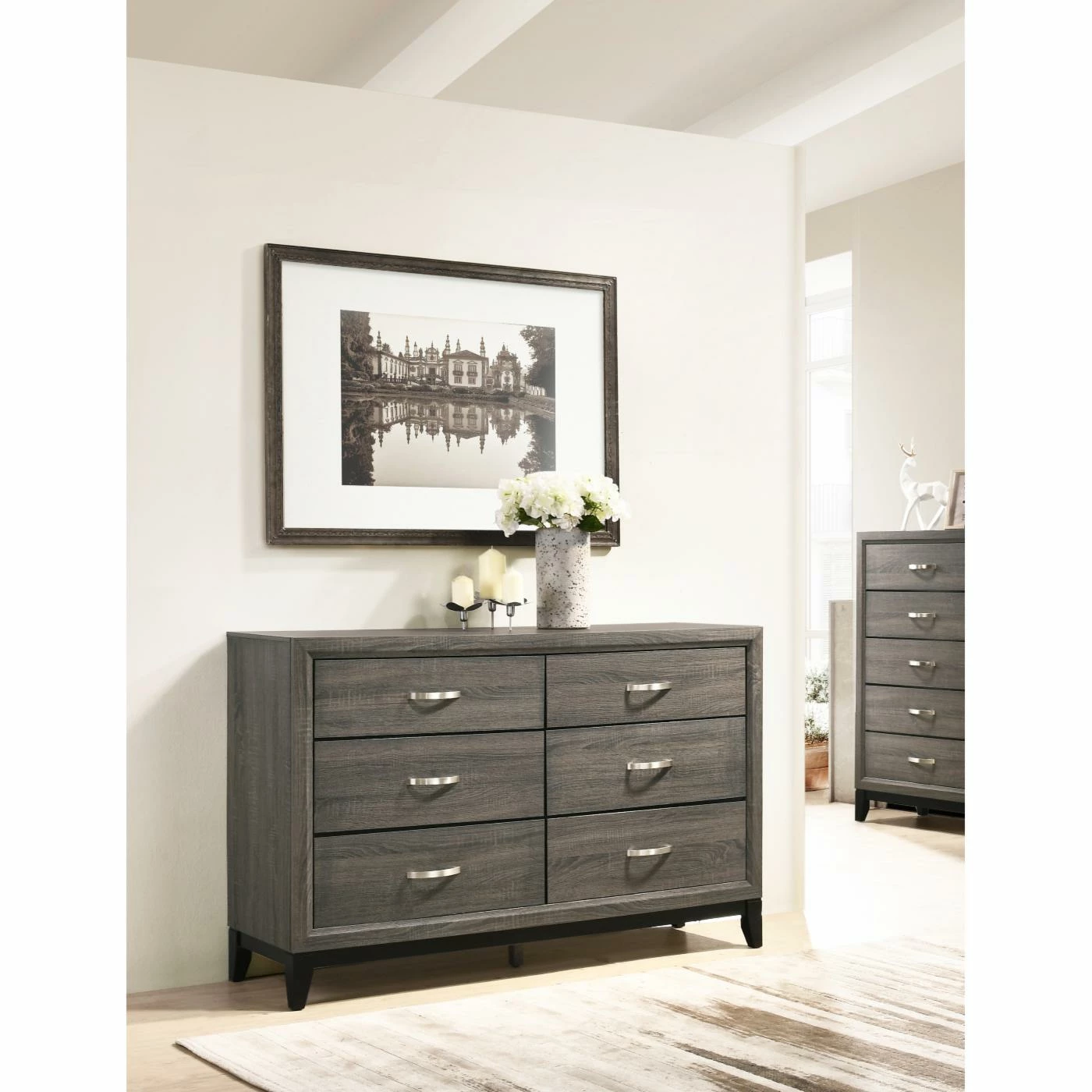 The Roundhill Furniture Stout 6 Drawer Double Dresser will provide your room with a stylish way to organize all of your clothes and essential items. The distressed gray finish adds a rustic chic look to this dresser. The six drawers are complete with silver-toned hardware. Tapered black feet finish off the design of this wood dresser.