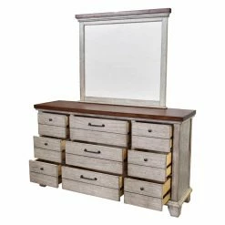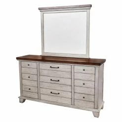 A white smoke finish and wood-plank drawer fronts give the Steve Silver Co. Bear Creek 9 Drawer Dresser with Optional Mirror its relaxed, rustic farmhouse appeal. A warm honey smoke stained top and simple hardware in antique pewter enhance the aged vibe. This dresser boasts nine roomy drawers that operate smoothly on side-mount glides. Complete the look of this dresser by adding the optional mirror with matching finish and moldings.