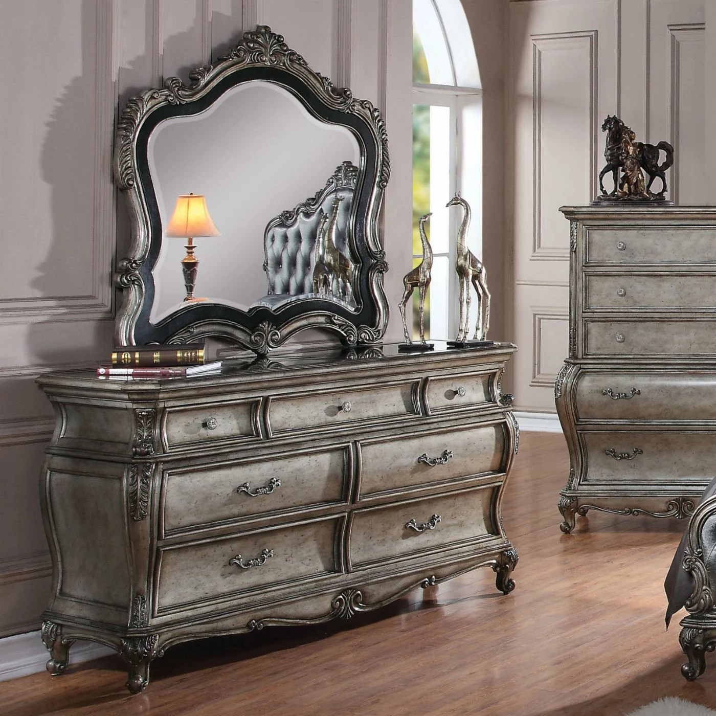 The Acme Furniture Chantelle 7 Drawer Dresser with Optional Mirror, featuring your choice of available finishes. This dresser rests on Queen Anne legs with shell crown molding and scrolled trim for an ornate look. The robust shape makes this dresser visually stunning and provides plenty of storage space. Four lower drawers and three upper drawers can be used for clothing, linens, and more. Add the optional mirror for a complete set.