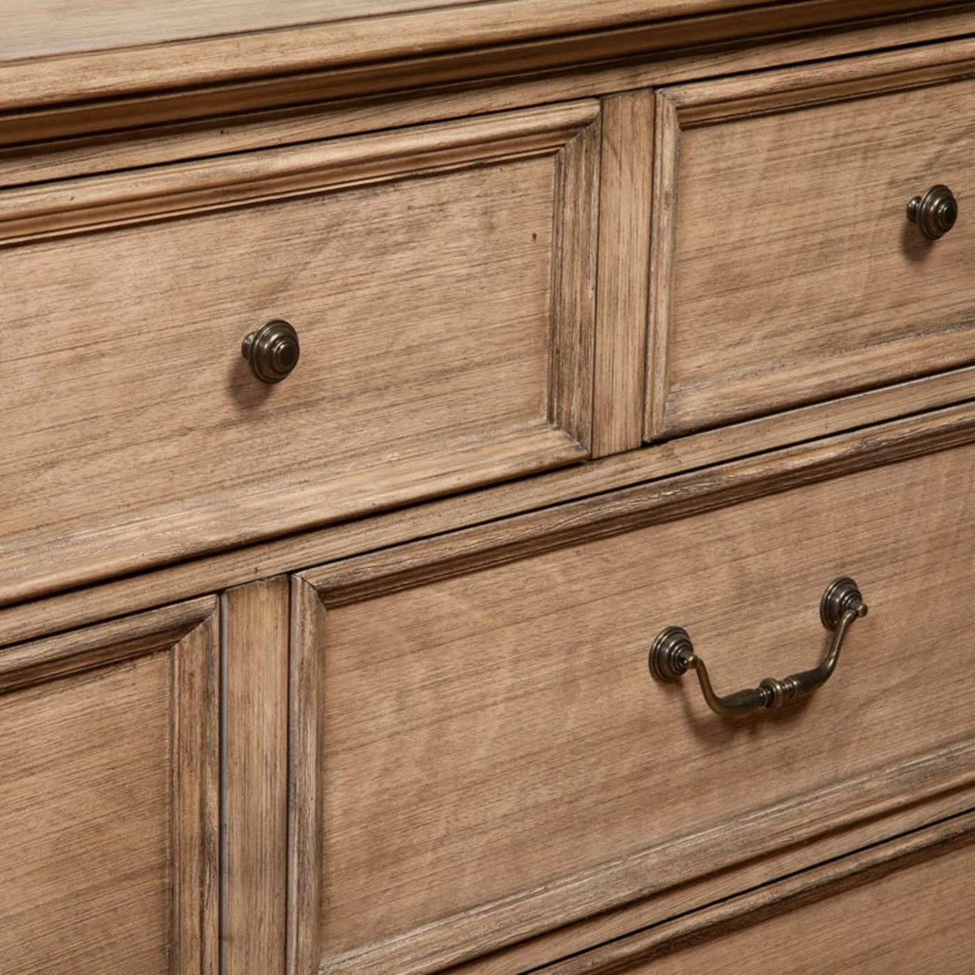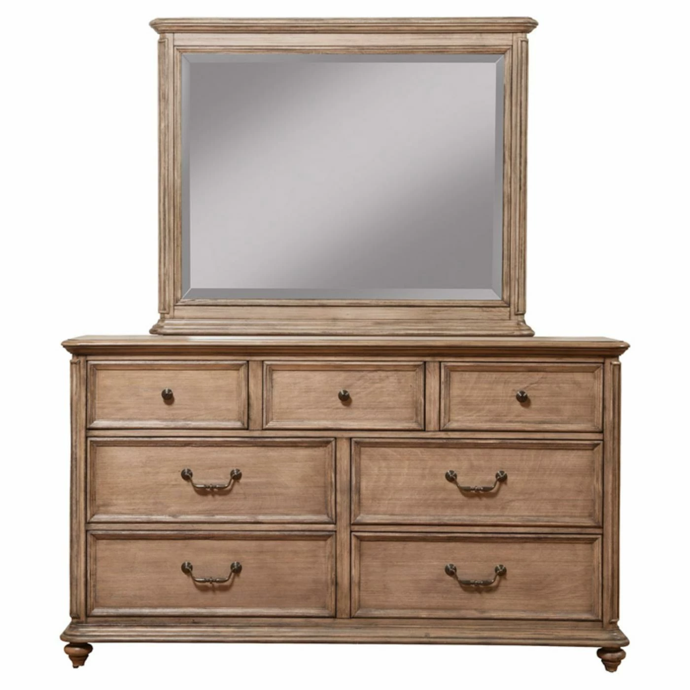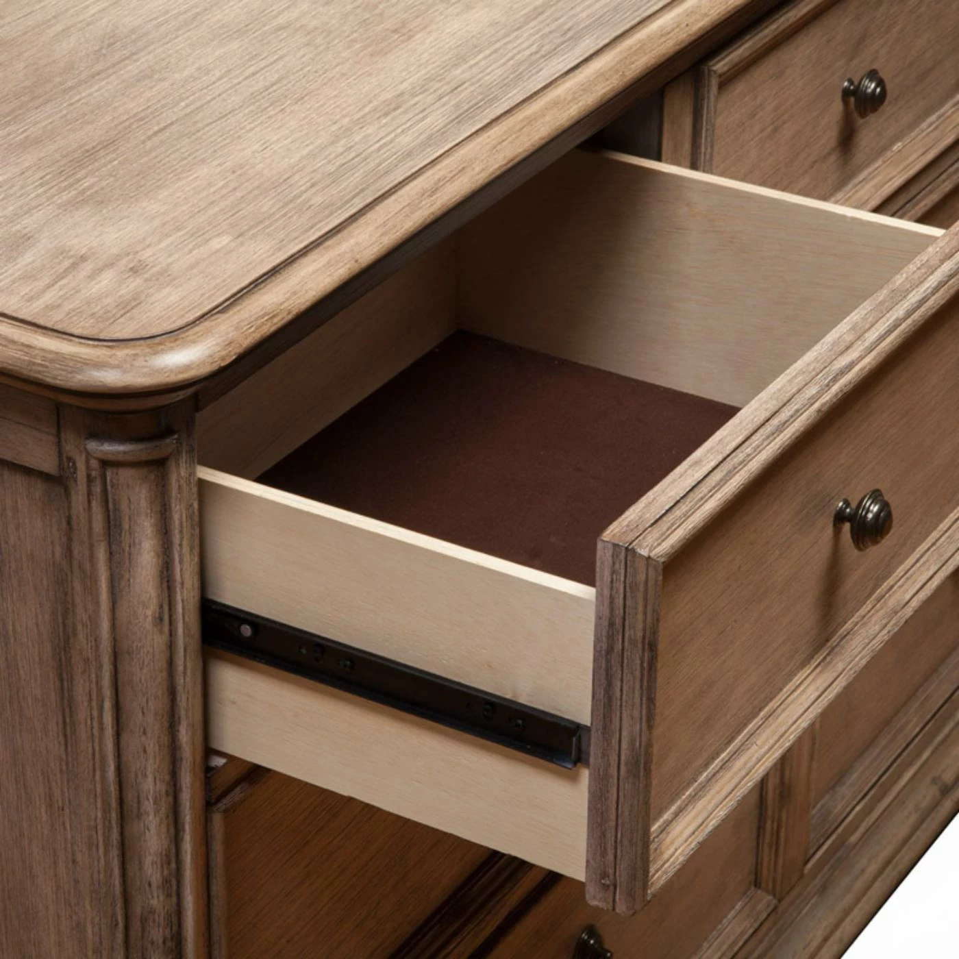 Classical design features and ample storage make the Alpine Furniture Melbourne Dresser ideal for your bedroom. This dresser features seven drawers. The top three are felt-lined to protect delicates. Drawers feature English and French dovetail construction and ball bearing metal glides. Picture frame drawer moldings, turned bun feet, and decorative metal bail pulls make this dresser something special. It’s constructed from plantation-grown mahogany solids and okoume veneers in a French truffle finish with light wire brushing. Add on the optional, matching mirror to make it complete.