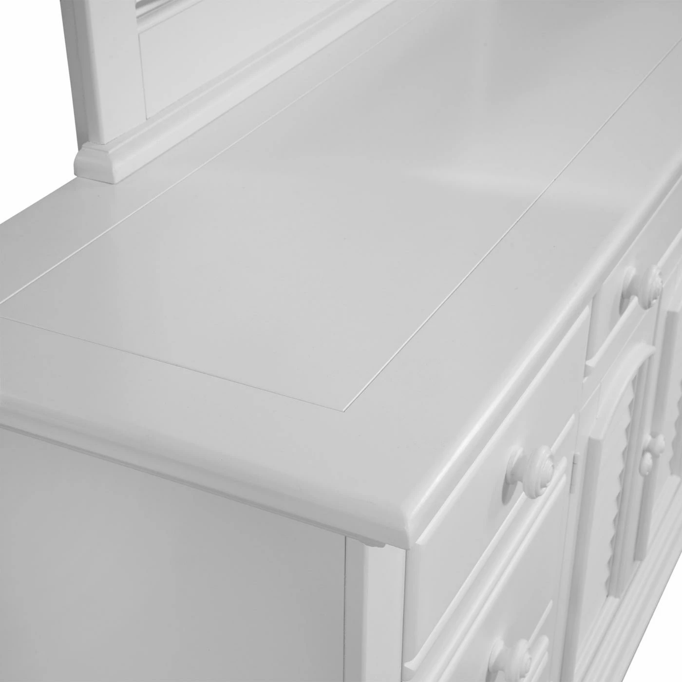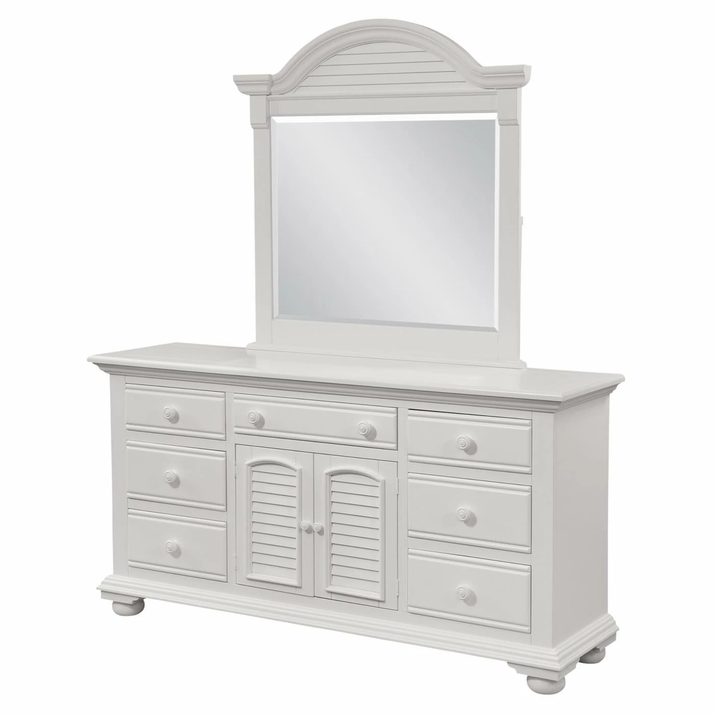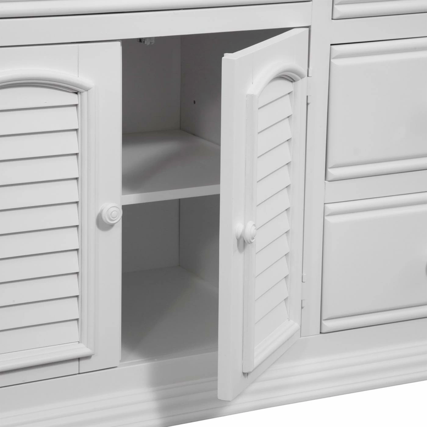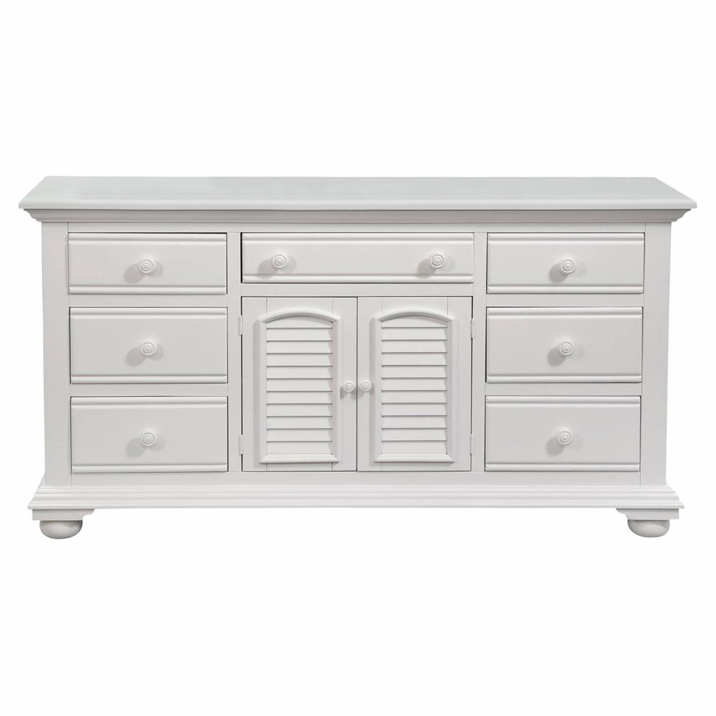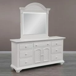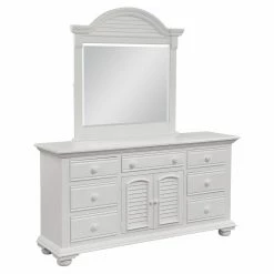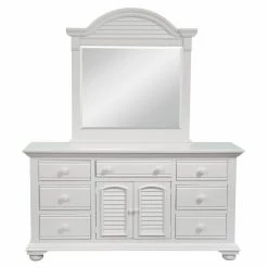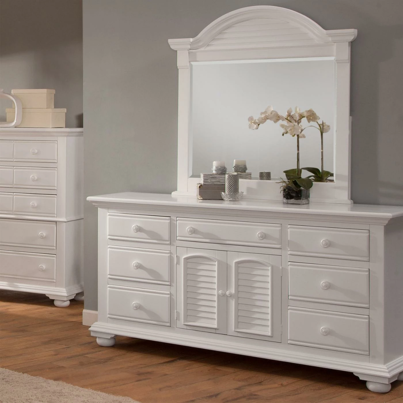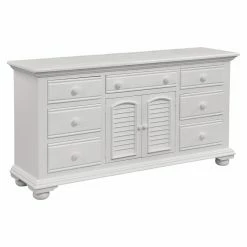 With a touch of coastal appeal, the Cottage Traditions 7 Drawer Triple Dresser – Eggshell White will make a wonderful addition to your bedroom. Made from pine solids and pine veneers, this triple dresser features seven spacious drawers and two doors with signature arched louvered inserts, as well as one adjustable shelf and distinct bun feet. This cottage-styled dresser โย with an optional believed mirror โย is also highlighted by solid wood knobs and crown molding, which make the sandstone finish on the rich pine wood really stand out.
