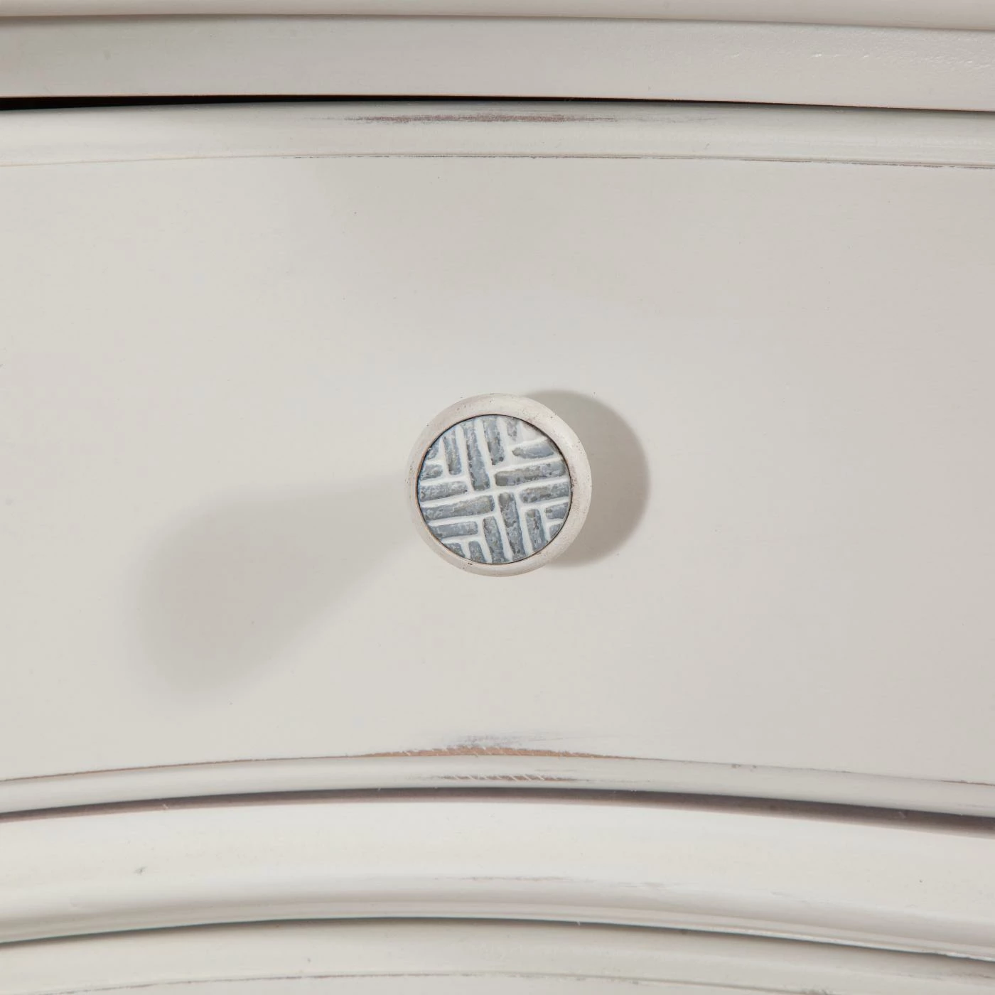 - Unique wooden knobs with white-washed pewter inset
