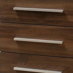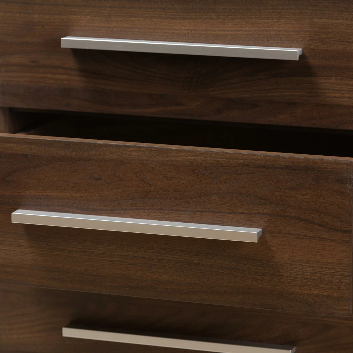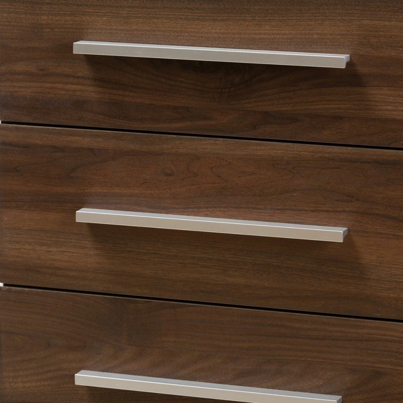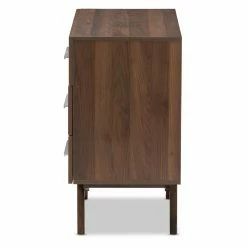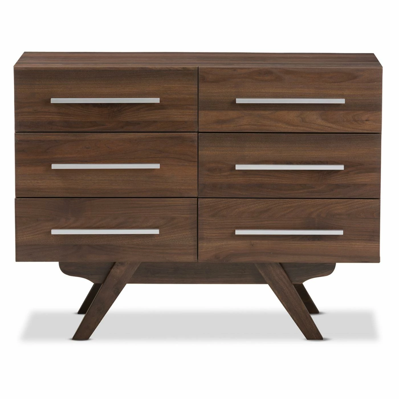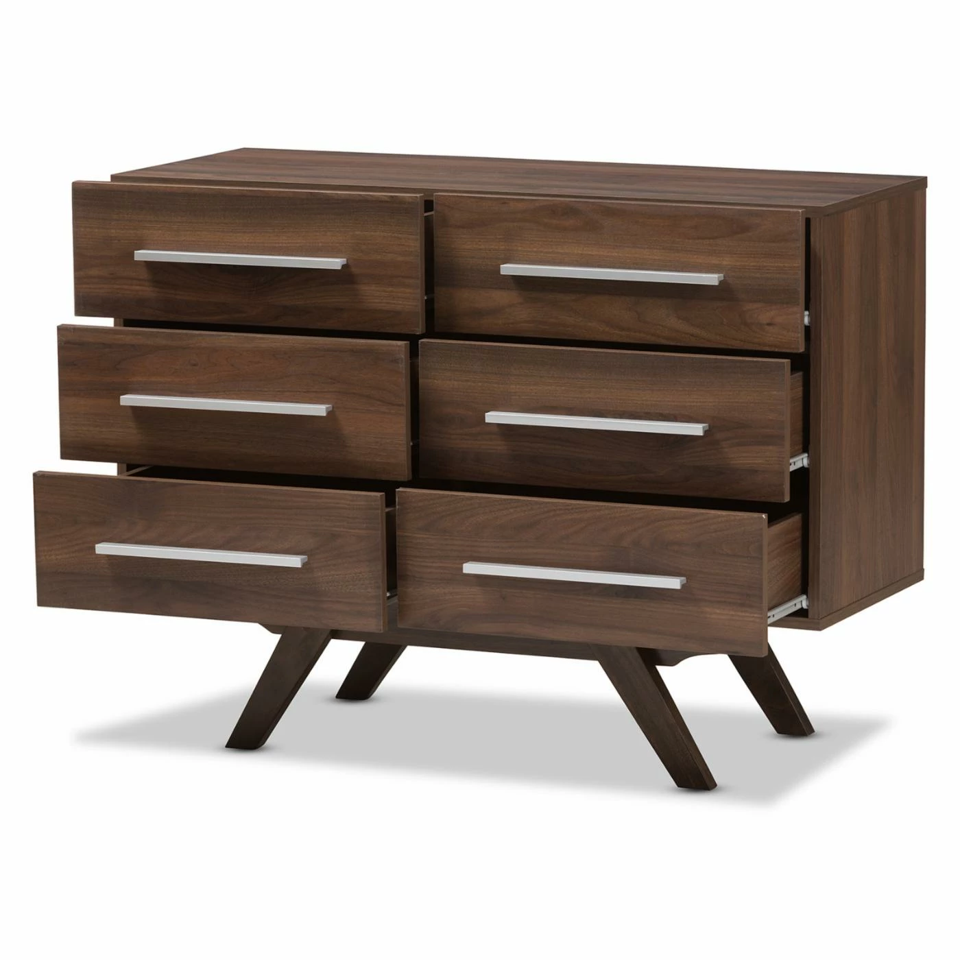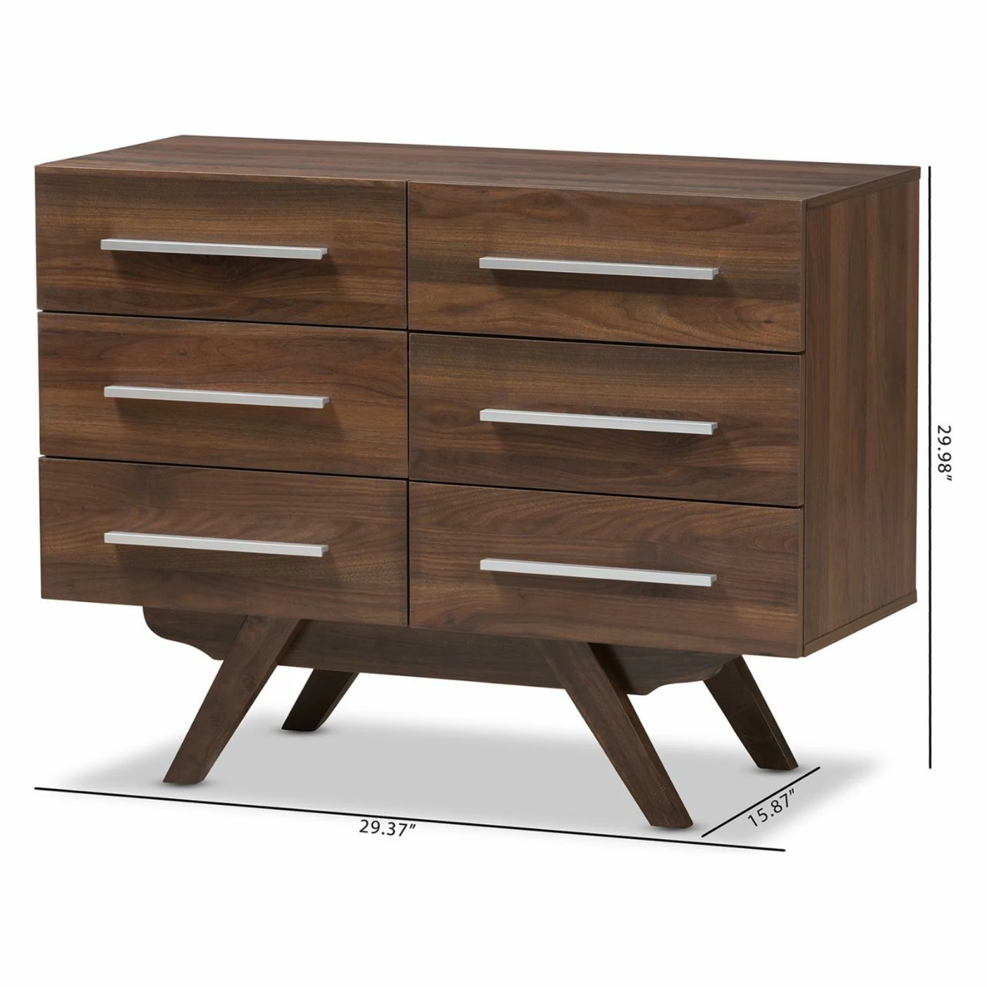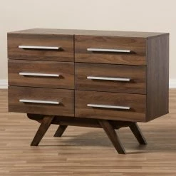 The Baxton Studio Auburn Mid-Century Modern Wood 6-Drawer Dresser features engineered wood in an attractive finish, with sleek metal hardware for a modern look. This sturdy six drawer chest provides plenty of storage for clothes, books, toys, and more. Use it anywhere in your home for a touch of modern understated style. Choose from available finish options.