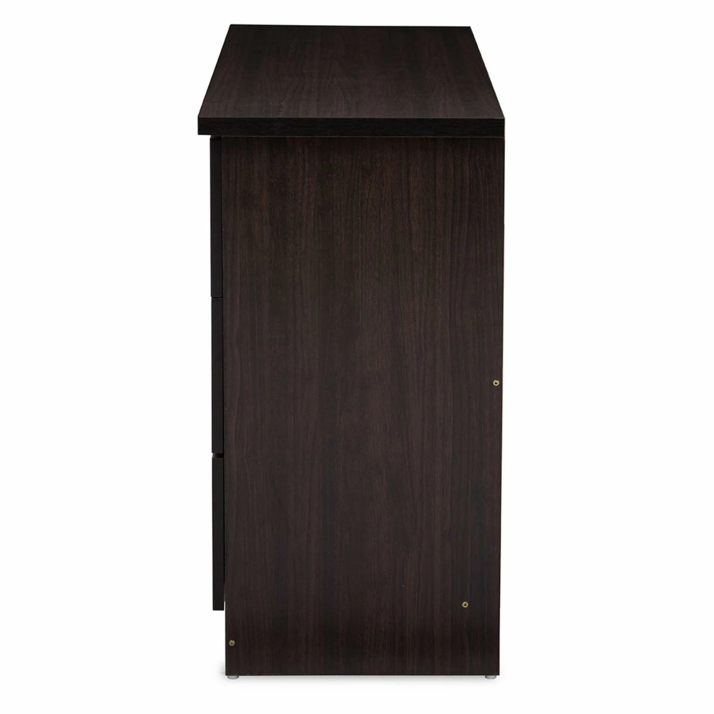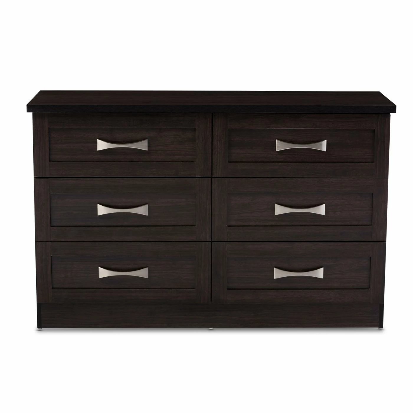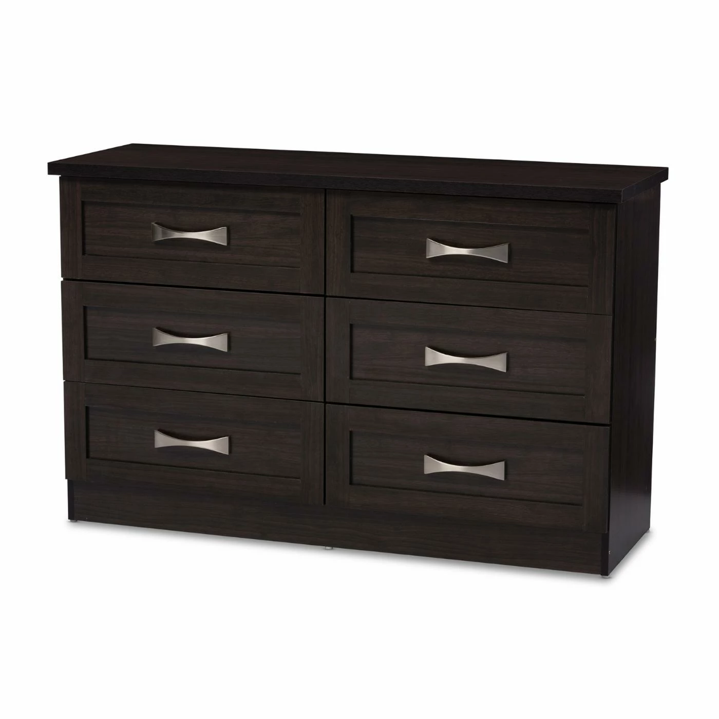 The Baxton Studio Colburn 6 Drawer Dresser – Wenge features a body of high-density, engineered wood boards with an exterior of polyurethane veneer that shows off the tight-grained appeal of wenge hardwood. That rich grain and warm color is contrasted by the flared shape of the brushed metal drawer pulls. Each of the six deep drawers features a roomy interior that slides out on smooth, metal rails. There’s more than one offering in the Baxton Studio Colburn collection, so check out the other pieces and see what the whole set can do to your space.