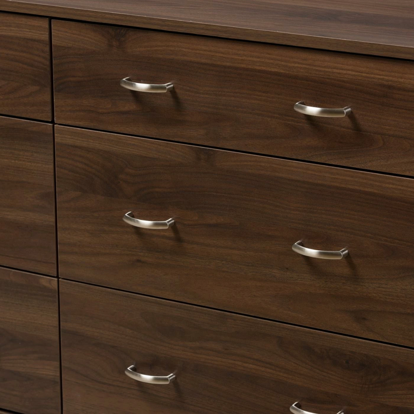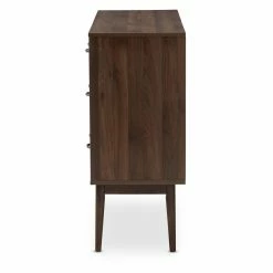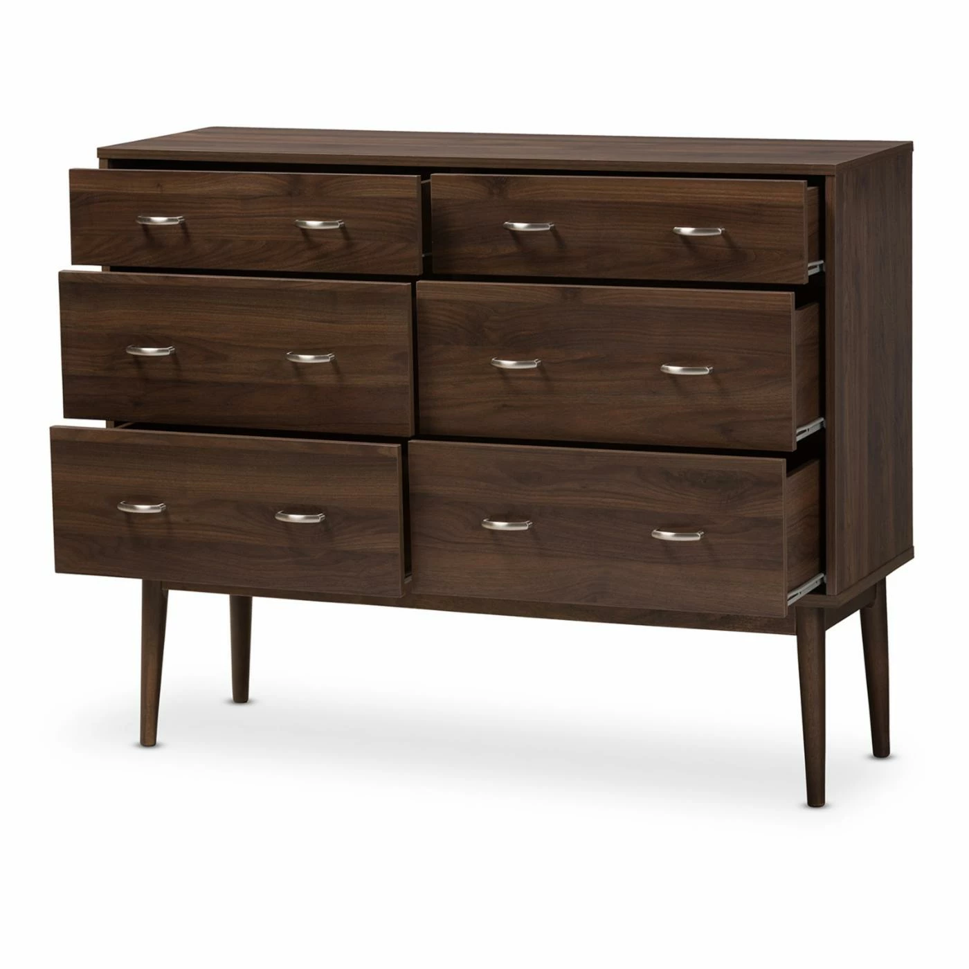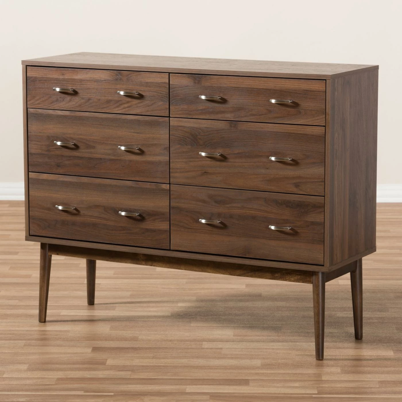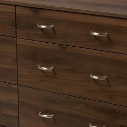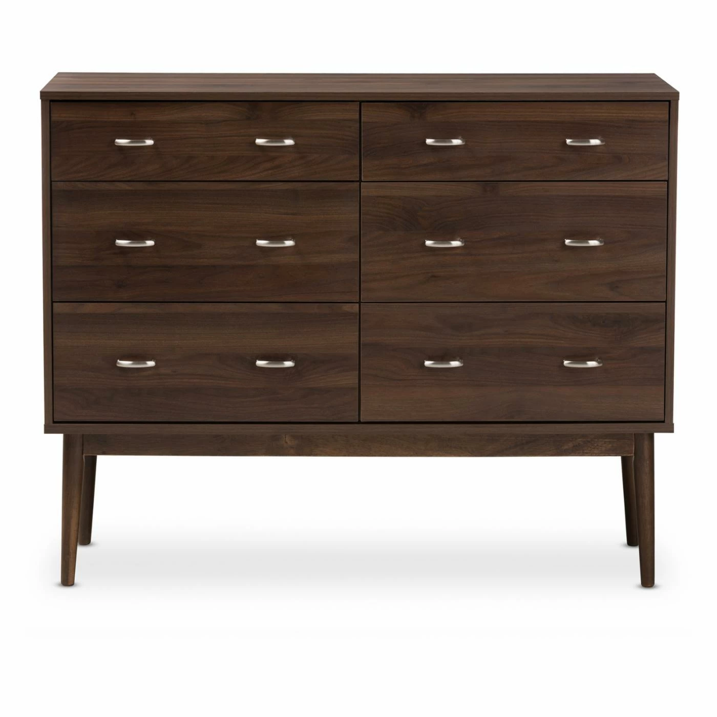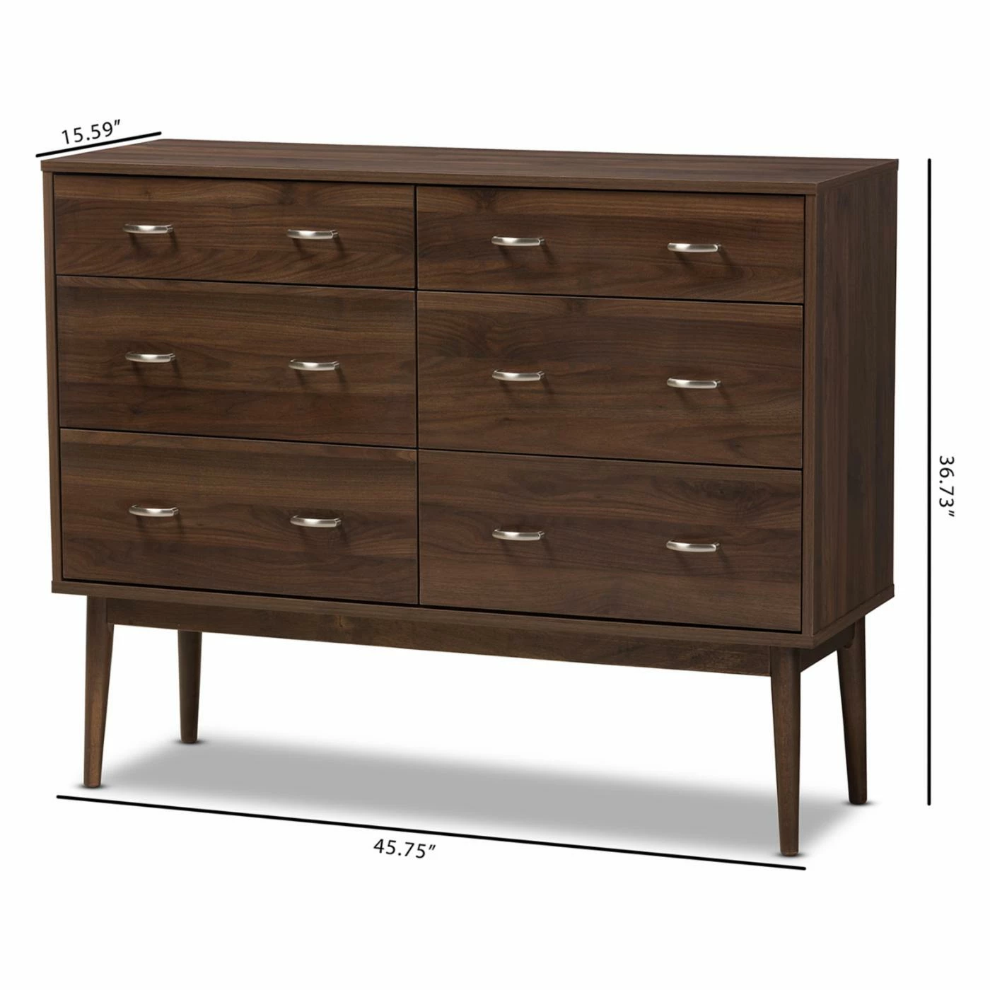 The Baxton Studio Disa Mid-Century Modern 6-Drawer Dresser features a six-drawer design to provide ample space for clothing and personal items. A rich walnut finish highlights the silver metal handles. Made from medium density fiberboard and particle board, this dresser is built to last.
