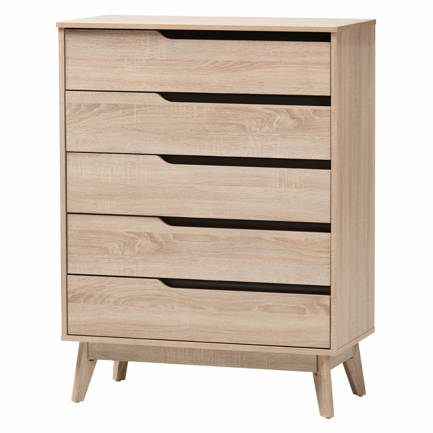 Quite the handsome fella, the Baxton Studio Fella 5-Drawer Chest is a great way to introduce mid-century modern style (with a hint of Scandinavian style) into your bedroom dΓ©cor. Crafted of engineered wood, this modern chest is finished in oak with streamlined inset handles in a gray finish. Angled legs add to minimalist allure, while metal glides on the drawers offer seamless movement.