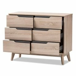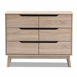 It’s easy to add contemporary, Scandinavian design elements to your bedroom thanks to the Baxton Studio Fella 6-Drawer Dresser. With a mid-century modern sensibility all its own, this dresser features an oak finish with gray inset handles on the six drawers. The contemporary dresser is crafted of engineered wood, while the drawers feature metal glides for smooth operation. Angled legs complete the style.