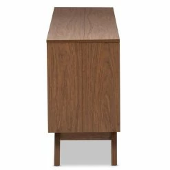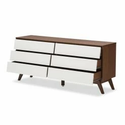 Six side-by-side drawers ensure this Baxton Studio Hildon 6-Drawer Storage Dresser will store all your clothing in style. This dresser is inspired by mid-century mod design and boasts clean lines, splayed legs, and unique slanted drawer fronts that lend a louvered look. A two-toned walnut and white finish and sturdy center-mounted leg complete this dresser.