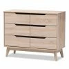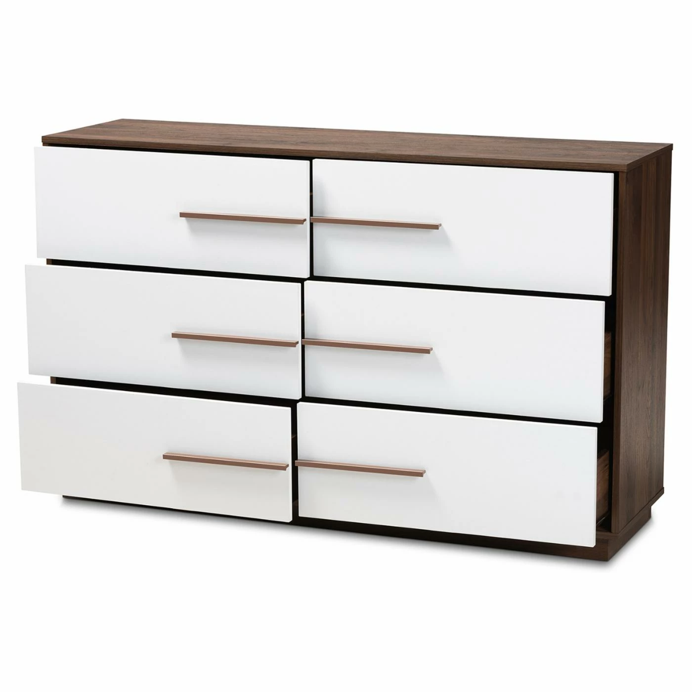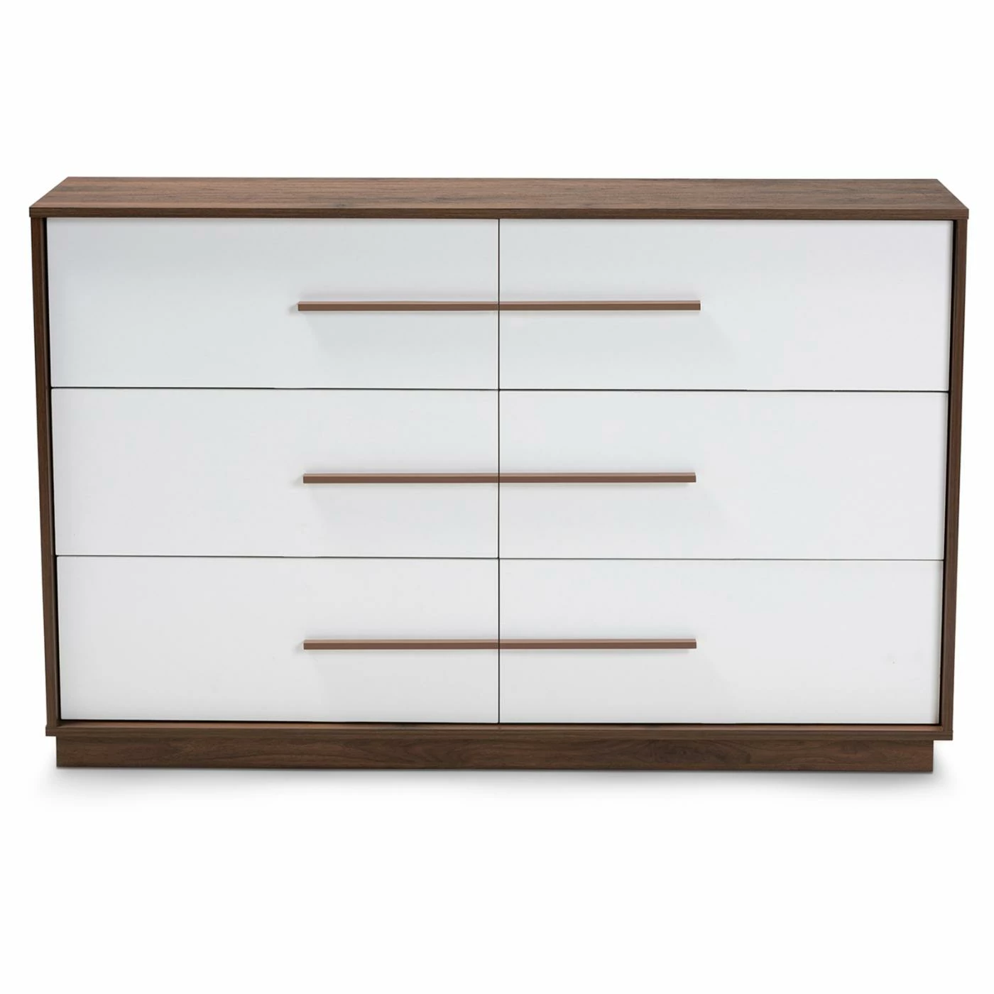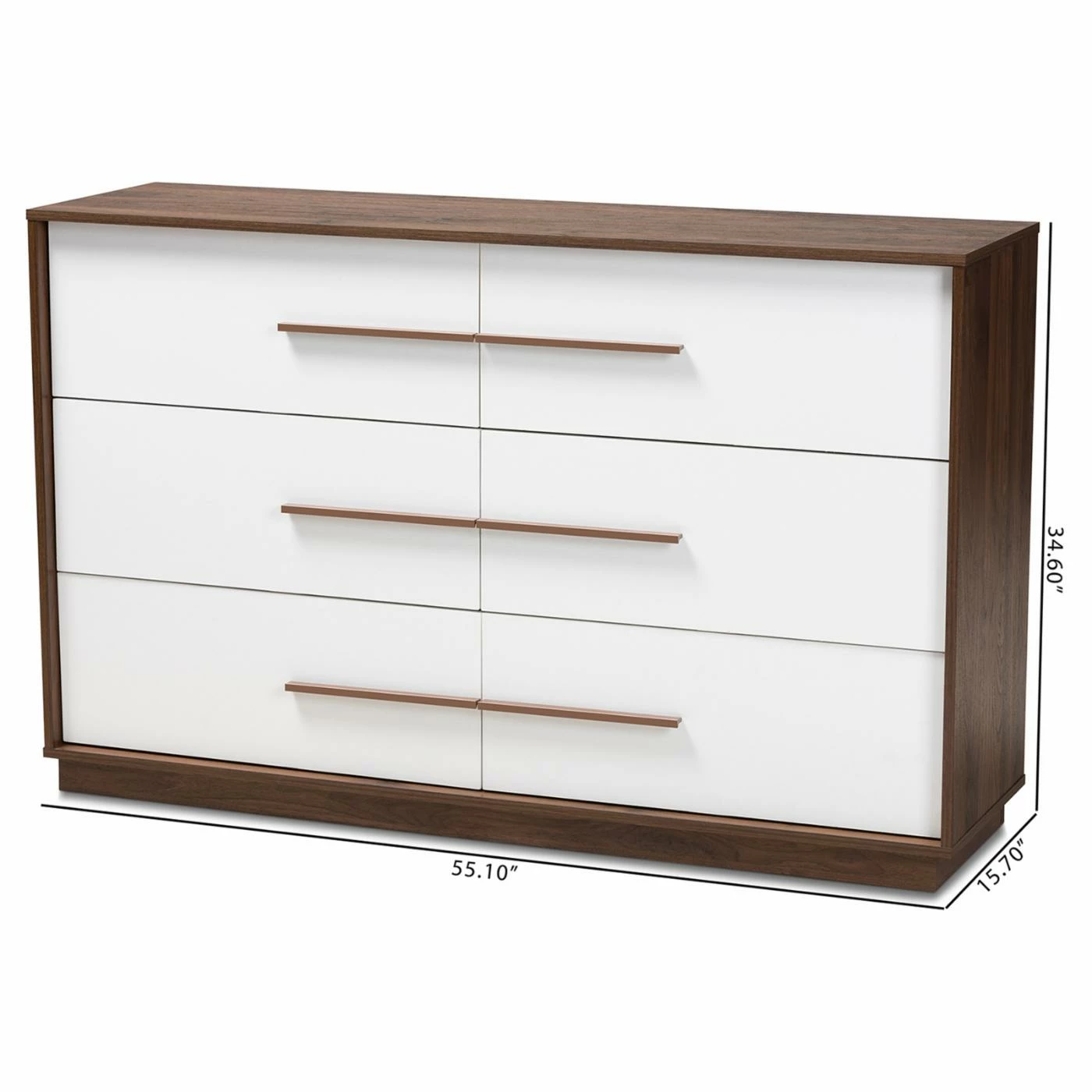 Elevate your bedroom with the Baxton Studio Mette Two-Tone Finished 6 Drawer Wood Double Dresser with Centered Handles. This mid-century modern inspired piece is made from sturdy engineered wood for a durable frame. The natural walnut finish of this chest of drawers is complemented by white drawer fronts and the statement handles on all six sliding drawers. The brown horizontal pulls are neatly centered on this piece for a sense of tranquil symmetry – a lovely sight to see each morning when you wake up. Some assembly required.