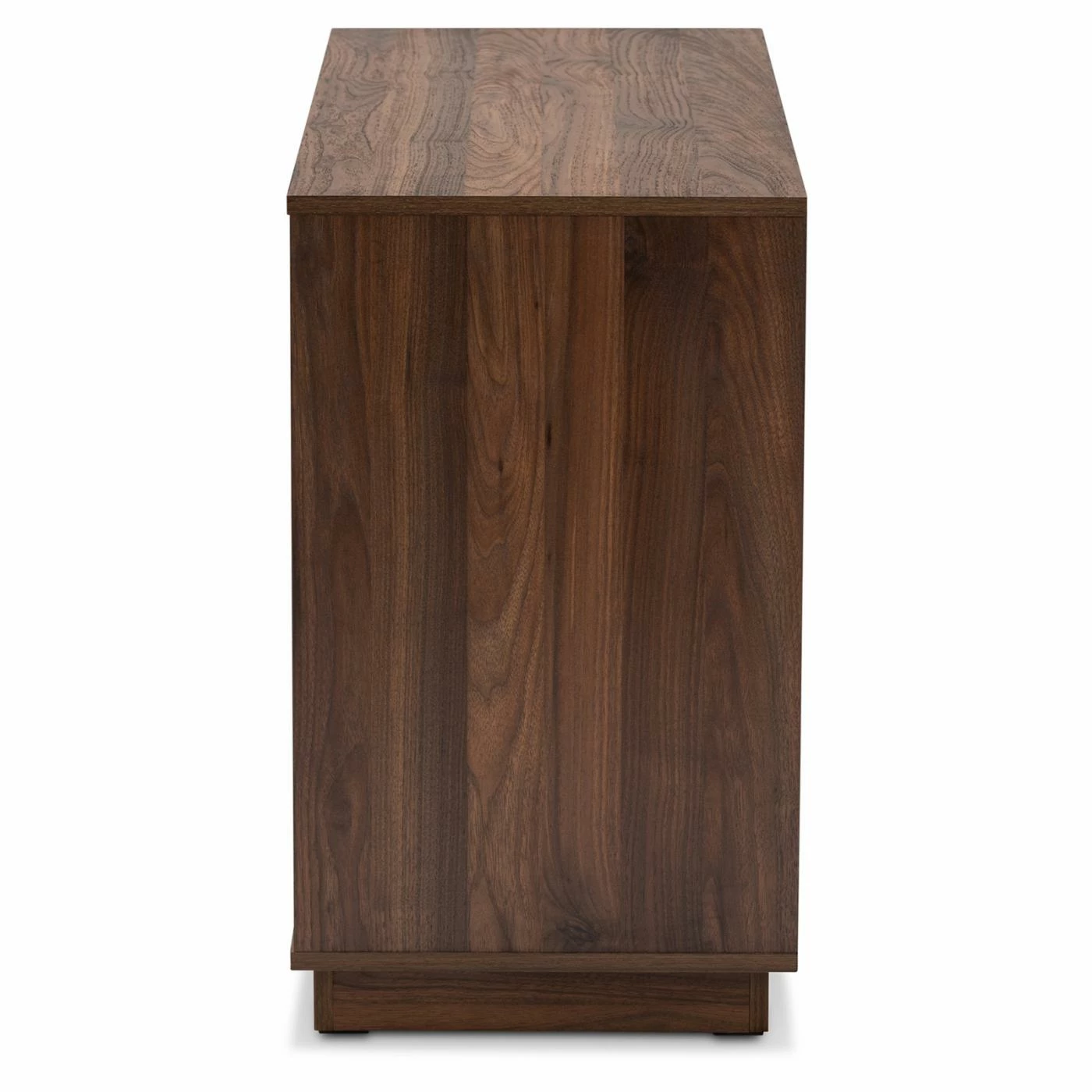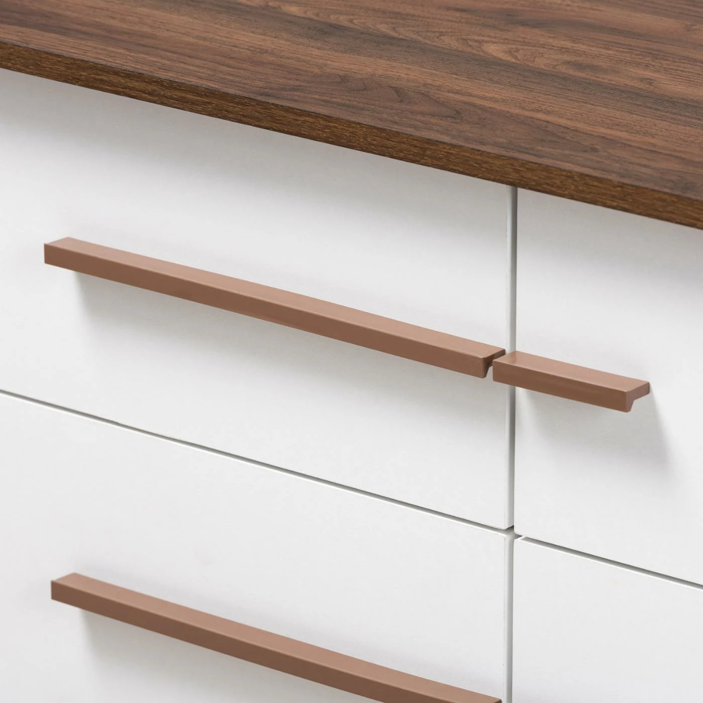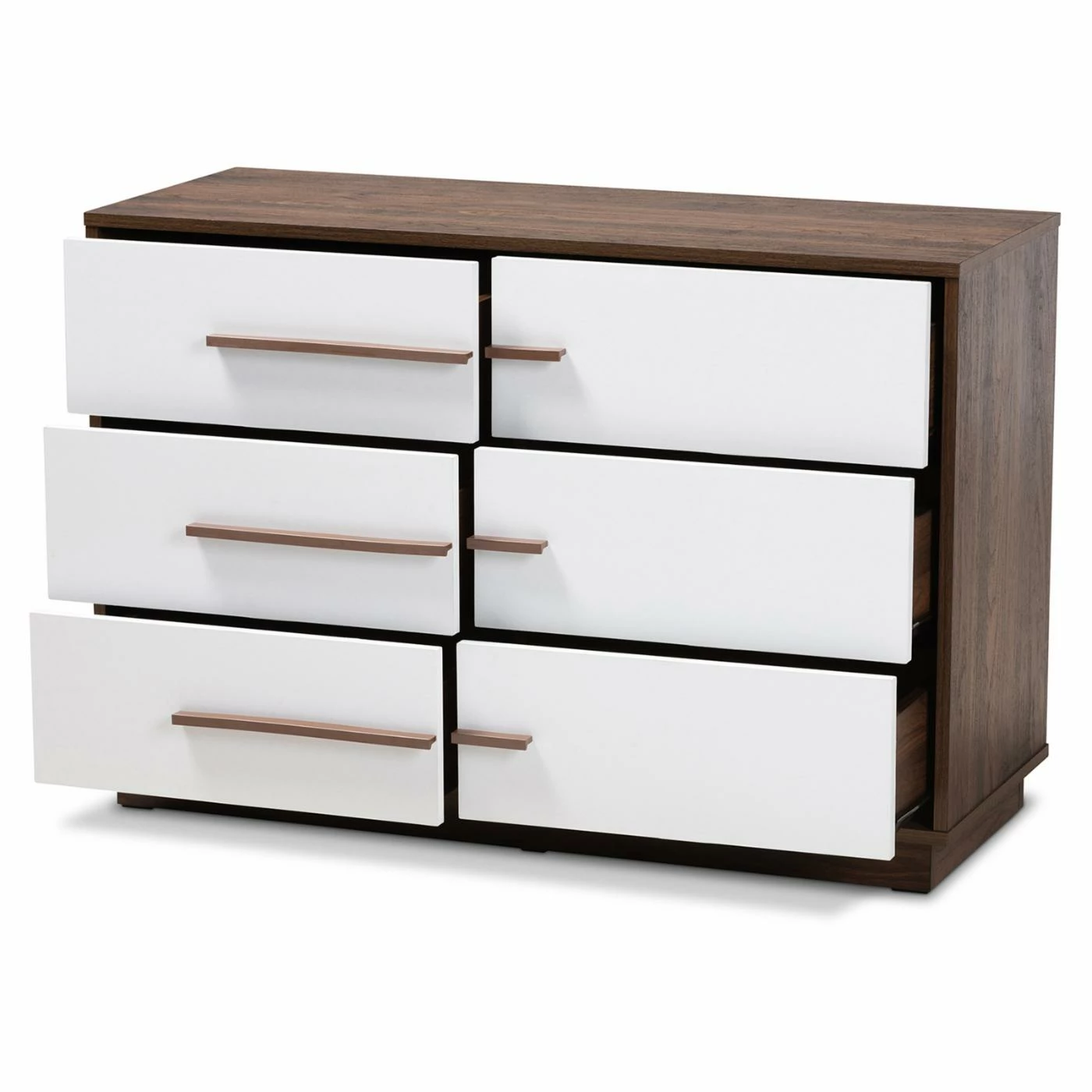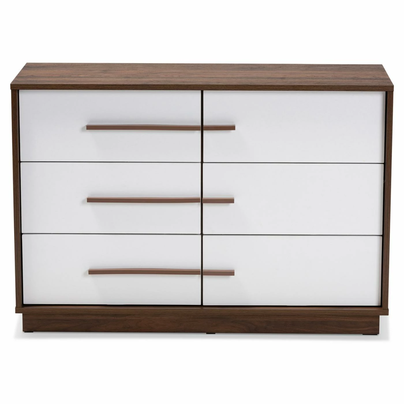 The pinnacle of clothing organization is the Baxton Studio Mette Two-Tone Finished 6 Drawer Wood Double Dresser. This dresser is both easy to organize and functionally stylish. The engineered wood of the frame is sturdy – this piece is built to last. The natural walnut finish is offset by sleek white drawer fronts. The six sliding drawers add plenty of spacious storage for your shirts, socks, and anything else you might need to get ready for the day. The sleek brown horizontal pull handles are arranged just off-center for an asymmetrical piece of furniture that’s as much art as it is easy-to-use. Some assembly required.