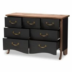 Elegant touches make the Baxton Studio Romilly 7 Drawer Bedroom Dresser stand out. This wooden dresser boasts a two-tone black and oak finish over the striking serpentine shape. Seven drawers offer ample storage space. Gold-finished metal pulls complete the drawer fronts of this farmhouse-style dresser.