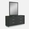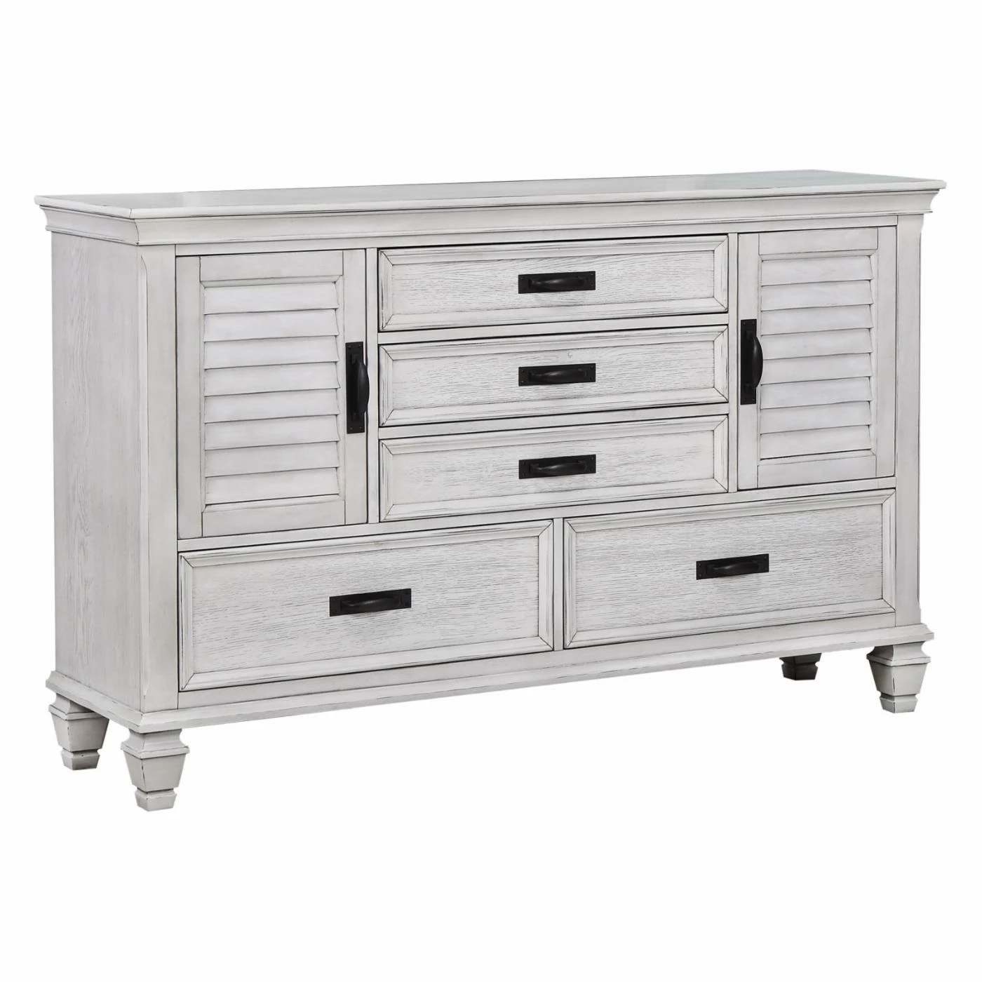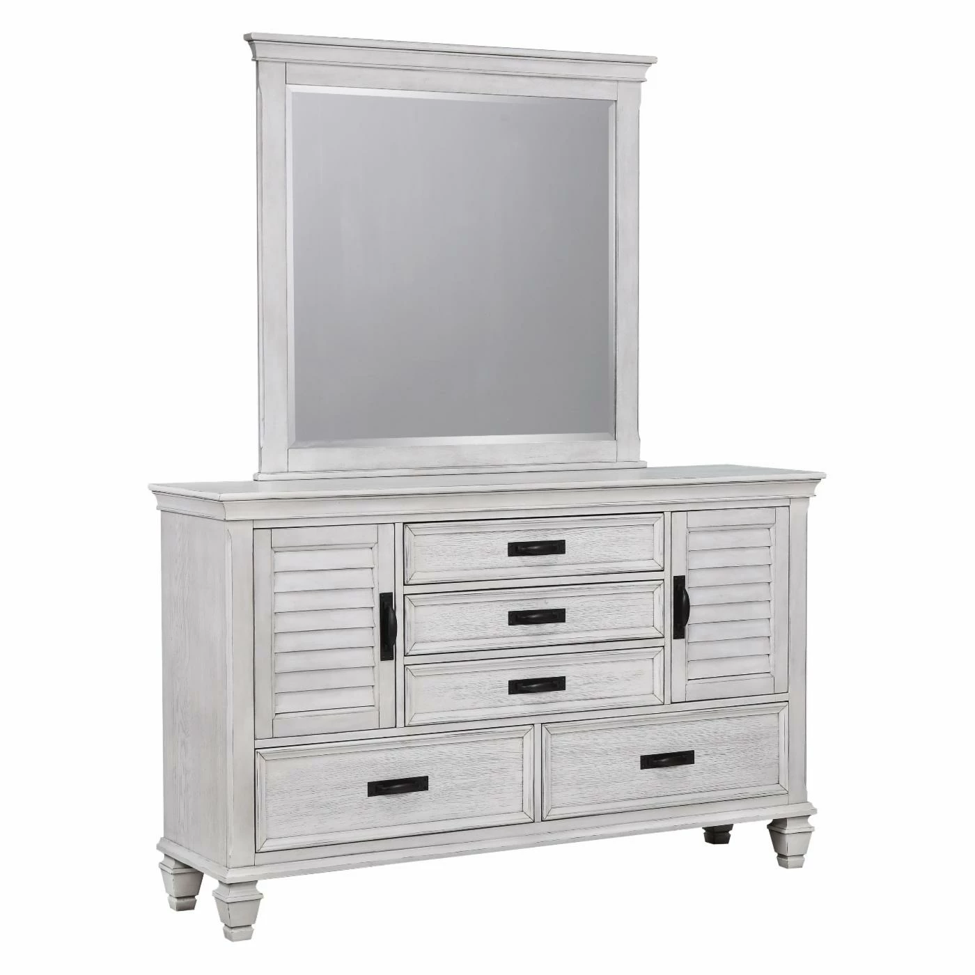 Enjoy a coastal vibe year-round with the Coaster Furniture Liza 5 Drawer Dresser. Made from solid hardwood and white oak veneers, this dresser and mirror combo features an antique-white finish and black hardware. Seven spacious storage compartments provide lots of room for everything you need, while self-closing guides provide maximum durability. A gray felt-lined top drawer offers the perfect place to keep your valuables, while a detachable mirror provides two looks in one. This item comes with a manufacturer’s limited one-year warranty. Assembly required.
