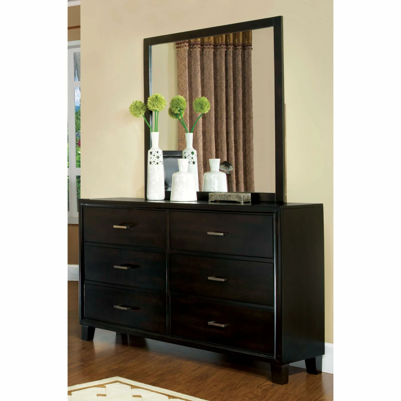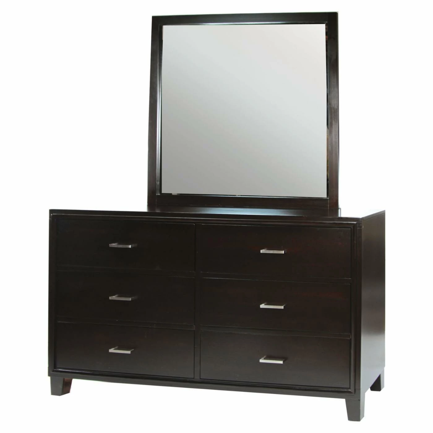 The Santrini 6 Drawer Dresser โ Espresso features an elegant transitional style of clean lines and rich espresso color, including wide drawers complemented by sleek metal bar pulls. This durable wood dresser offers plenty of storage space for clothes and bedroom articles, and comes with the option of a matching dressertop mirror.