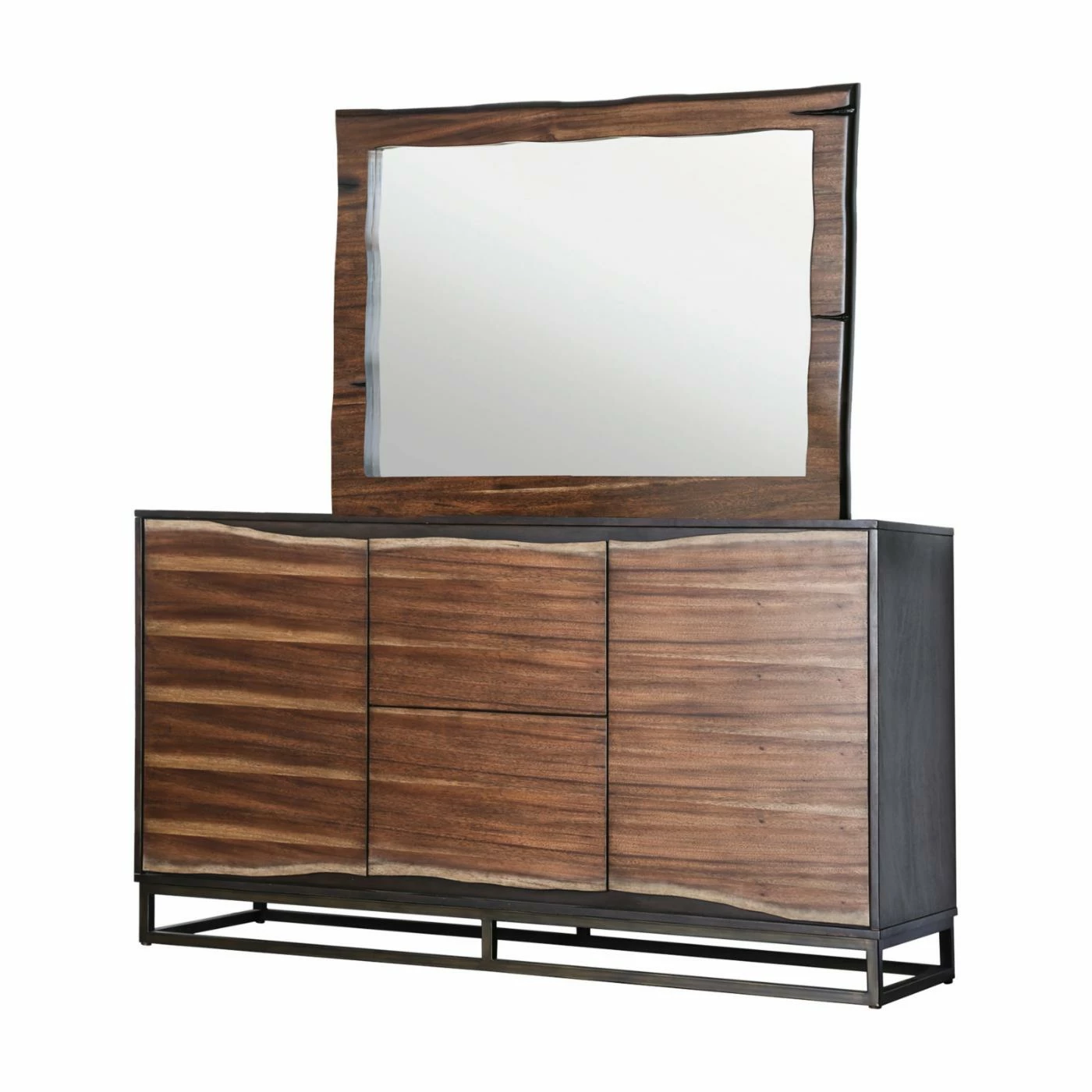 Burnt and split reclaimed wood gives the Furniture of America Trippen Live Edge 2 Drawer Dresser its rustic beauty. A live edge frame and open metal base gives this dresser its natural aesthetic. Two cupboard doors, multiple interior shelves, and two roomy drawers make it as handy as it is handsome. The dresser includes a live edge-inspired mirror that attaches securely to the back.