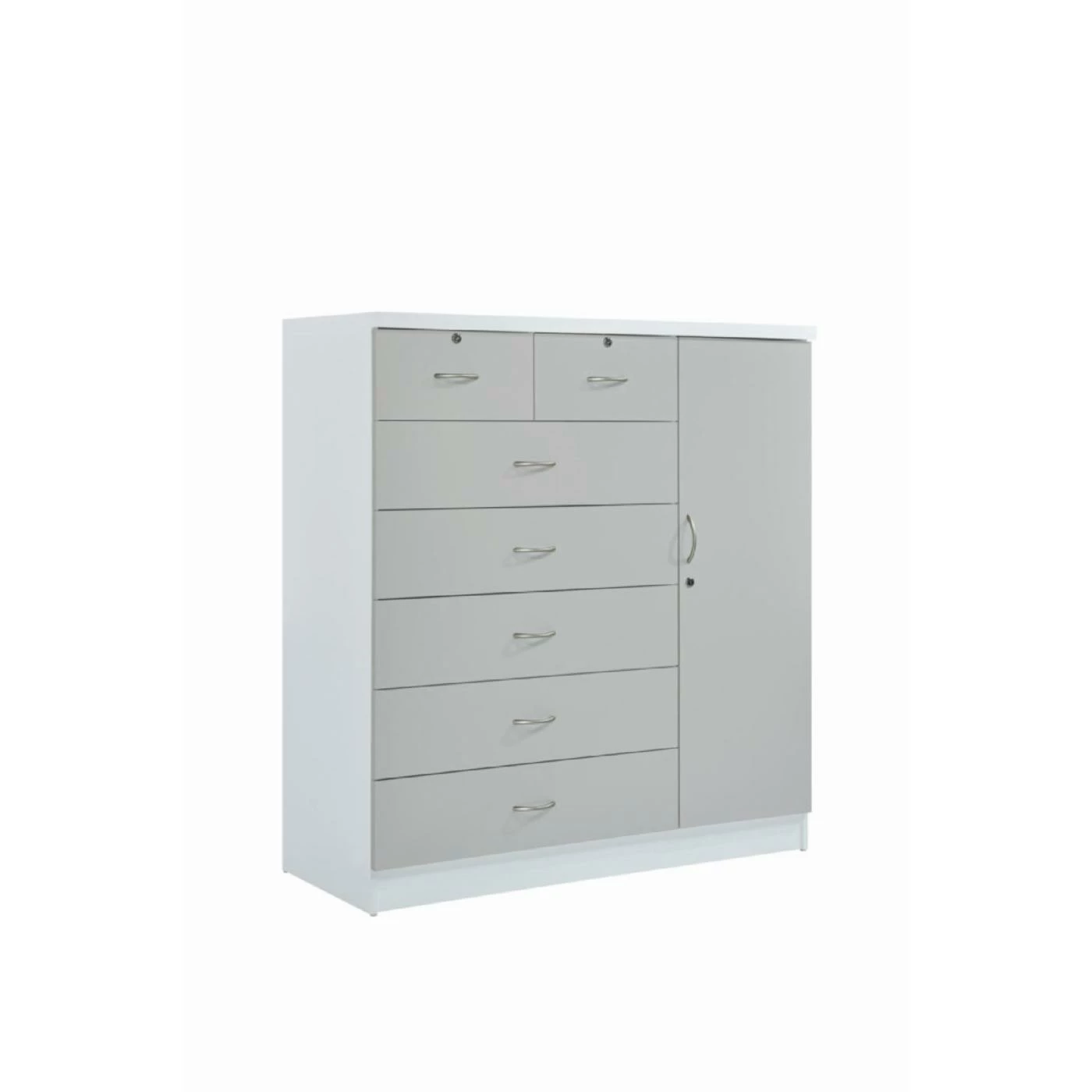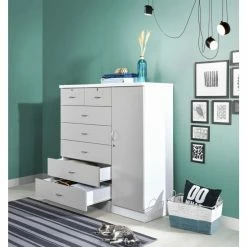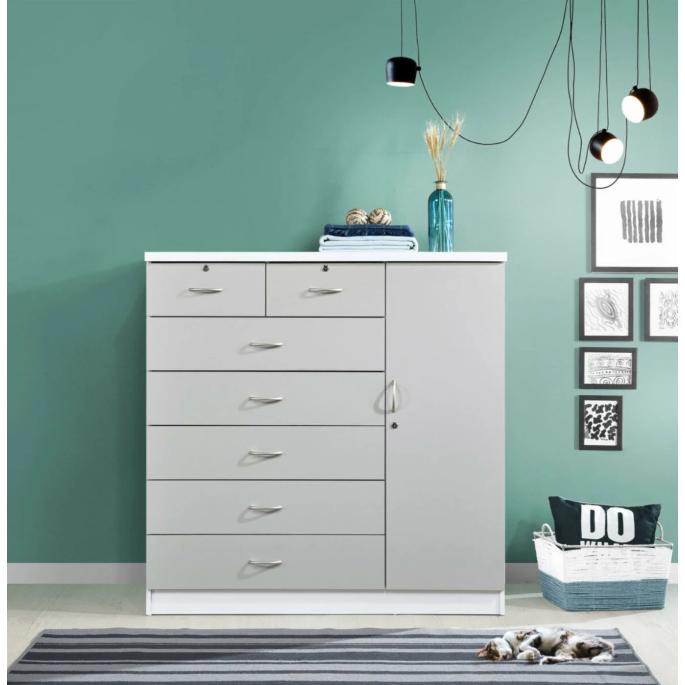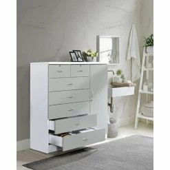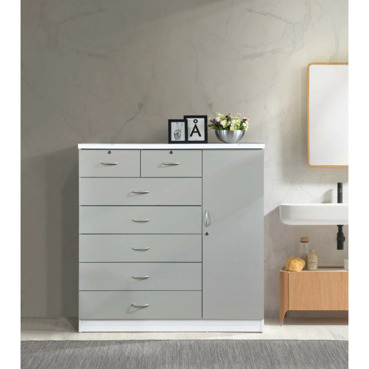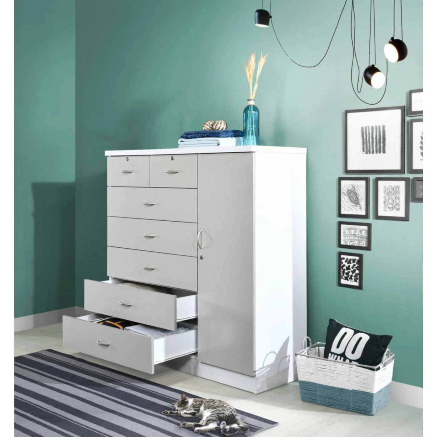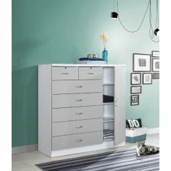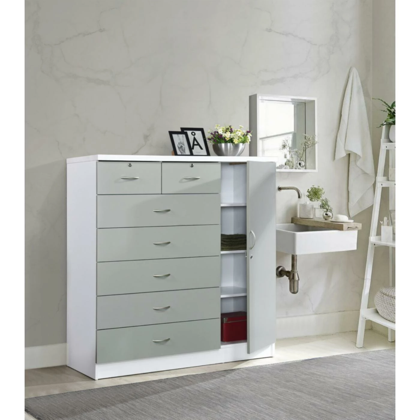 The Hodedah 7-Drawer Chest provides ample organization for your wardrobe. This contemporary chest boost a simple, sophisticated design yet it is a versatile piece for your home. Best suited for your master bedroom or guest room, this bachelor’s chest can house your folded clothing, linen, undergarments and much more. Featuring seven drawers, five large and two small plus a side door, when open reveals 3 shelves. Both small drawers and side door are secured with locks, keeping your valuable items safe. Our drawers are reinforced with support under all seven drawers to handle extra weight. Laminated in a variety of finishes, you are sure to find the perfect color to blend with your room decor. Up the aesthetic by topping this simple chic chest with an abstract sculpture or large framed family photo.