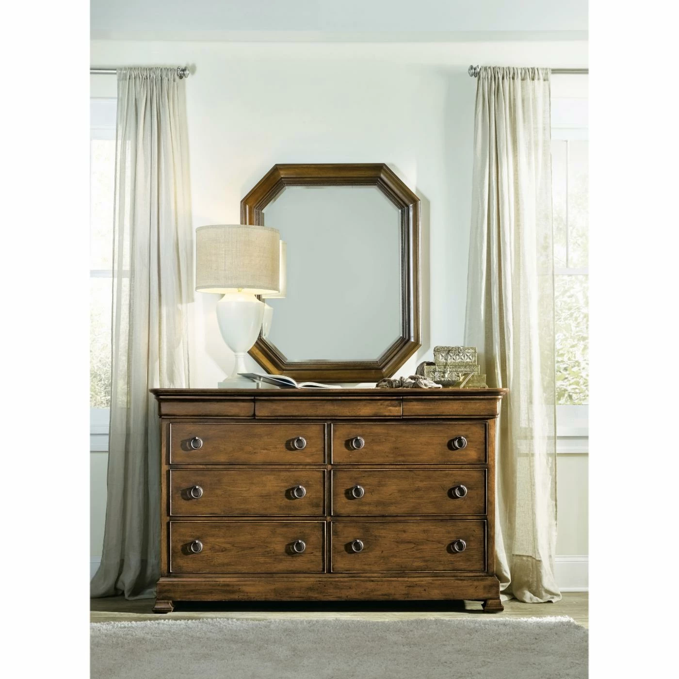 The Hooker Furniture Archivist 9 Drawer Dresser protects your clothes and belongings on the inside while it maintains a rich history of old-world furniture on the outside. This piece is crafted from solid rubberwood with an exterior of high-quality birch veneers. The nine-drawer design features cedar-lined bottom drawers to keep away nibbling insects. The bottom left drawer has a false bottom for hidden storage while the upper left drawer has a built-in jewelry tray. Each of the top drawers are also felt-lined for more delicate belongings. Each drawer is fitted with a metal ring pull that has an antique bronze finish. Choose from available finish options to make it yours.
