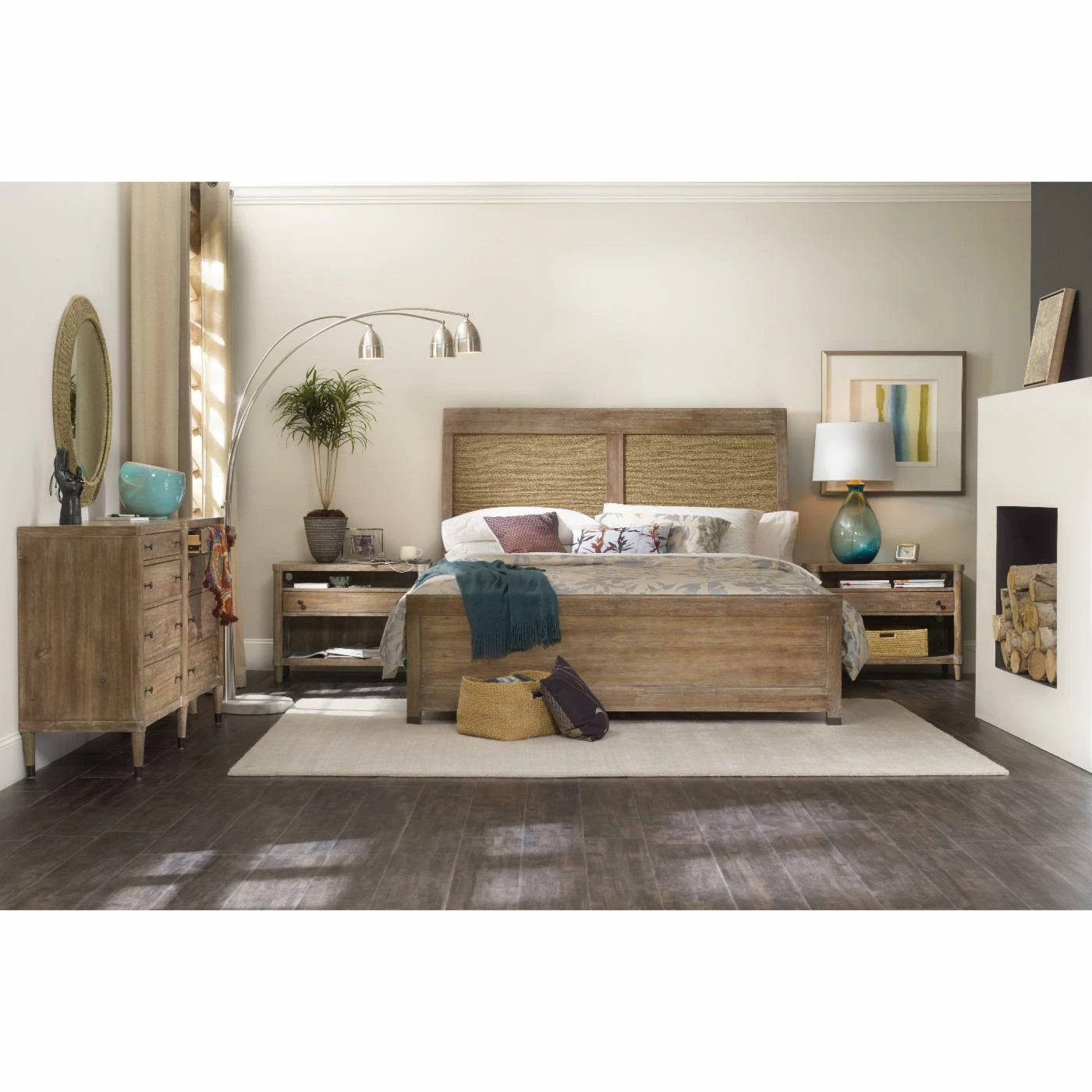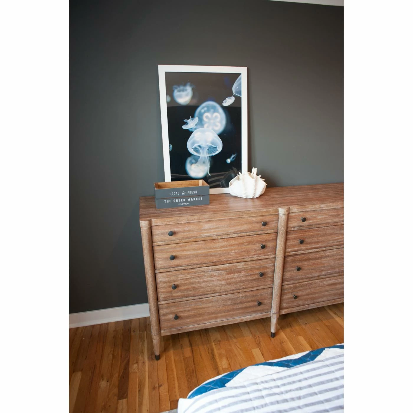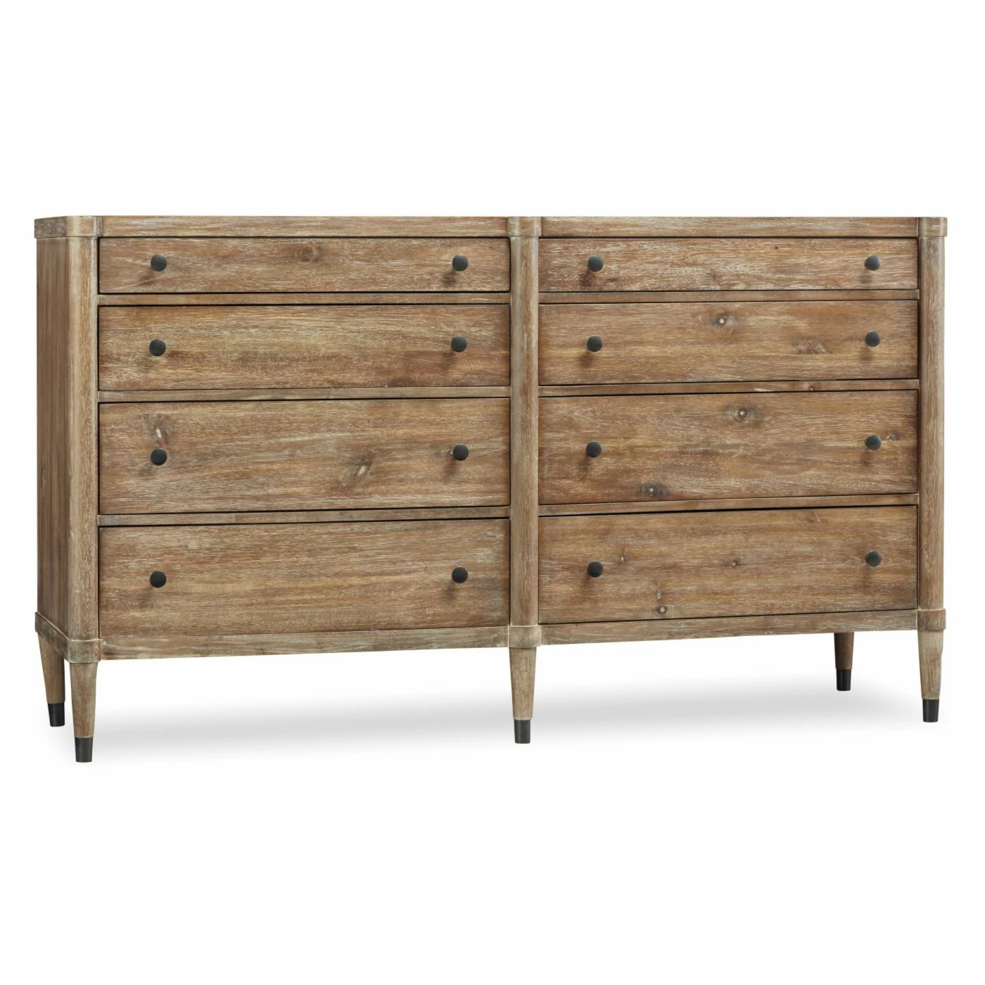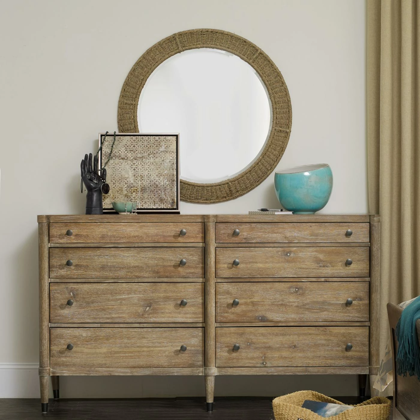The mid-century appeal of this Hooker Furniture Studio 7H Annika Dresser comes from its clean lines, tapered legs with dark metal ferrules, and smart storage. This dresser features eight side-by-side drawers, including top drawers with removable felt-linings and one with a removable jewelry tray. The two bottom drawers are lined in cedar to protect against moths. This dresser is well-built of acacia solids and veneers in a multi-step Scandinavian finish which is lightly distressed and ultra versatile. Add the optional, round rope mirror to make the look complete. The mirror attaches securely to the back of this dresser.