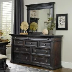 The grandly scaled Hooker Furniture Treviso Dresser is well-built of spruce solids and rustic pine veneers in a dark macchiato finish with rub-through that lends an antique appeal. This romantic Italian Renaissance-inspired dresser boasts nine drawers. The top left drawer has a felt-lined tray while the right top includes a felt-lined jewelry tray. The bottom two drawers are lined in cedar. Custom knobs and ring pulls feature ornate back plates in an aged pewter finish that lends a hand-forged look. Complete the look by adding on an optional mirror. There are select size options and each attaches to the back of this dresser.