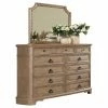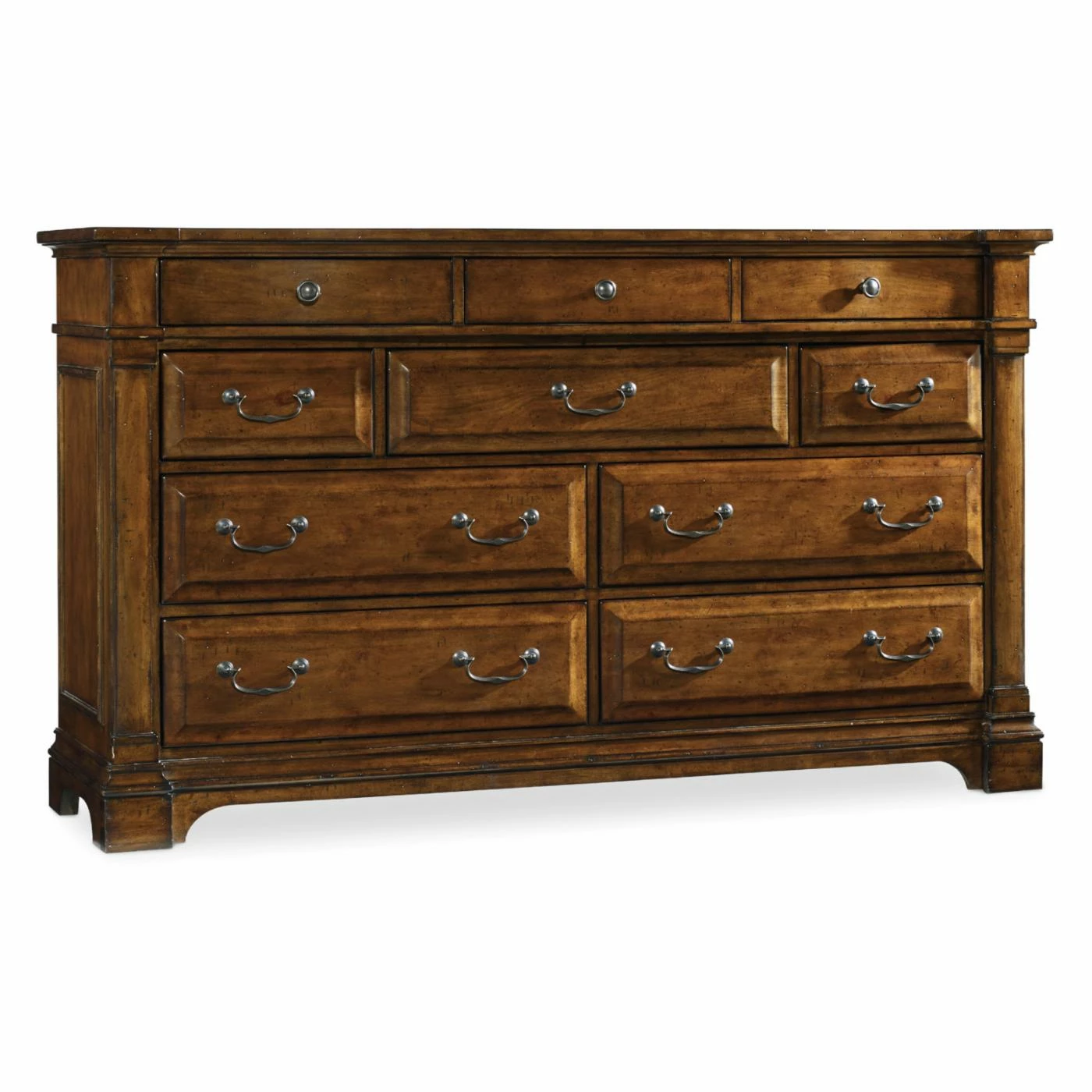This Hooker Furniture Tynecastle Dresser blends classic Georgian architectural details with rustic timber-frame elements for a English country flavor. The dresser is crafted of poplar solids and figured alder veneers in a medium brown finish applied using a multi-step process that includes hand finishing. This storage-rich dresser features 10 smooth-gliding drawers, most with beveled fronts and all include decorative hardware. The top three drawers are lined in felt to protect delicates and the center features a jewelry tray. The bottom drawers are lined in cedar to protect sweaters or blankets. Add on the optional landscape mirror to make this dresser complete.