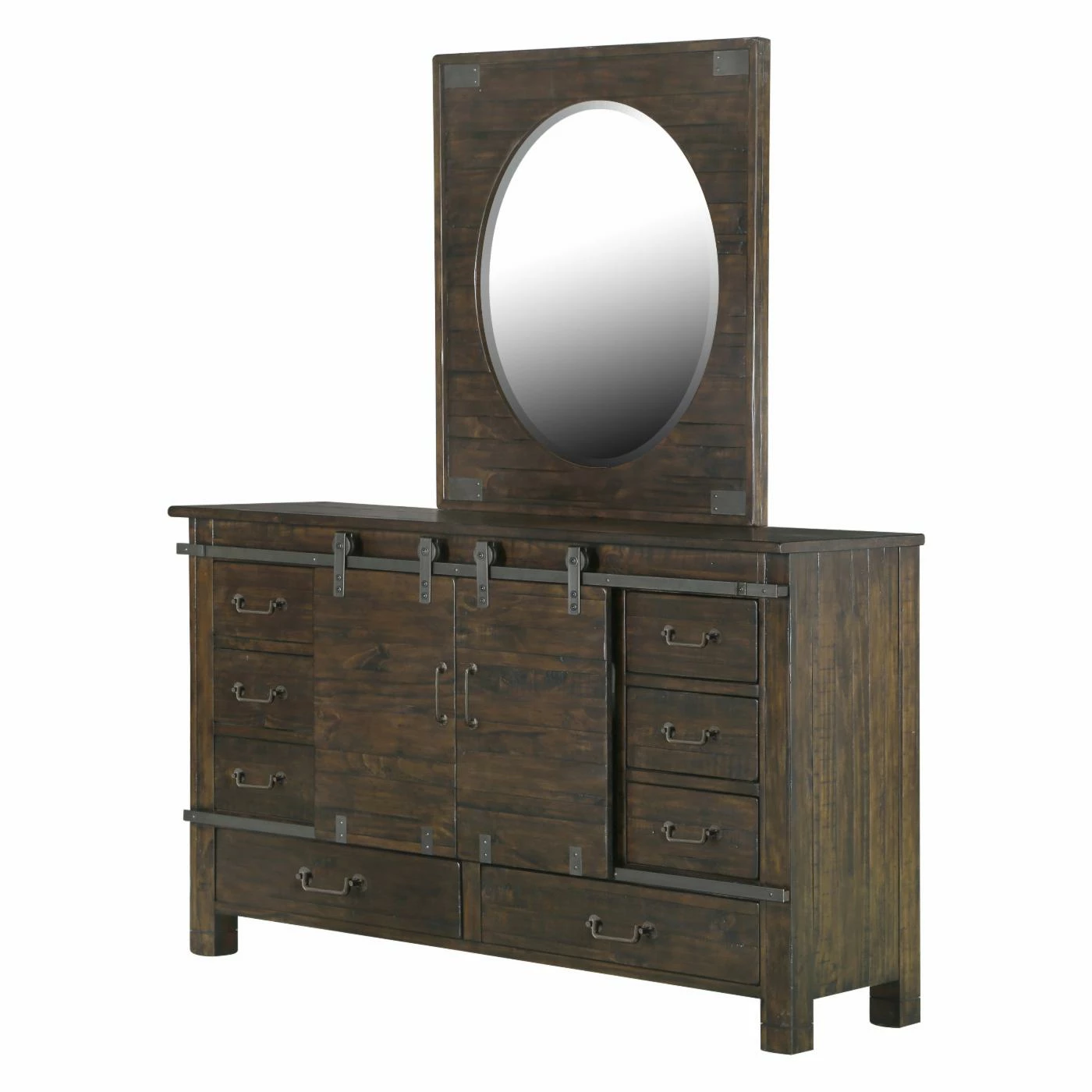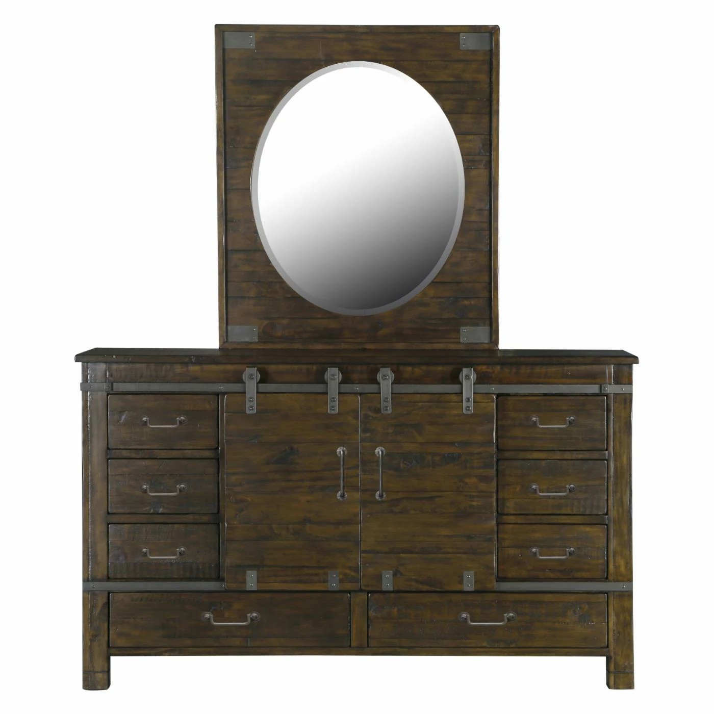 The Magnussen Pine Hill 8 Drawer Sliding Door Dresser with Optional Mirror combines rugged industrial styling with the warmth of a rustic pine finish. The simplicity of a classic Shaker design also comes into play, though with a twist; this dresser includes sliding doors that reveal cabinet space. Eight drawers provide enough space for your clothing, accessories, or other items. This dresser is available with two matching beveled glass mirror options to create a pulled-together space. A felt lining in the top drawers of this dresser ensures a soft habitat for your delicates.