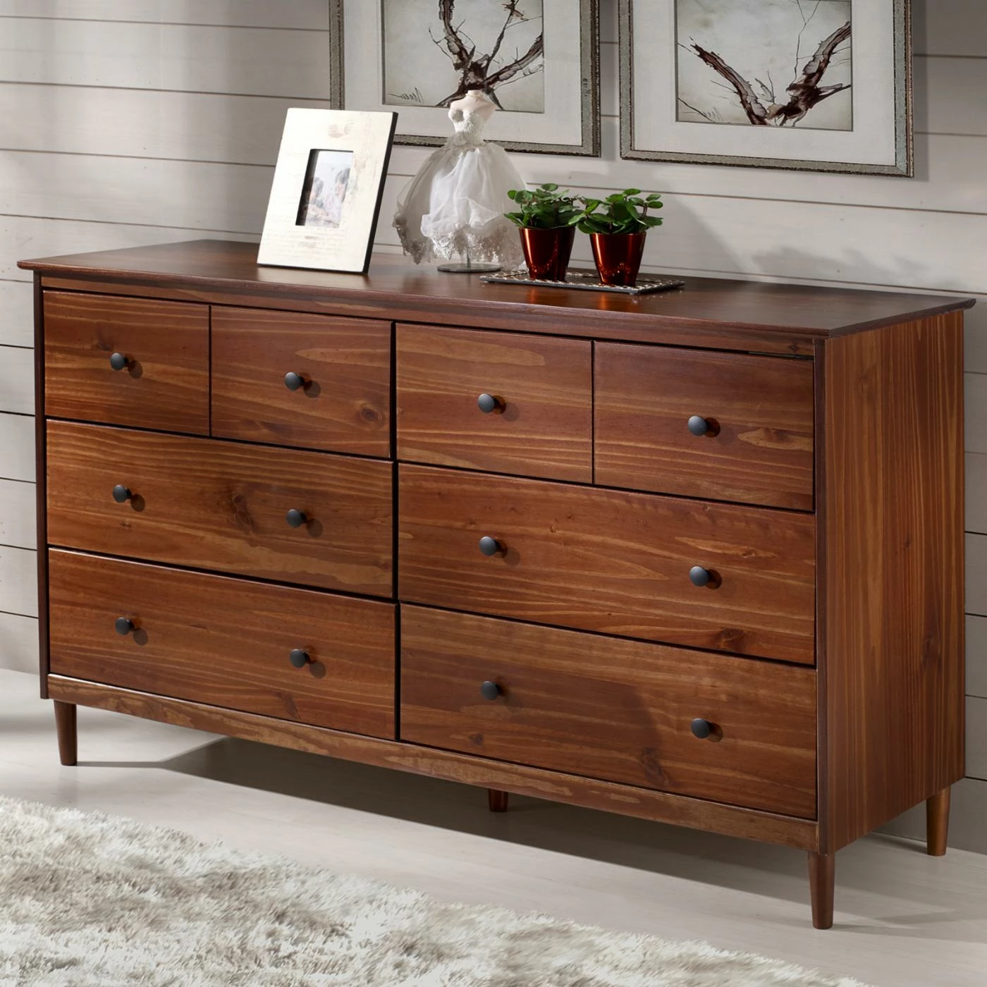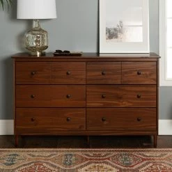 The Manor Park Classic Mid-Century 6 Drawer Dresser is designed to be your next bedroom statement piece. Mid-century modern styling is the hallmark of this dresser, with tapered legs and simple knob hardware on each of the six drawers. The dresser is constructed from responsibly harvested solid pine and engineered wood. Choose from available finishes to best suit your room’s color scheme.