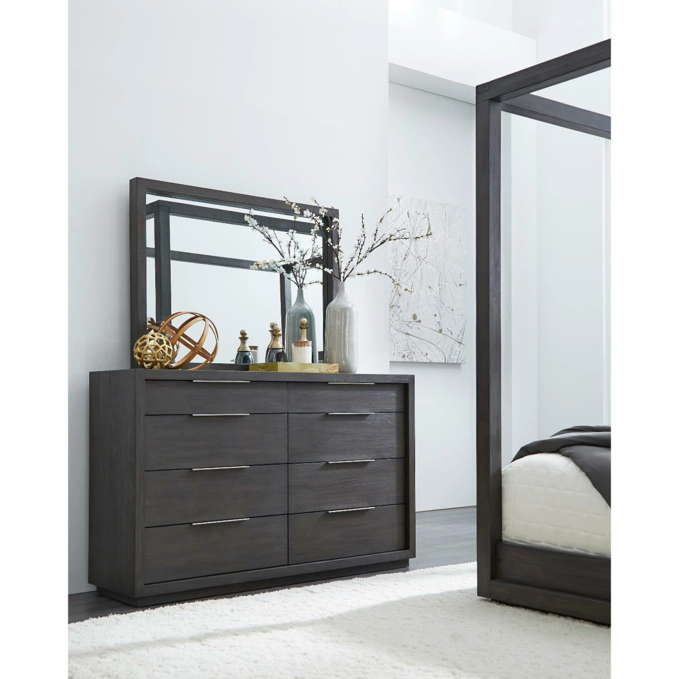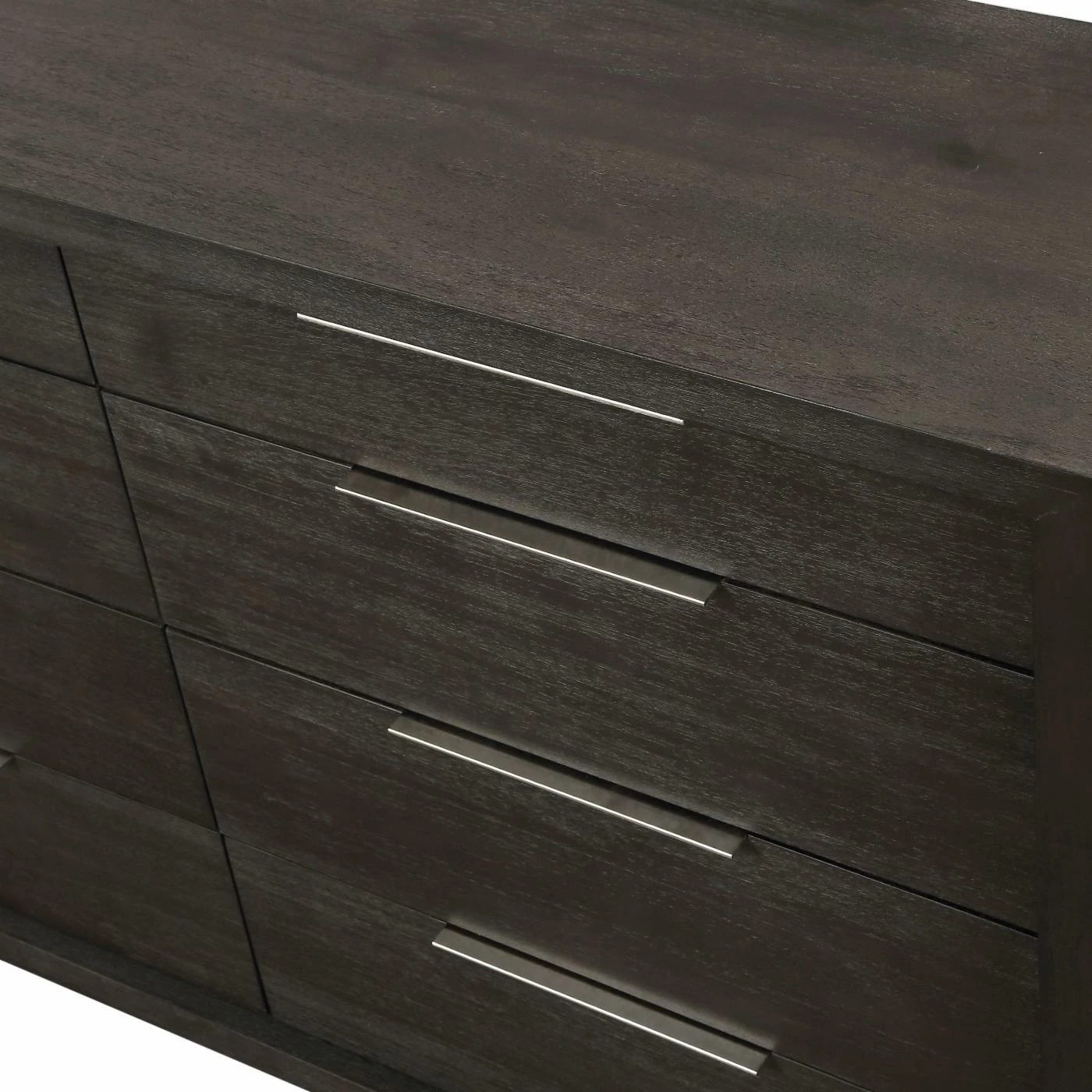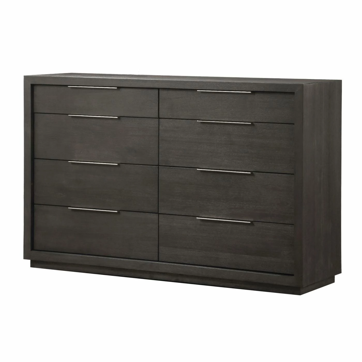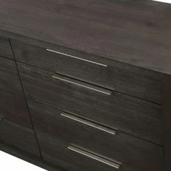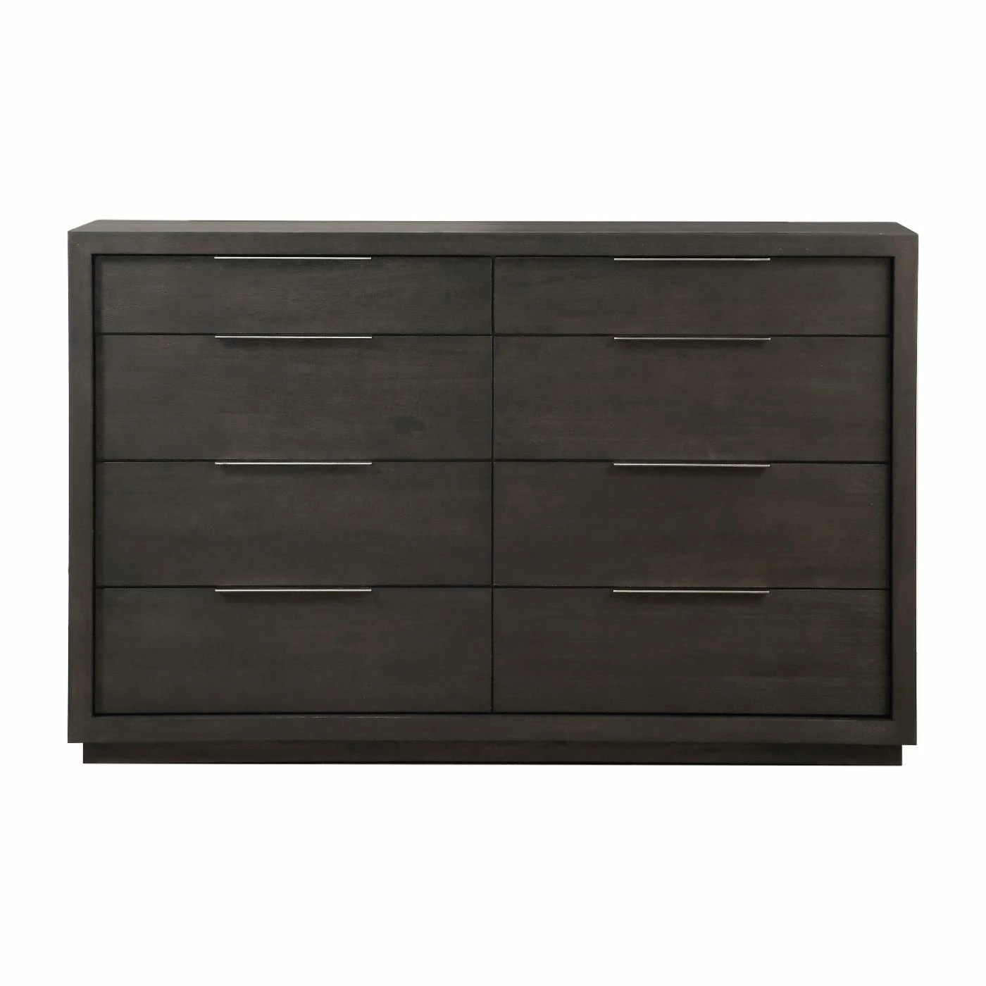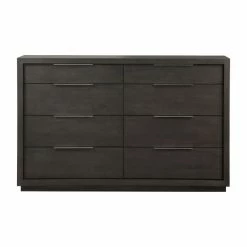 The sleekly tailored Modus Oxford 8 Drawer Double Dresser makes a striking first impression with bold proportions, crisp, modern lines and a weathered finish. Smartly accented with top-mounted nickel plated pulls, concealed footboard storage, and a floating plinth base. Available in Basalt Grey.