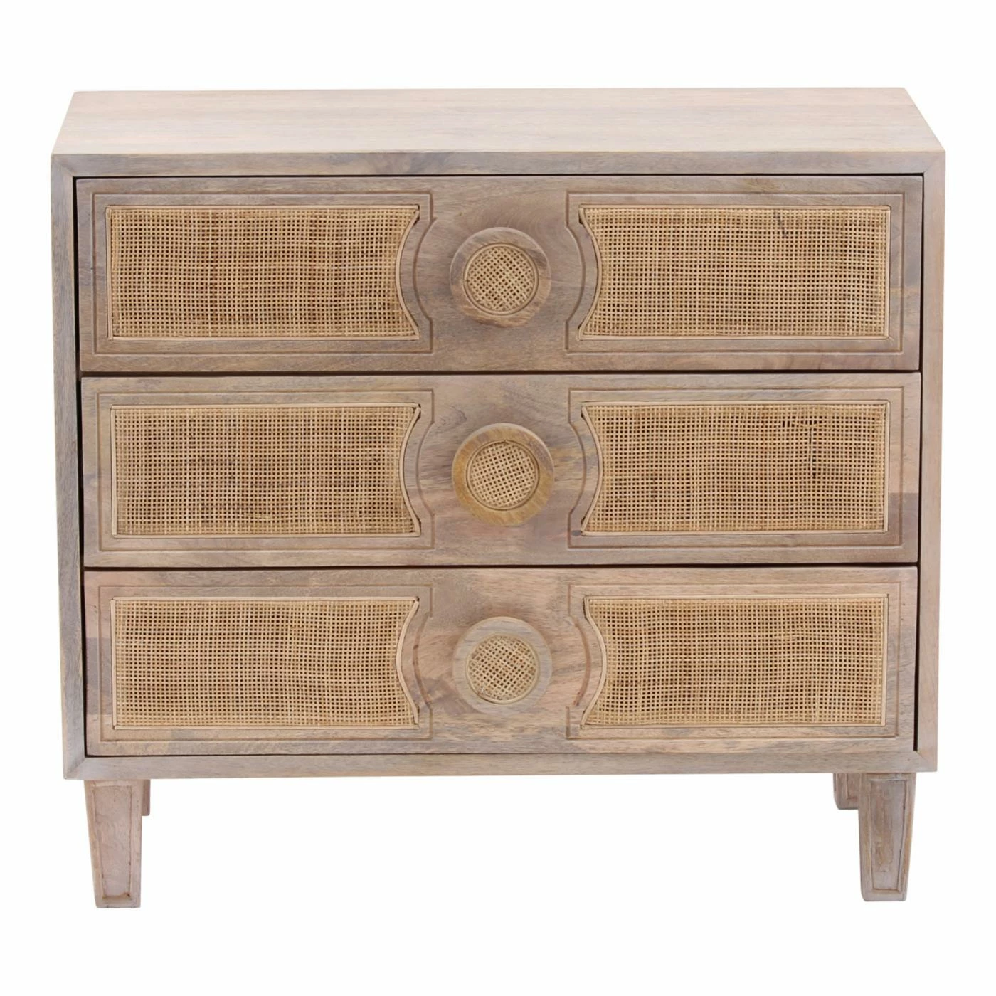 A stylish combination of solid mango wood and natural woven cane detailing give this dresser freshly refined Scandinavian style. With three spacious drawers help maximize storage for smaller bedrooms. Frame is made of solid mango wood. Some assembly is required.