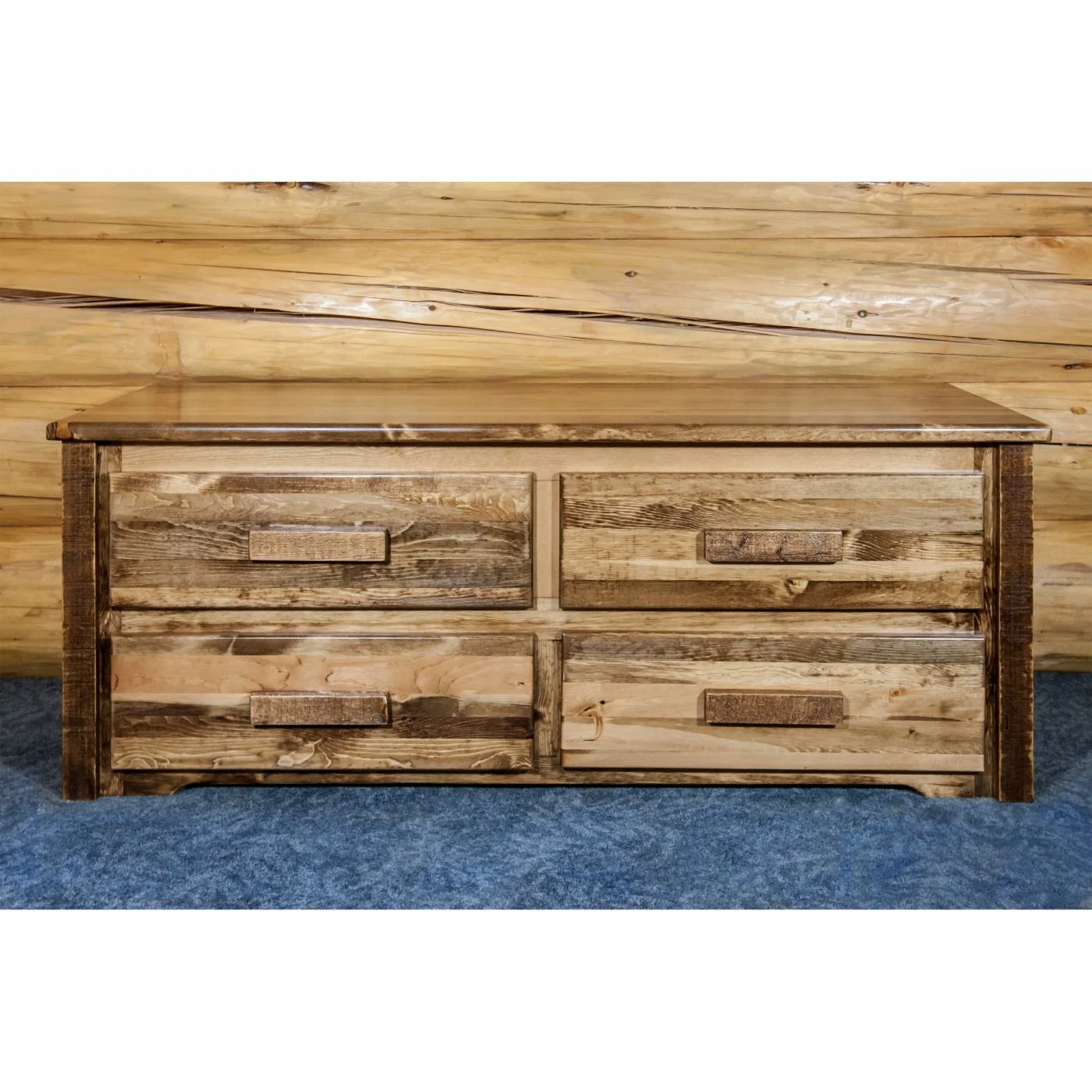 This Montana Woodworks Homestead 4 Drawer Sitting Chest combines functionality and an alluring motif. Fans of homestead-inspired design will love the pine wood construction. Equipped with four roomy drawers, the timbers and trim pieces incorporated in this chest are sawn square for a decidedly rustic look.