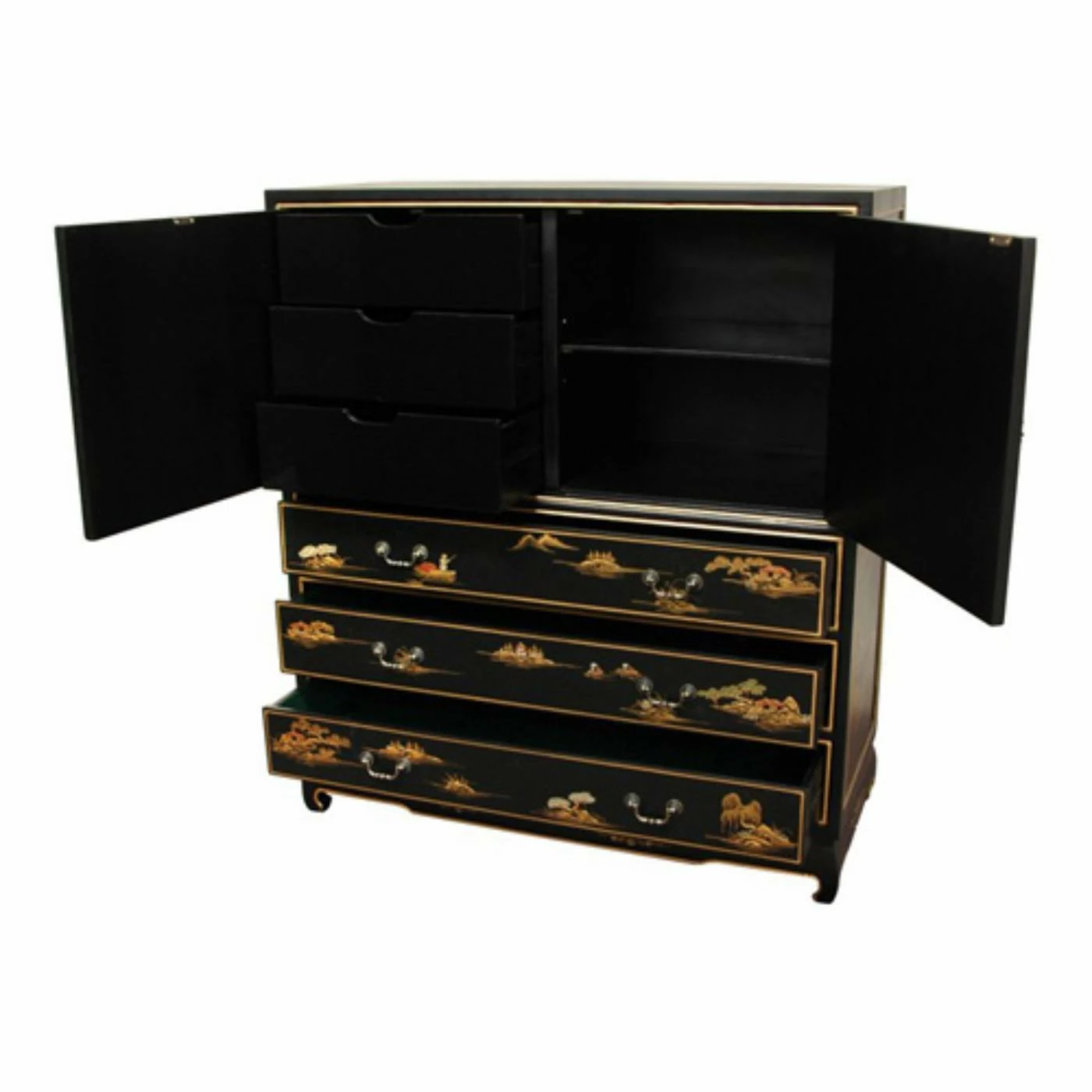 Whether holding your most elegant dishware in the dining room or neatly tucking away clothing in the bedroom, the Oriental Furniture Tall Black Lacquered Dresser adds drama, detail, and exceptional storage in any space. This expertly crafted dresser is made from sturdy elm wood and features a black lacquer finish and beautiful, hand-painted Asian-inspired ornamentation throughout. Three wide, spacious drawers offer exceptional storage, and two large doors on top open to reveal a removable shelf for additional storage that make this piece as hardworking as it is elegant.