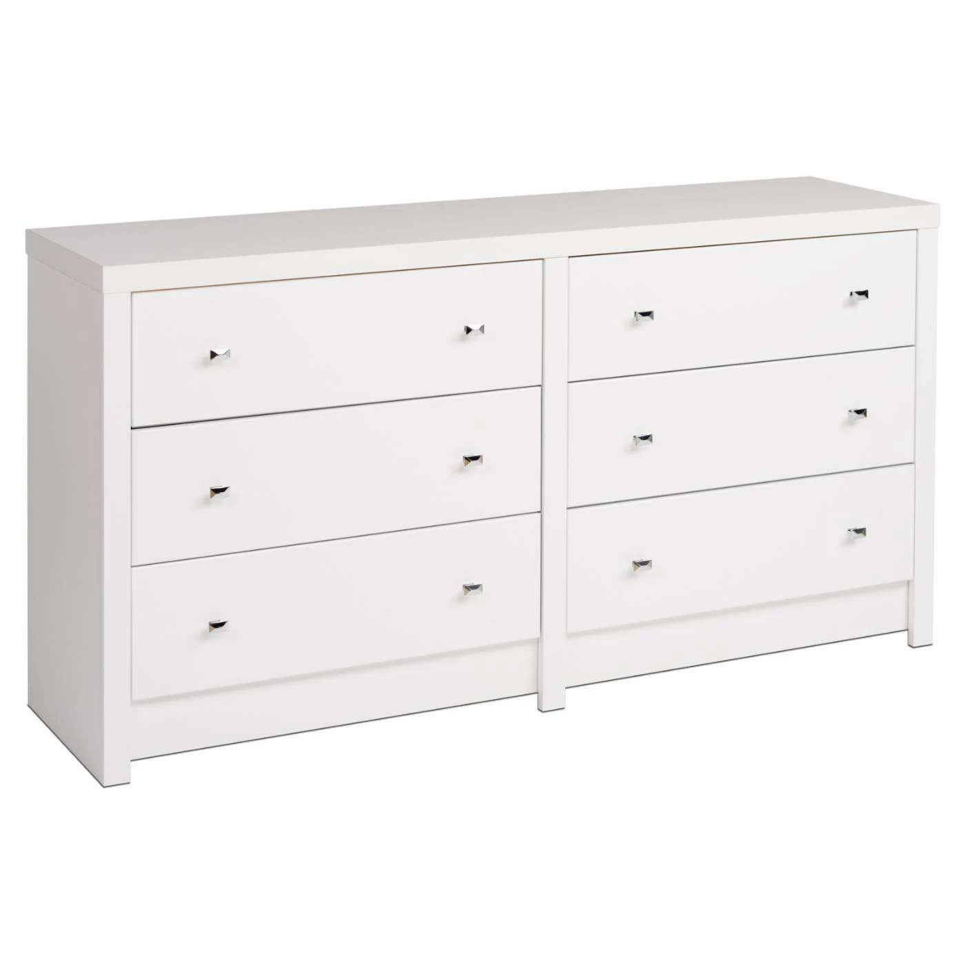 The Prepac Calla 6-Drawer Dresser – White was inspired by cosmopolitan design. Its bright white finish and diamond cut polished chrome drawer pulls create the look. More than just a pretty face, this dresser is crafted of CARB-compliant wood composite for extreme durability and includes six generous drawers that open on metal glides and have built-in safety stops. The top is perfect for display pieces.