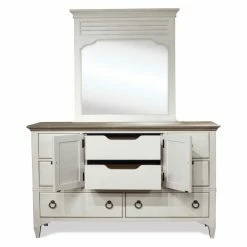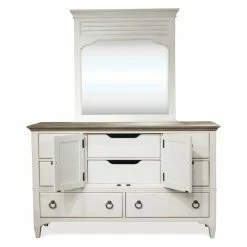 The Riverside Furniture Myra 6 Drawer 1 Door Dresser with Optional Mirror offers country cottage appeal. This dresser features six drawers with smooth closing guides and cedar-lined bottom drawers. Two louvered doors open to reveal additional drawers. This dresser is constructed of oak veneers and hardwood solids in your choice of available finishes. Add on the optional mirror to make the look complete.
