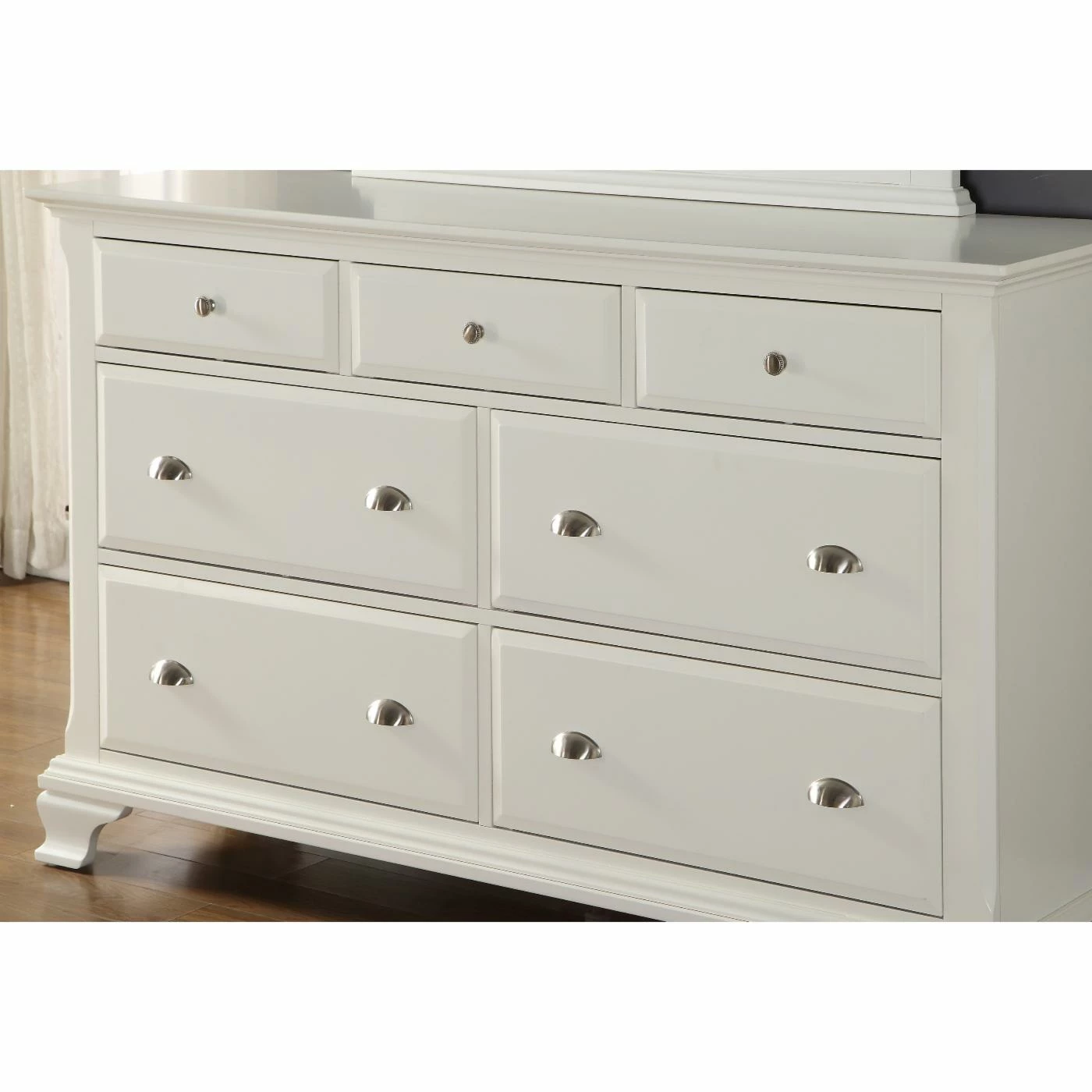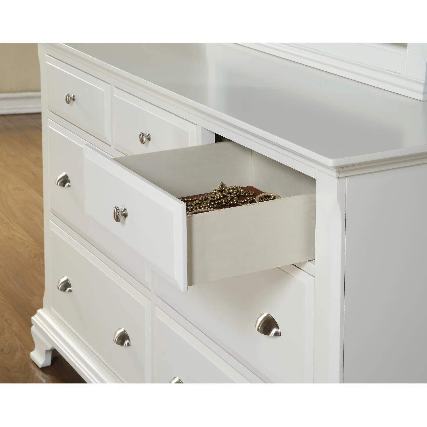 A pure white finish gives the Roundhill Furniture Laveno White Wood 7 Drawer Dresser a bright, cheerful quality. Inspired by timeless traditional furnishings, the dresser features molding along its top and bottom and rests on stately S-shaped feet. Four half-width and three top drawers provide versatile storage possibilities.