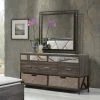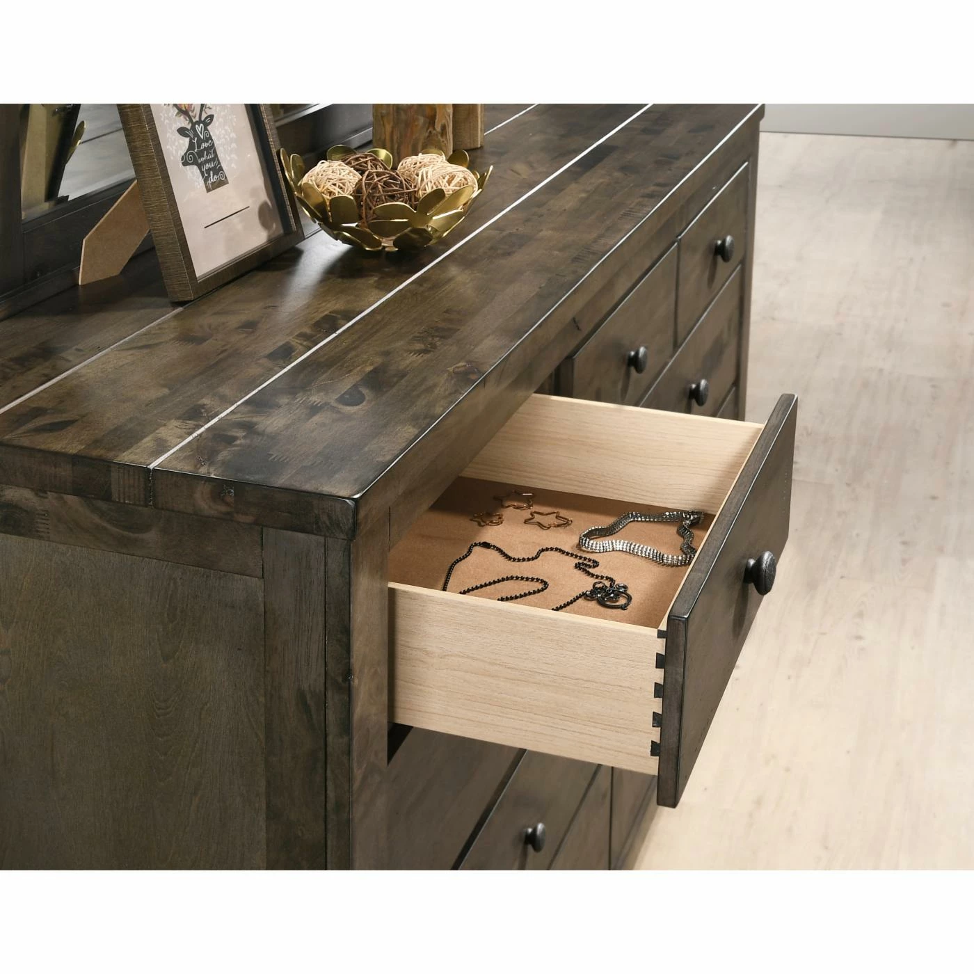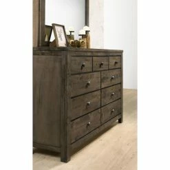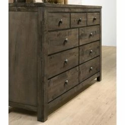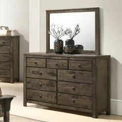 Ensure you have plenty of storage space in your rustic-modern bedroom with the Roundhill Furniture Pavita 9 Drawer Dresser with Optional Mirror. Nine roomy drawers in this dresser operate on premium guides to offer years of service. The rugged look comes from solid hardwood construction, simple lines, and a multi-step weathered walnut finish. Its optional mirror has a simple design, matching finish, and attaches securely to the back of this dresser.