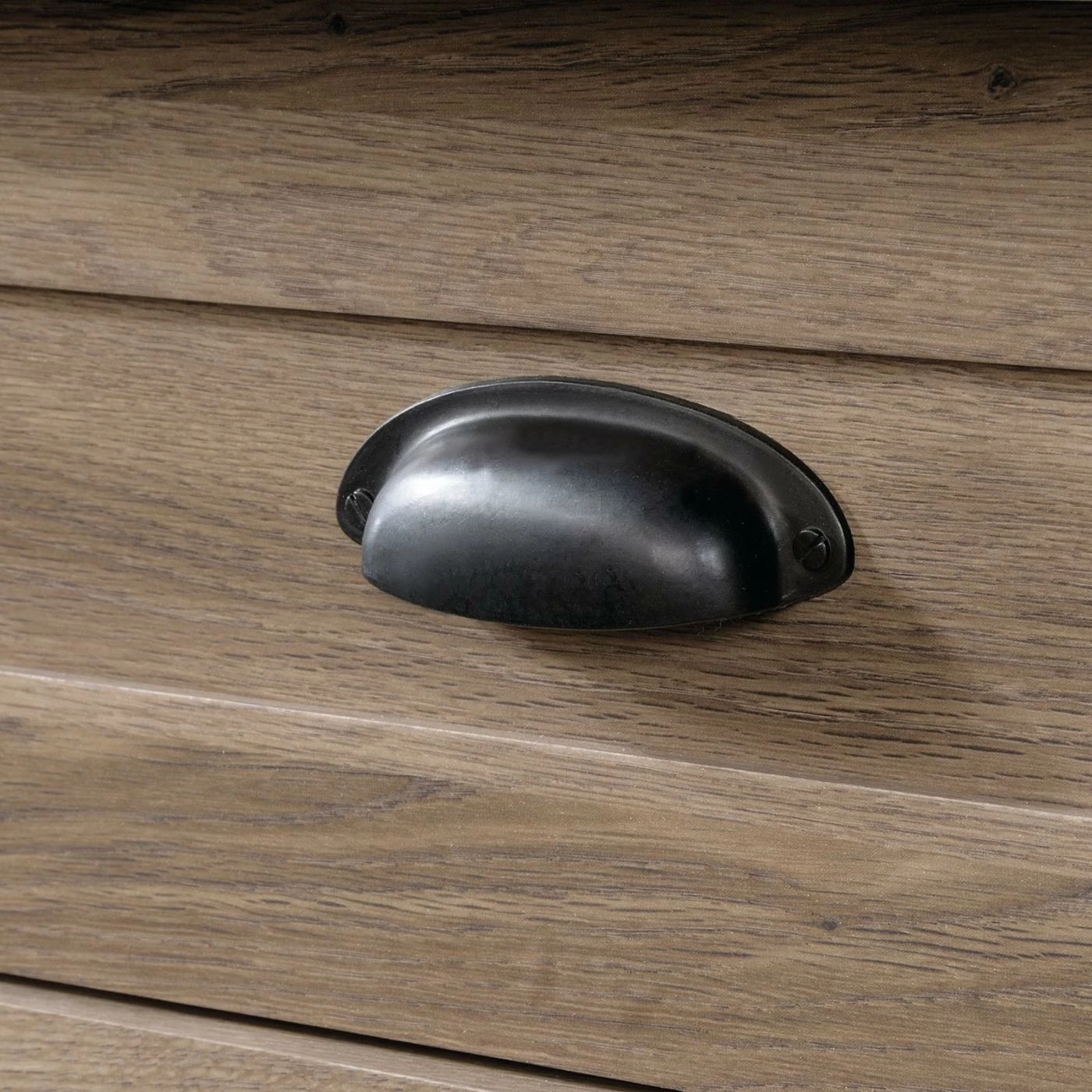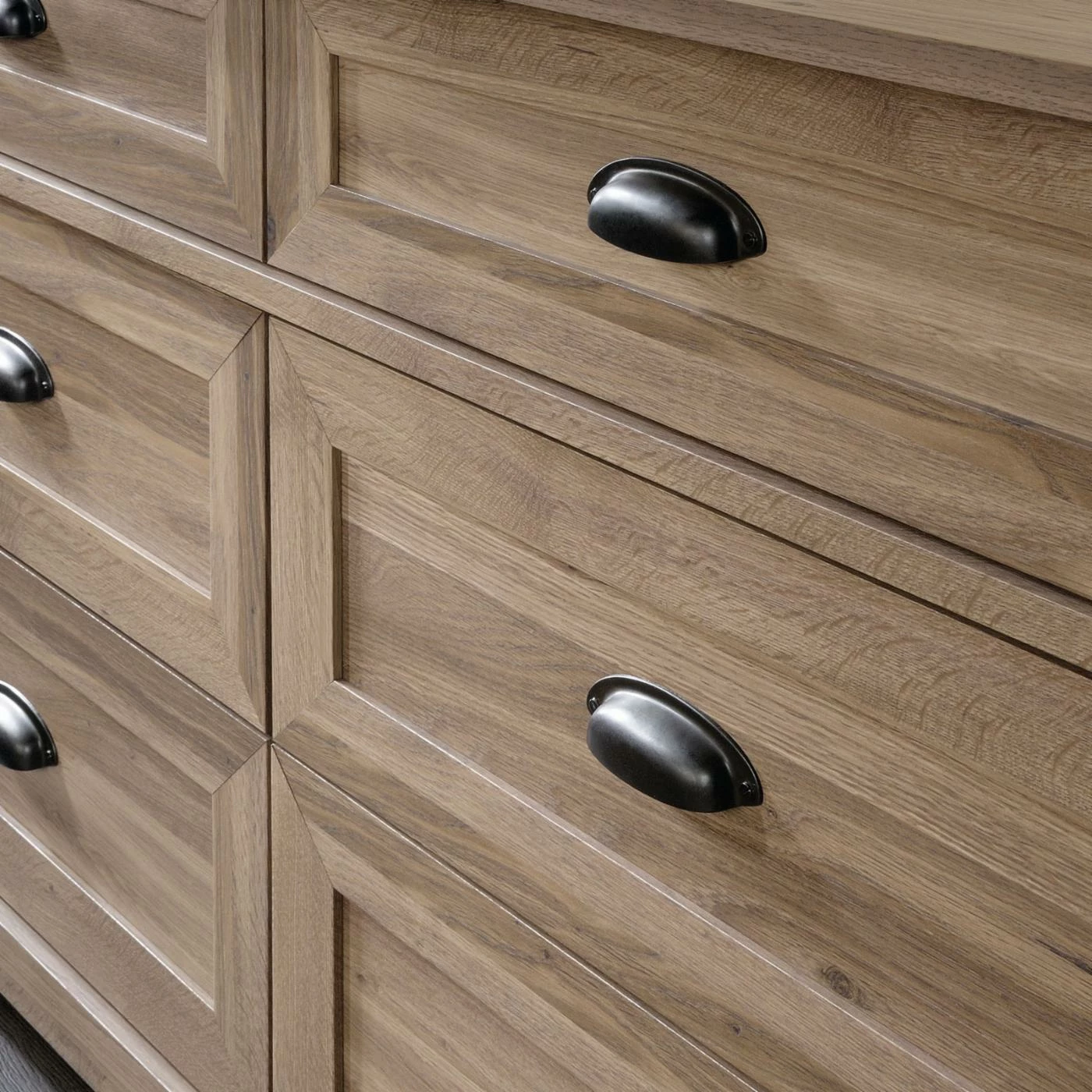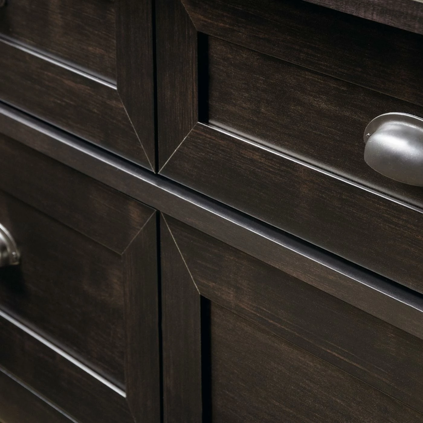 Add farm-fresh style to your bedroom dรฉcor (not to mention ample clothing storage) with the Sauder County Line 6 Drawer Dresser. Country charm abounds on this six-drawer dresser, from framed drawer fronts to classic cup pulls with a wonderful vintage-inspired appeal. The dresser is crafted of engineered wood in a range of available finish options. Metal drawer runners and safety stops provide easy gliding, and the four lower drawers are extra-deep for added storage space. With Sauder’s easy-to-use patented T-slot assembly system.