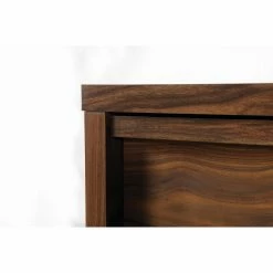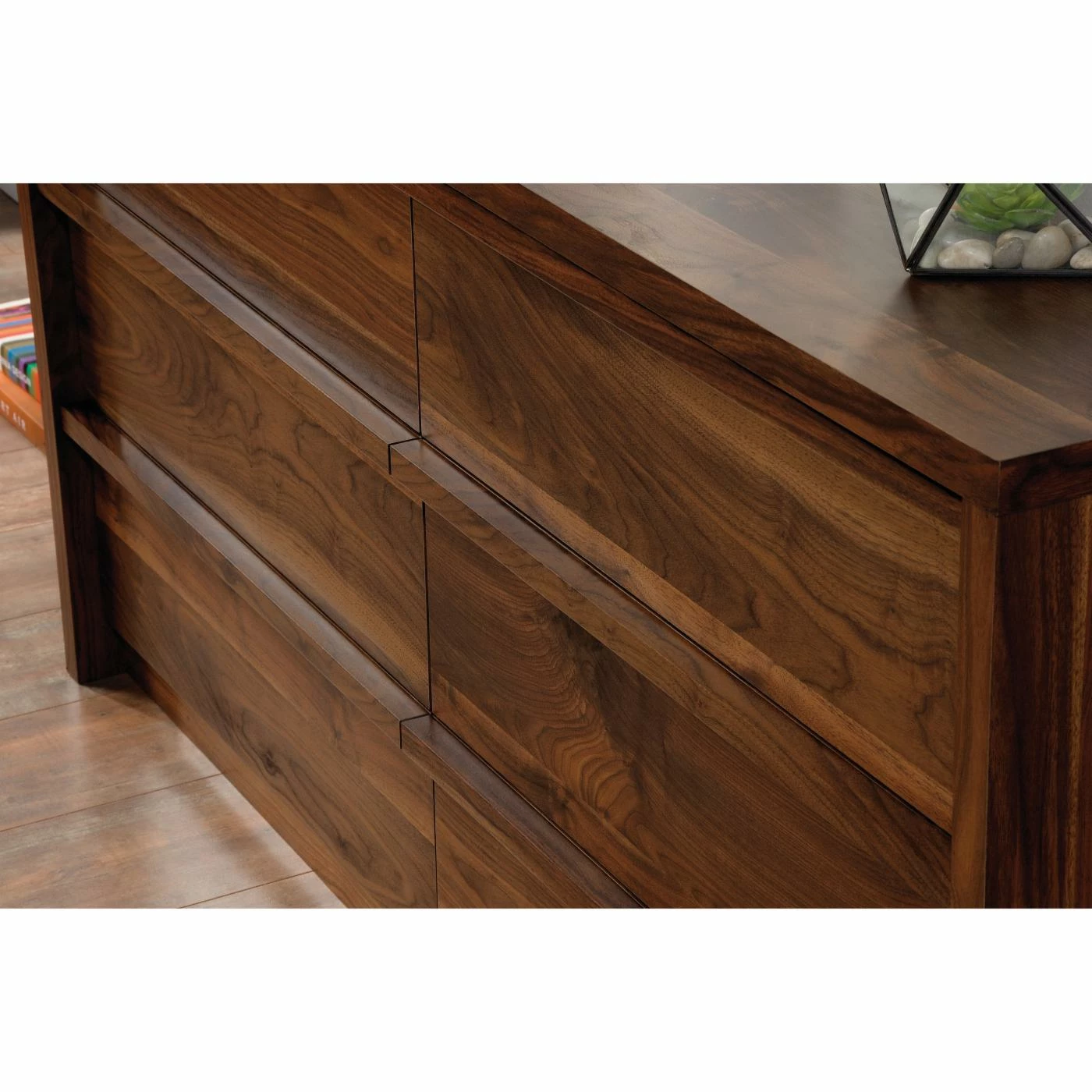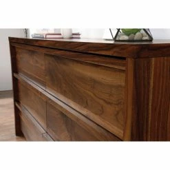 Tuck away your wardrobe in minimalist style with the Sauder Harvey Park 6 Drawer Dresser. This handsome dresser is constructed from engineered wood and comes in a warm grand walnut finish that complements any style dΓ©cor. It has six spacious drawers that neatly tuck away clothing, linens, and more, and they slide out effortlessly on metal runners with safety stops. This sleek dresser has clean lines and a transitional design, meaning it will fit perfectly in any style space, from traditional to contemporary.